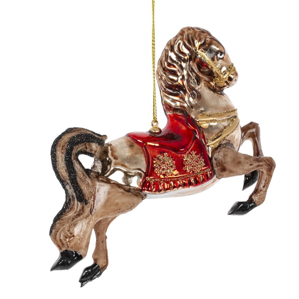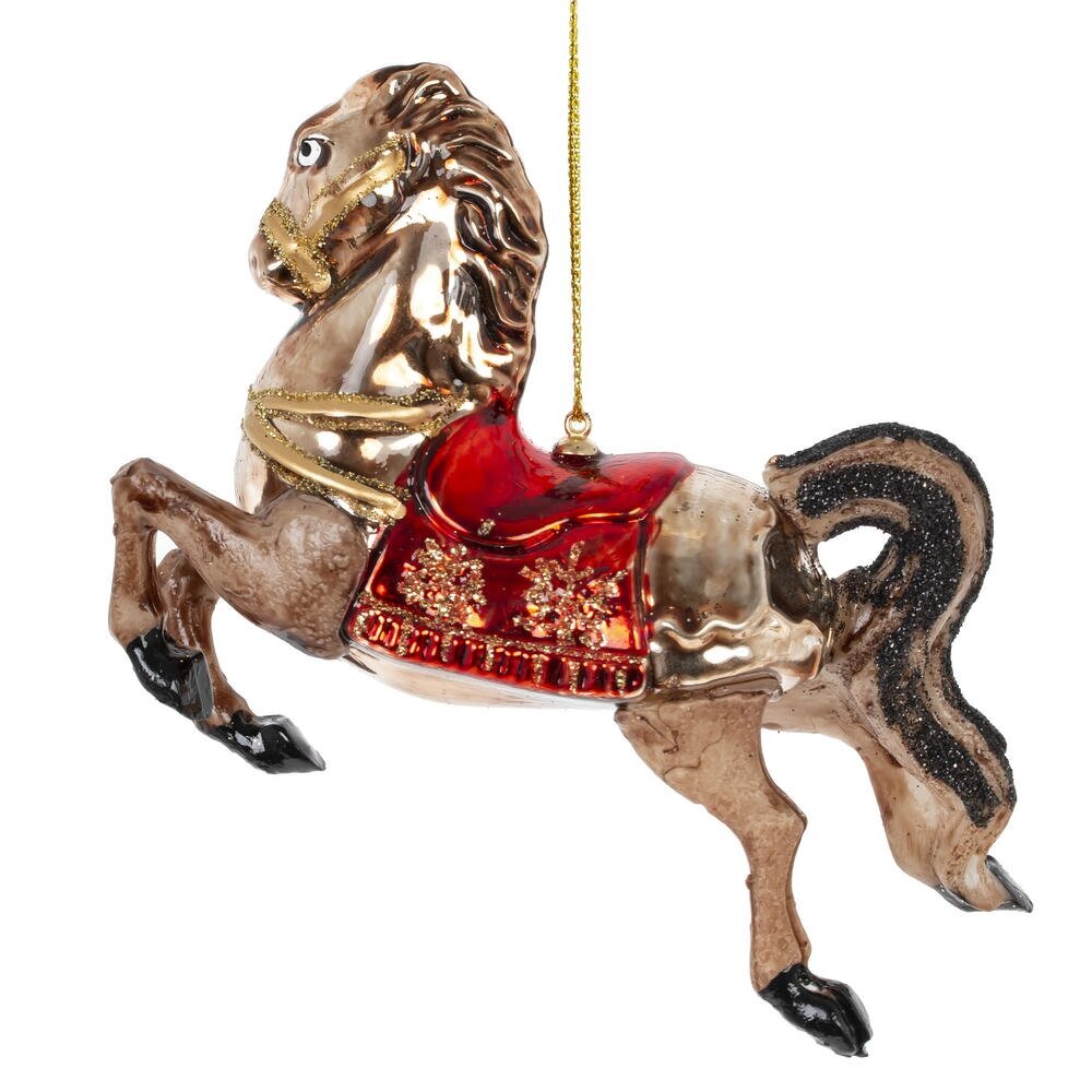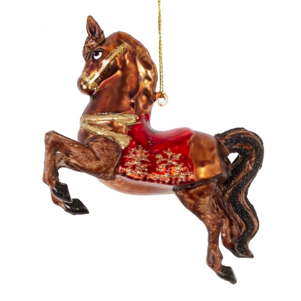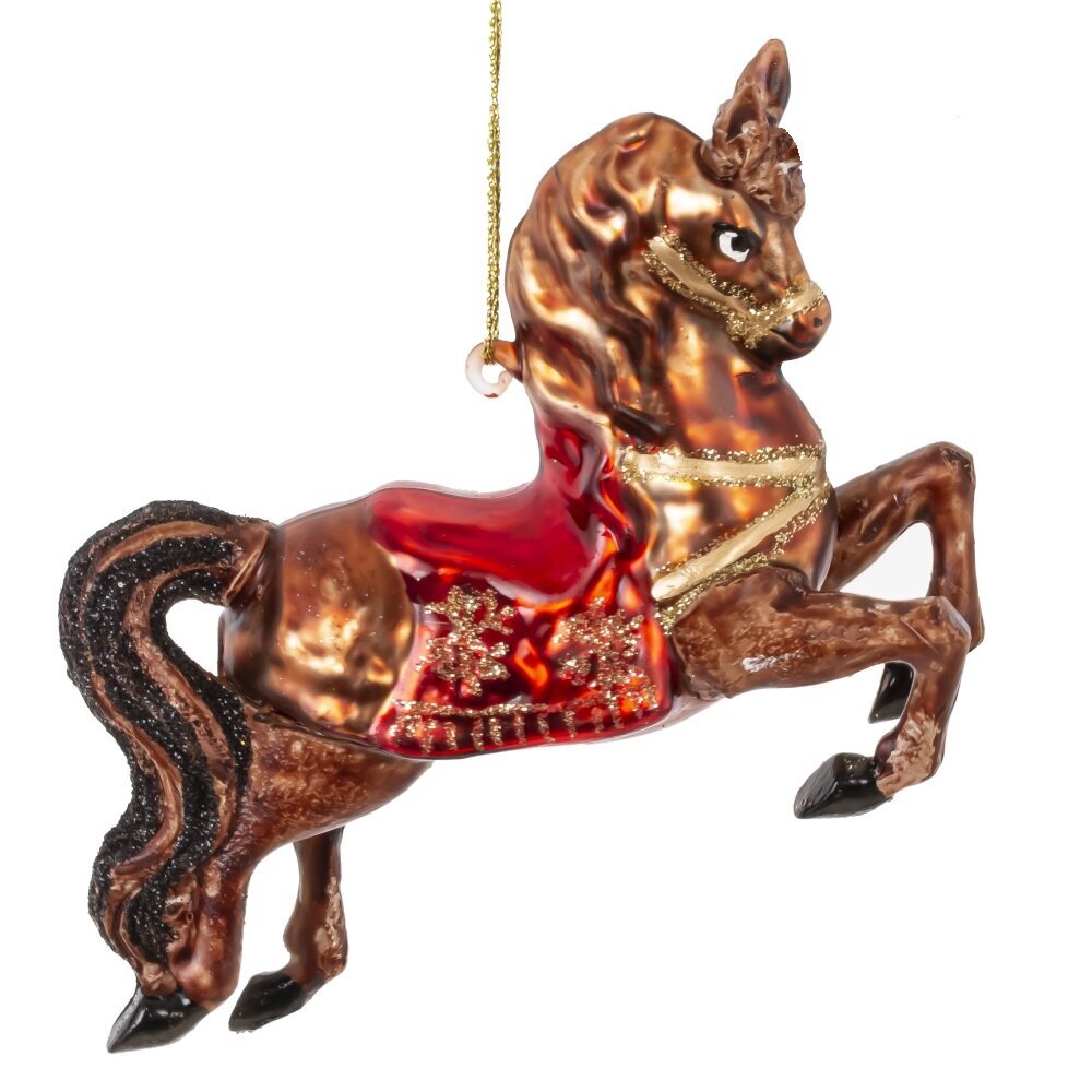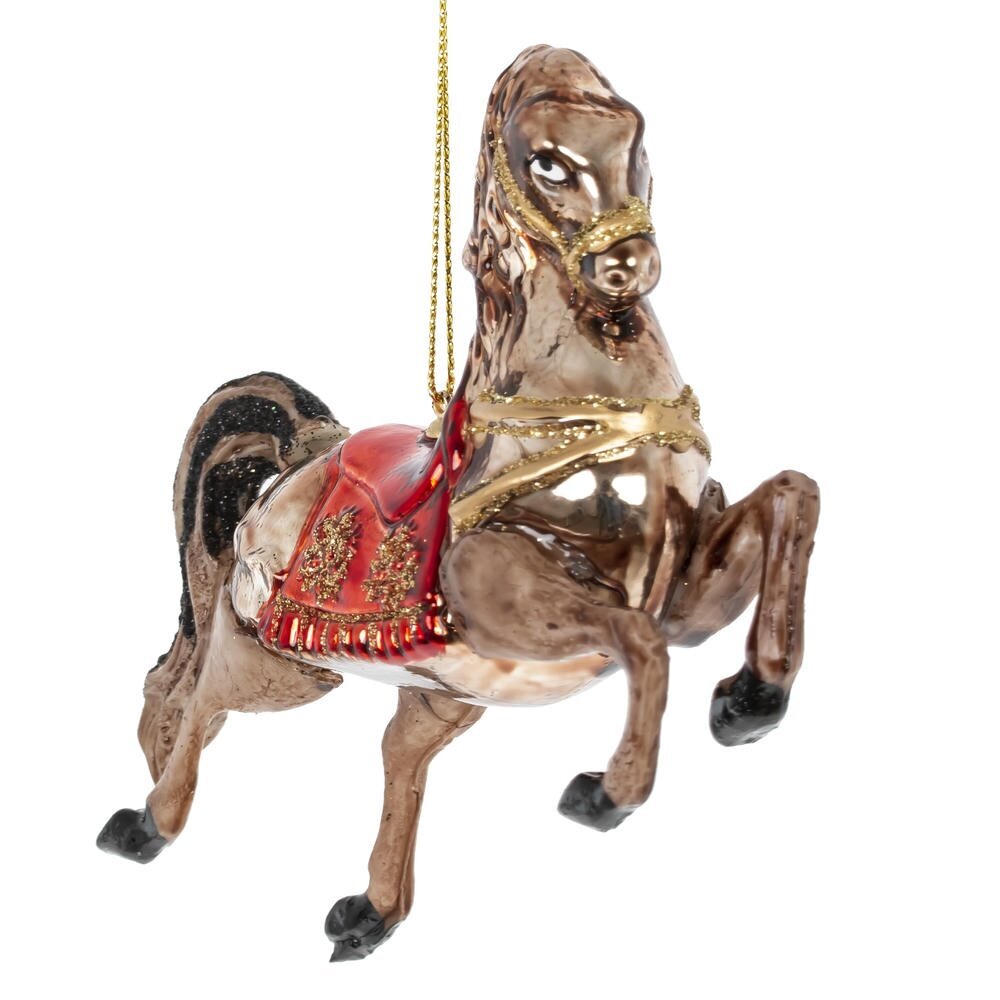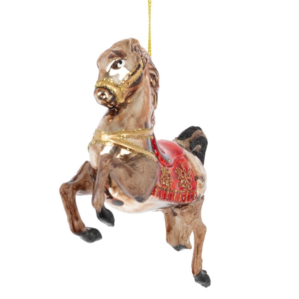 Елочное украшение из стекла в виде лошади — изящный и элегантный элемент праздничного декора. Тонкая проработка деталей, блестящая поверхность и утончённый силуэт придают изделию особый шарм. Такое украшение станет красивым акцентом на новогодней ёлке и добавит в интерьер нотку грации и волшебства.