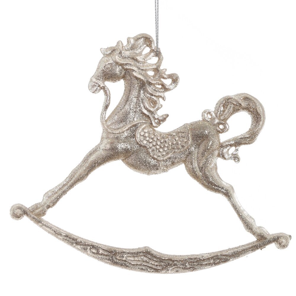 Декоративное подвесное изделие "Лошадка" — это элегантное новогоднее украшение из полиакрила, украшенное светло-золотым глиттером. Легкая и изящная лошадка-качалка добавит волшебства и праздничного настроения вашему интерьеру. Это украшение станет прекрасным акцентом на рождественской елке или в вашем декоре.