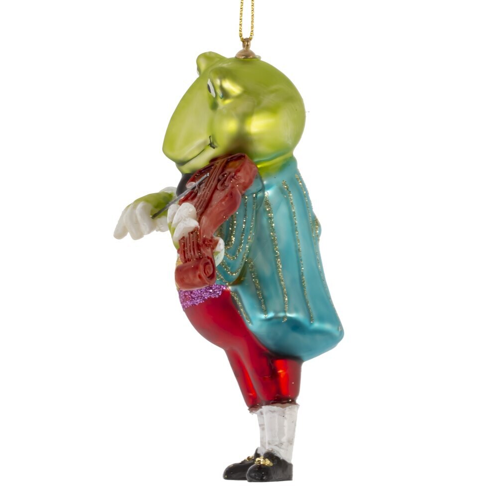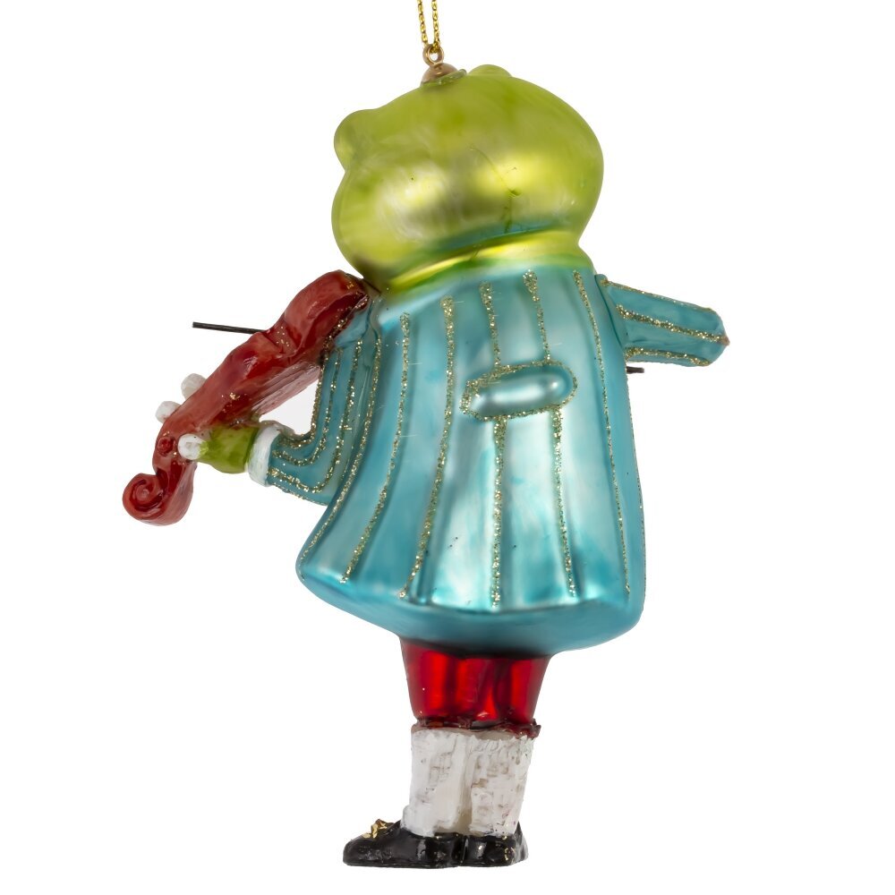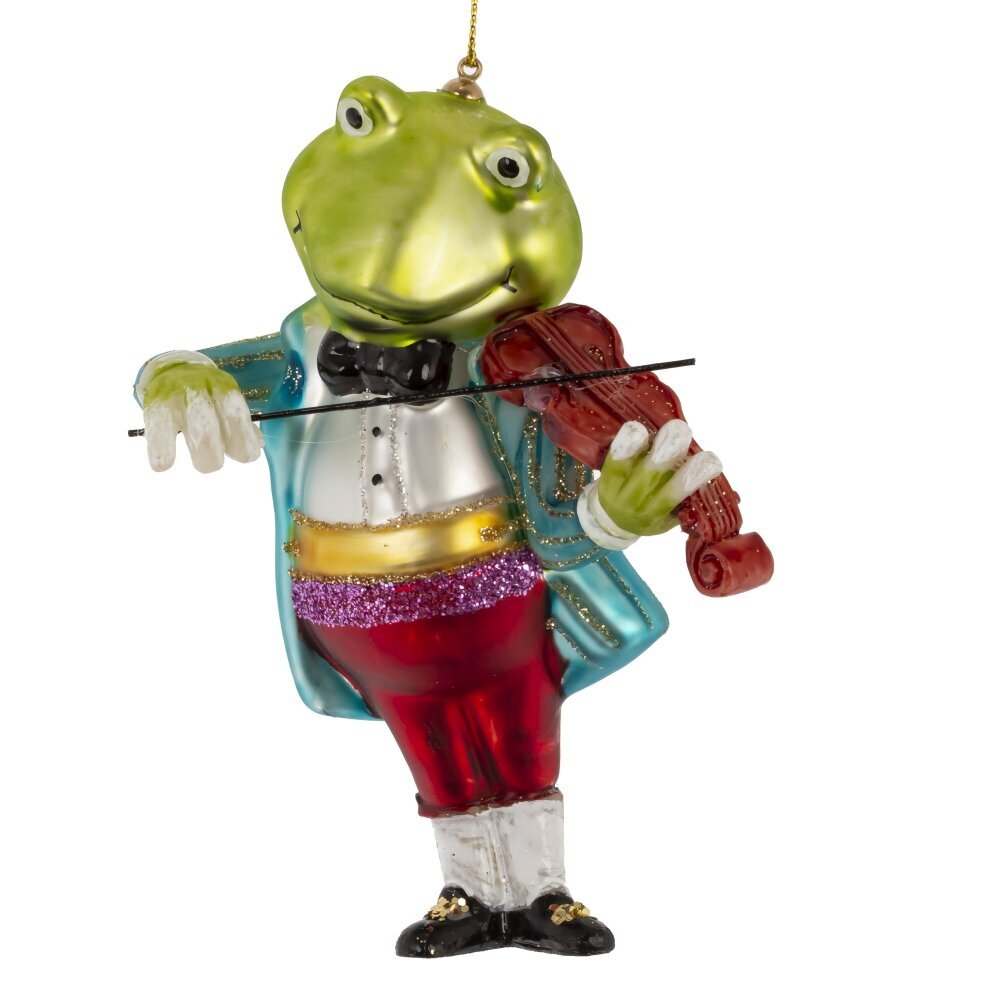 Очаровательное елочное украшение из стекла — лягушка-скрипач — подарит вашей ёлке нотки волшебства и музыкального настроения. Фигурка выполнена с тонкой детализацией: лягушка нежно держит скрипку, а её яркие цвета и мерцающий шиммер создают праздничный блеск и живость образа. Ручная роспись придаёт игрушке неповторимый характер и изящество. Это украшение станет оригинальным акцентом праздничного декора, наполняя дом теплом, радостью и чарующей атмосферой зимней сказки. Идеальный выбор для тех, кто любит музыку и необычные детали в новогоднем интерьере.