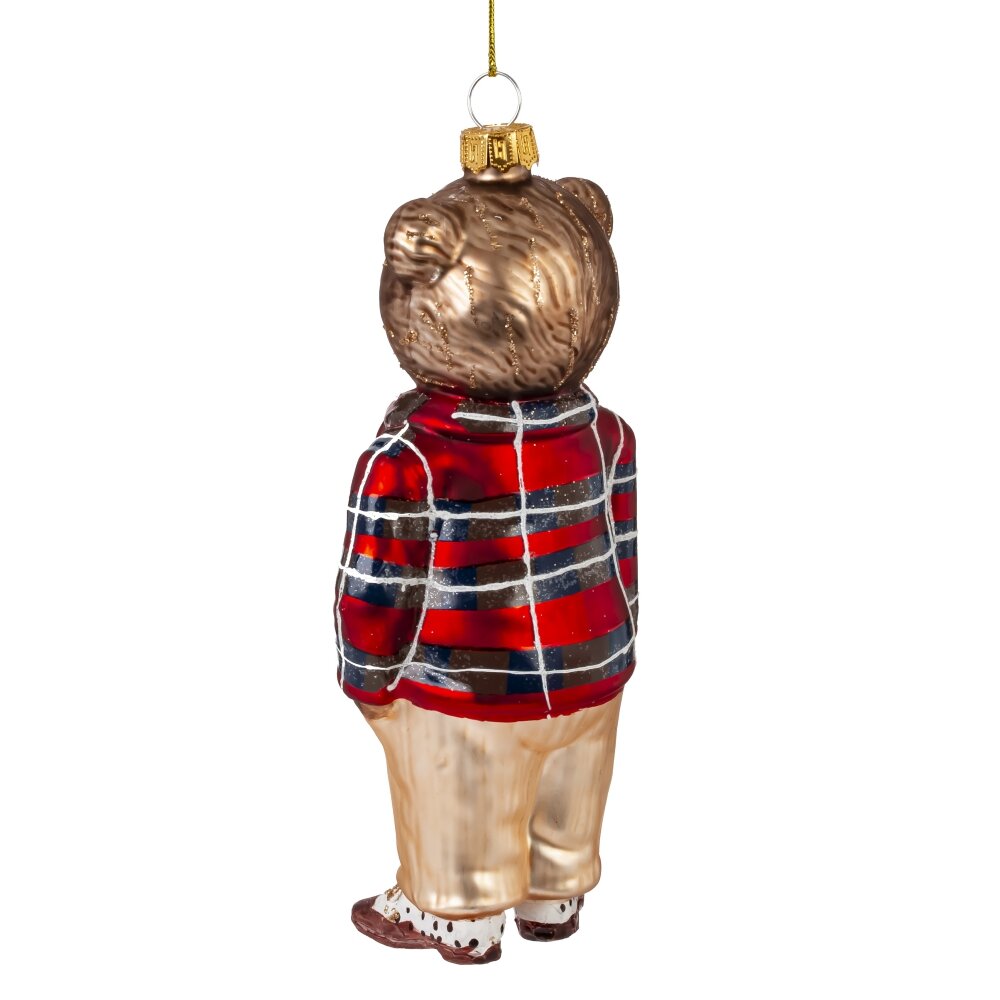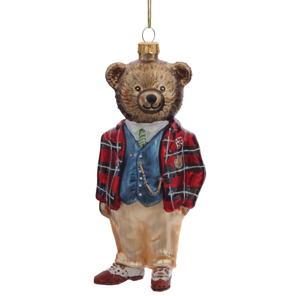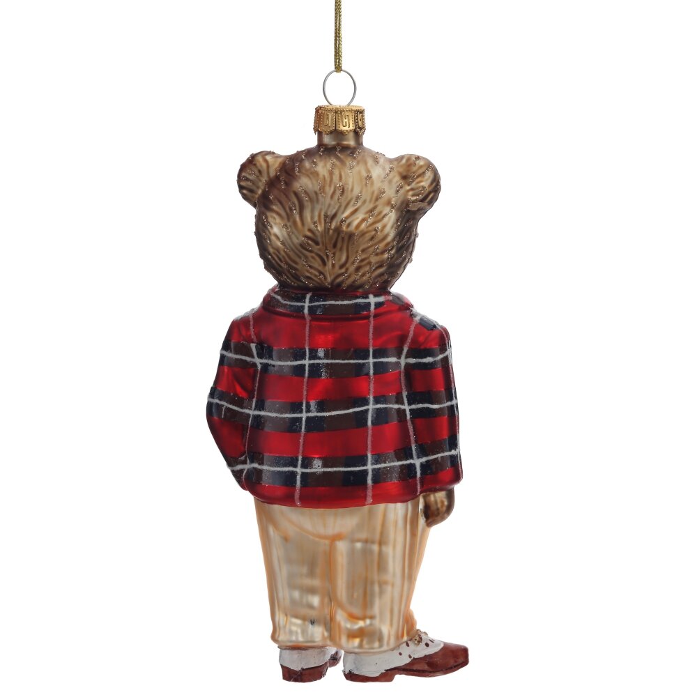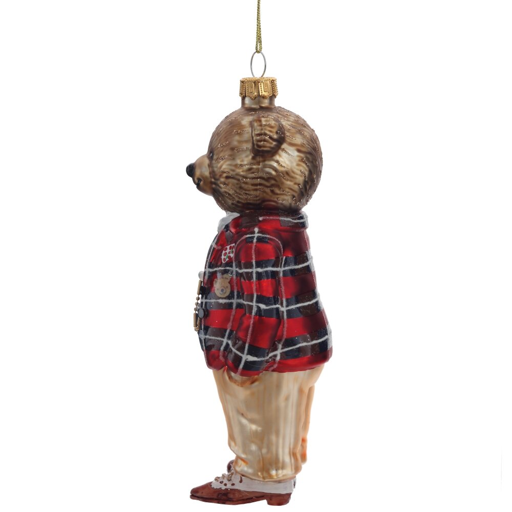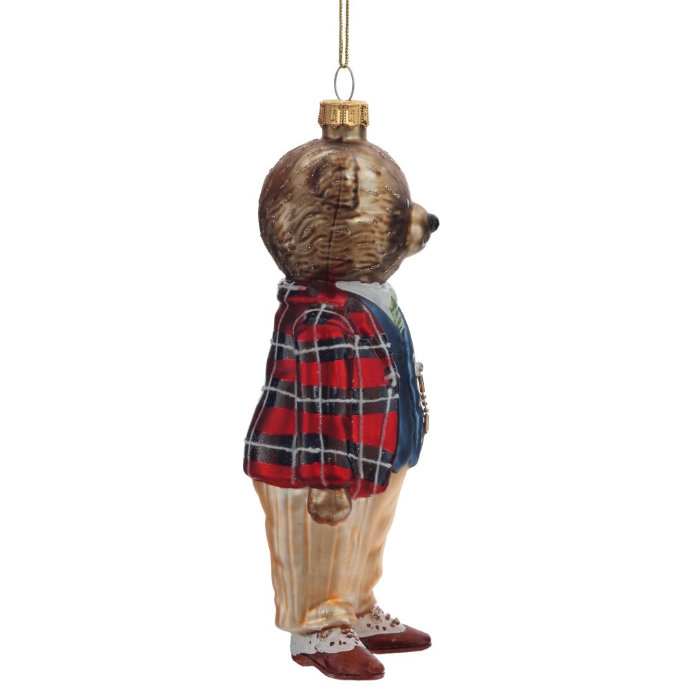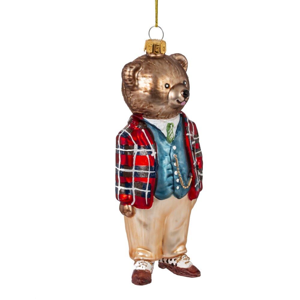 Елочное украшение из стекла в виде медвежонка в клетчатом пиджаке — это утончённый и одновременно трогательный элемент новогоднего декора. Медвежонок выполнен с высокой степенью детализации: его милая мордочка, аккуратные ушки и выразительные глазки придают игрушке живость и очарование. Особое внимание привлекает клетчатый пиджак — он добавляет игрушке элегантности и стиля, делая её похожей на маленького джентльмена. Стеклянная поверхность украшения сияет в свете гирлянд, придавая ёлке праздничный блеск. Эта игрушка станет изысканным акцентом на новогодней ёлке и прекрасным подарком для коллекционеров.