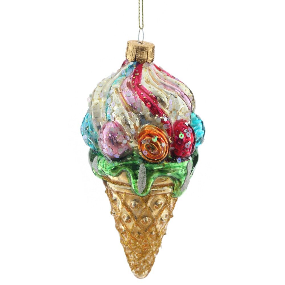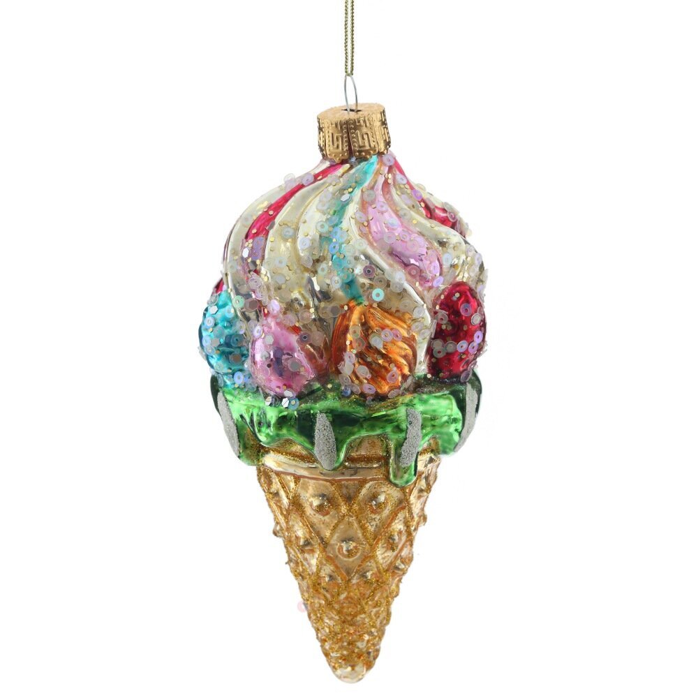 Стеклянная игрушка в форме рожка мороженого в ярких красках с пайетками и золотым глиттером. Излучает веселое и праздничное настроение, поднимая настроение и добавляя блеска на елке. Привлекательный и аппетитный вид сделают это украшение ярким акцентом на елке. Порадуйте себя и своих близких этим невероятно красивым украшением.