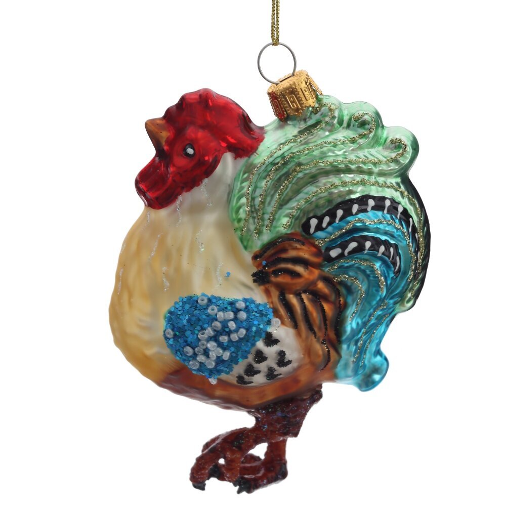 Елочное украшение из стекла в виде петуха — это яркий и символичный элемент новогоднего убранства, олицетворяющий бодрость, пробуждение и защиту домашнего уюта. Фигурка выполнена вручную из тончайшего стекла и покрыта насыщенными красочными эмалями: перья переливаются красным, золотым, синим и зелёным оттенками, создавая ощущение живого пёстрого оперения. Хвост украшен блёстками и изящными узорами, добавляющими праздничного блеска. Петух гордо поднял голову, его гребень и клюв детализированы с особой точностью. Такое украшение станет эффектным акцентом на ёлке, особенно в интерьере в деревенском, этническом или ретро-стиле. Кроме эстетической красоты, петух символизирует доброе начало, бодрость духа и защиту дома, что делает его особенно уместным в новогоднюю ночь.