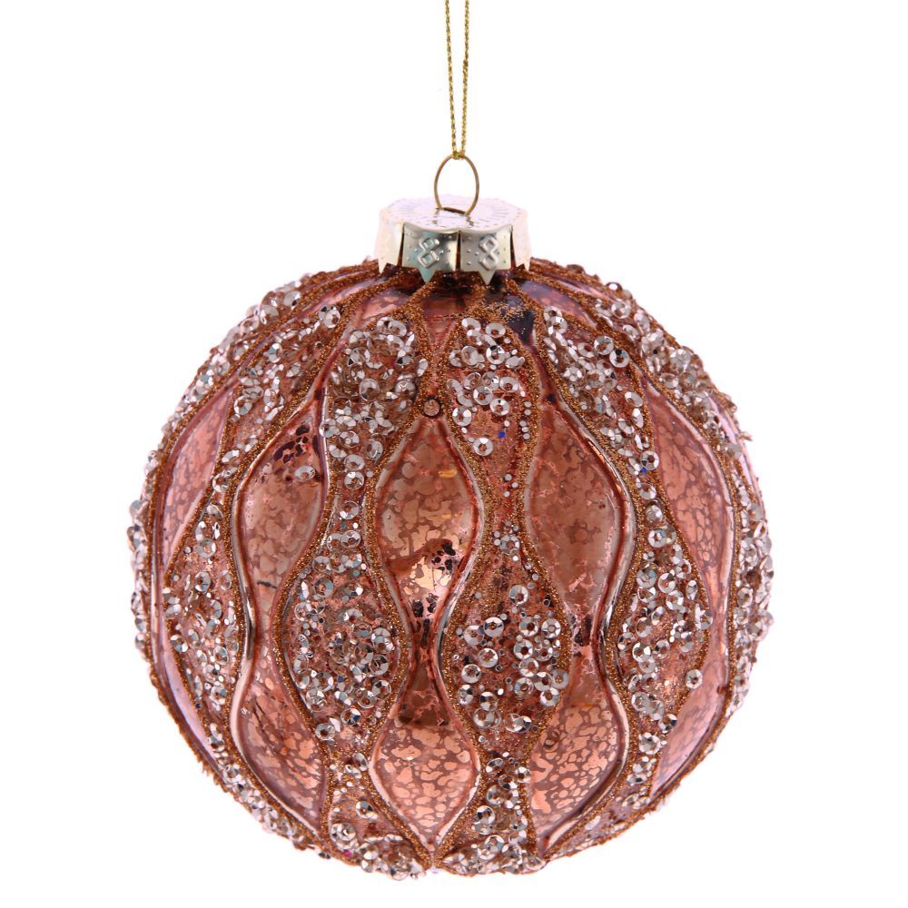 Стеклянный шар выполнен в традиционном праздничном стиле. Глянцевая поверхность и изящные узоры придают этому шару особую изысканность.