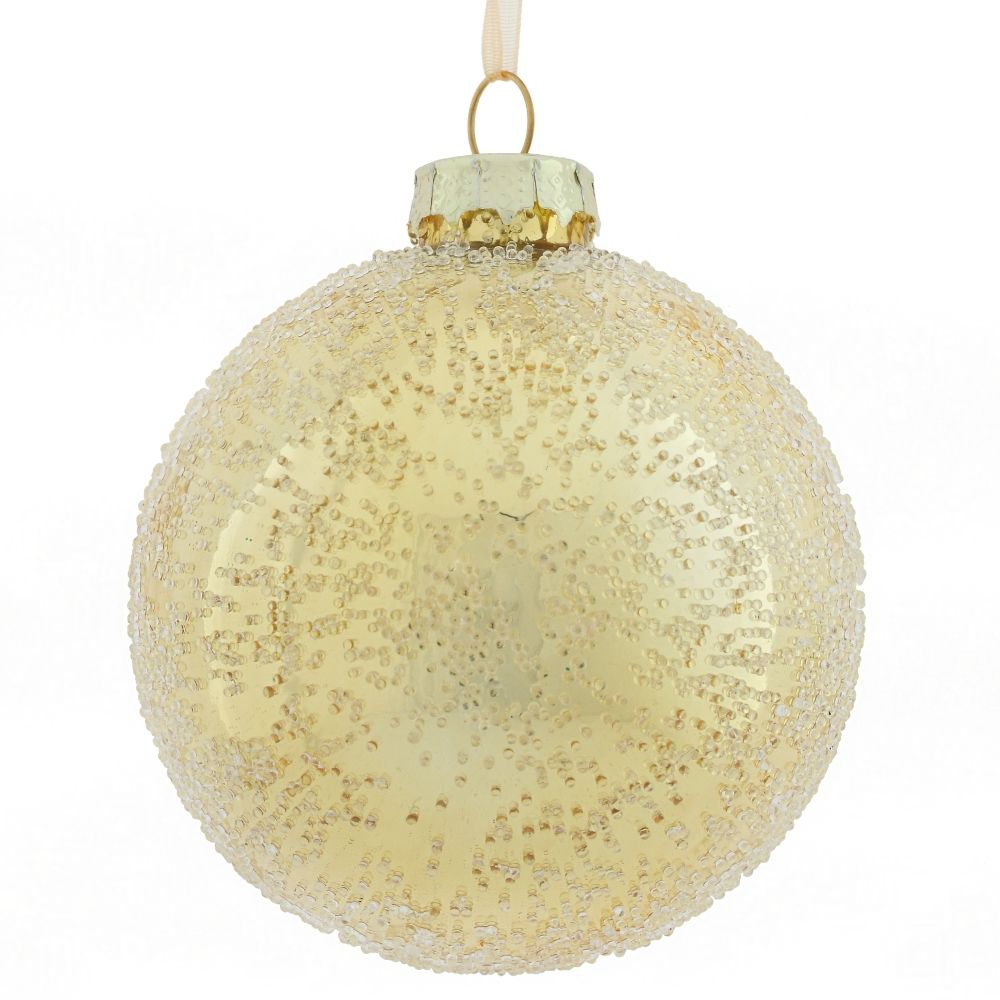 Стеклянный шар с потрясающей фактурой в виде россыпи капель. Это новогоднее украшение непременно порадует вас своим изяществом и прекрасно дополнит праздничный наряд лесной красавицы.
