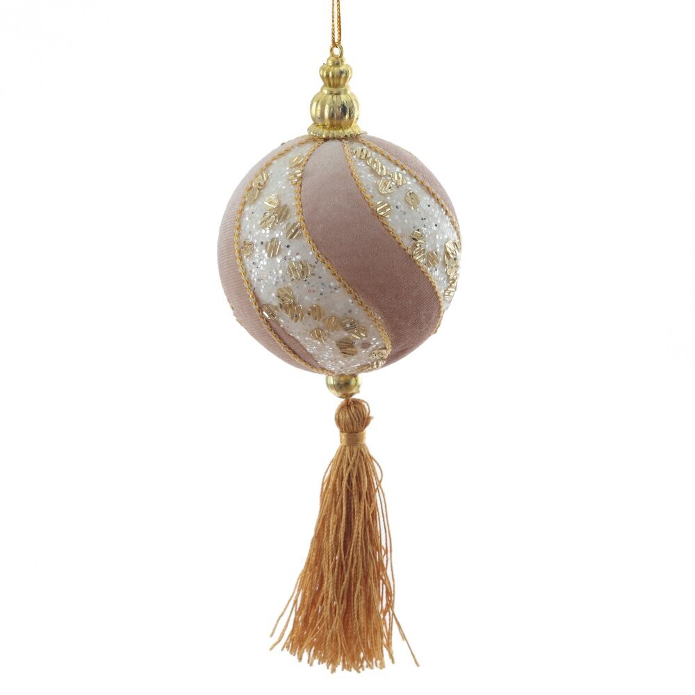 Новогоднее украшение "Шар" - это изящный декор для праздничной атмосферы. Шар выполнен из пенопласта, обтянутого нежным бархатным текстилем. Розовые спиральные полосы чередуются с цветом шампань, расшитым золотыми пайетками, что придает шару изысканный и праздничный вид. Нижняя часть шара дополнена роскошной кисточкой. Это украшение станет прекрасным дополнением к новогоднему интерьеру, подчеркивая безупречный вкус хозяина дома!