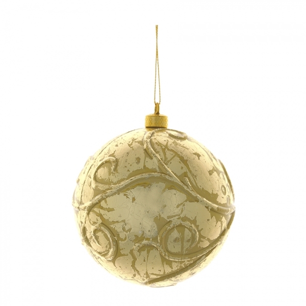 Новогодний оригинальнй золотой елочный шар в стиле винтаж с растительным узором, изготовлен из полимерных материалов, упаковка- пакет