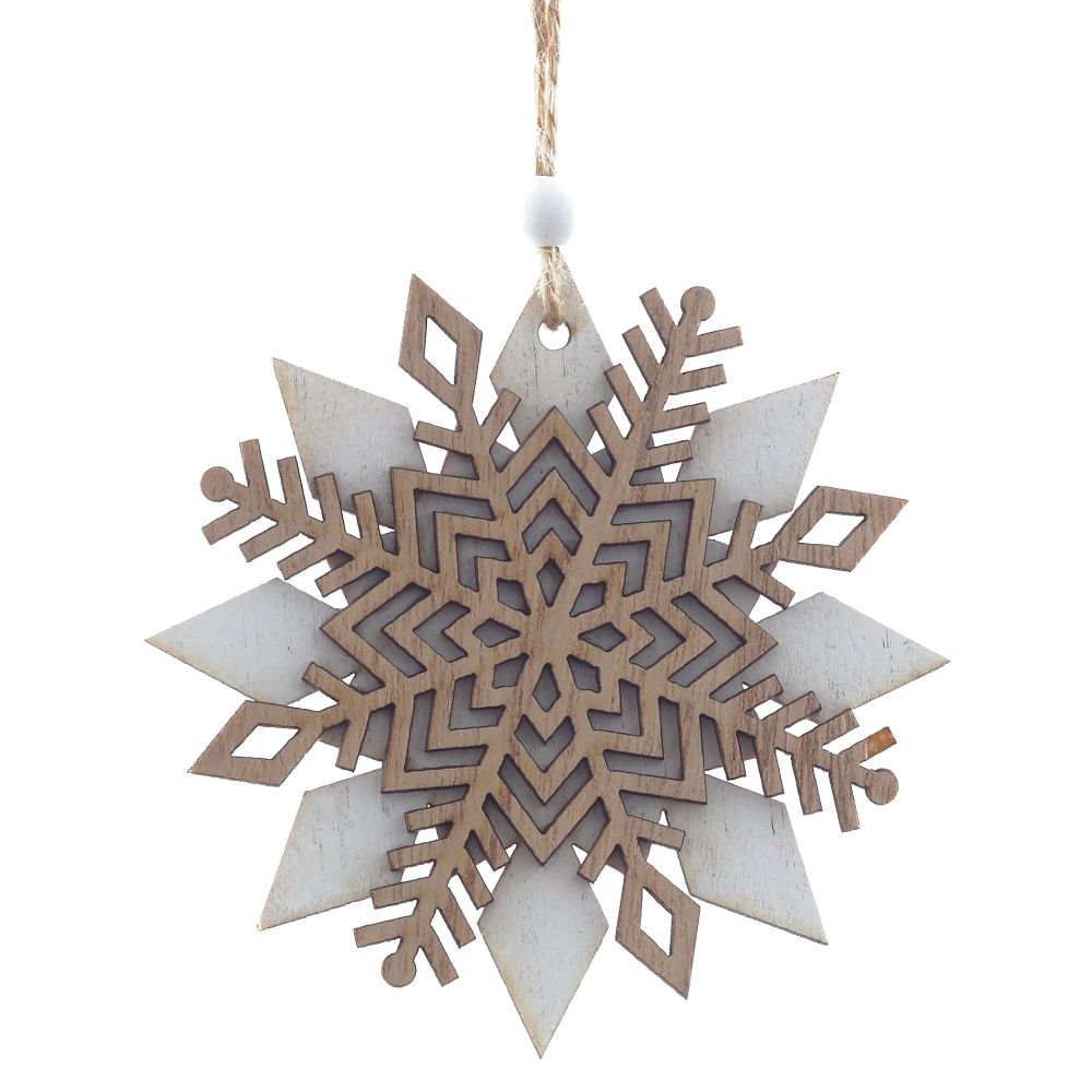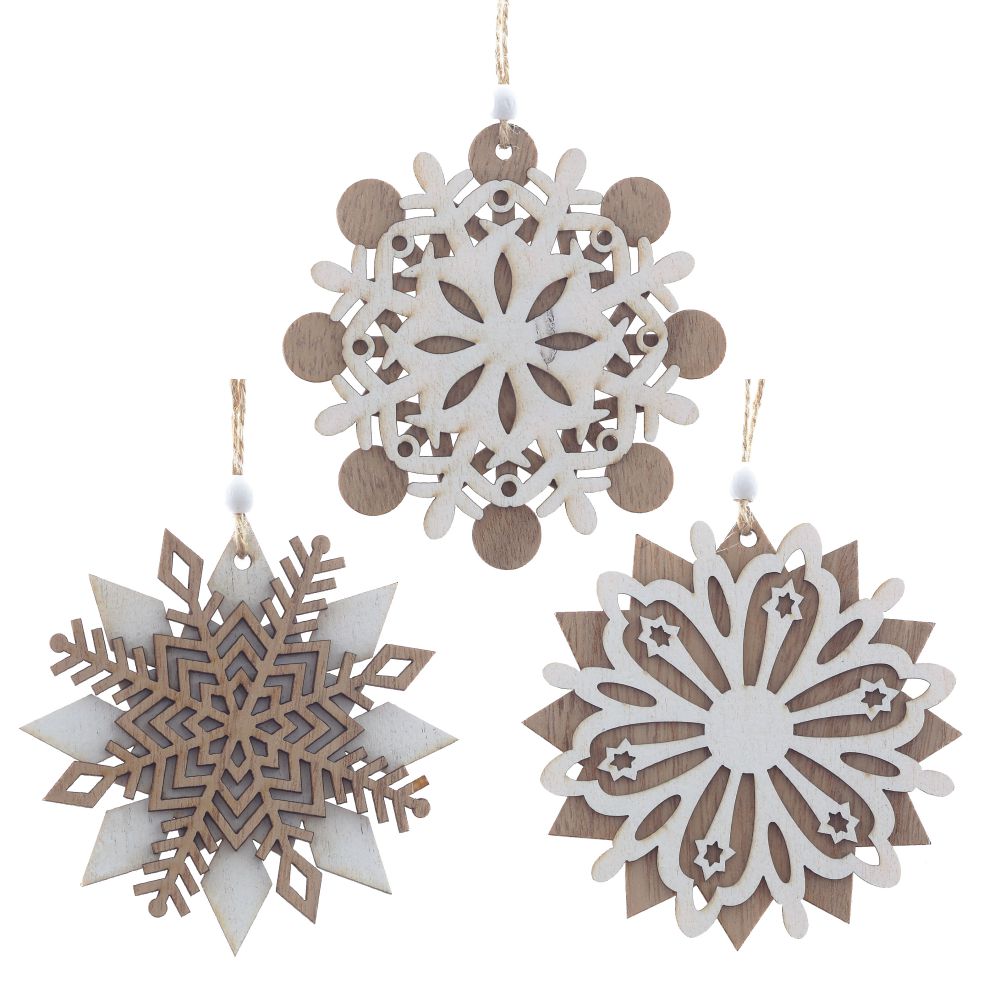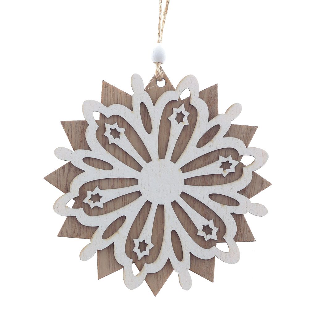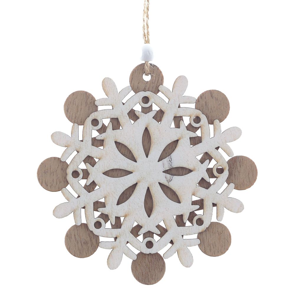 Новогодняя деревянная игрушка в форме снежинки внесет теплые нотки в убранство праздничной ели. Украшение представлено в трех вариантах.