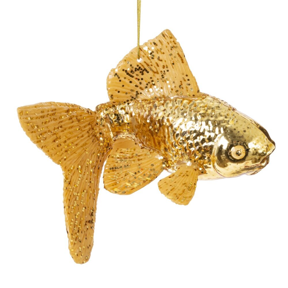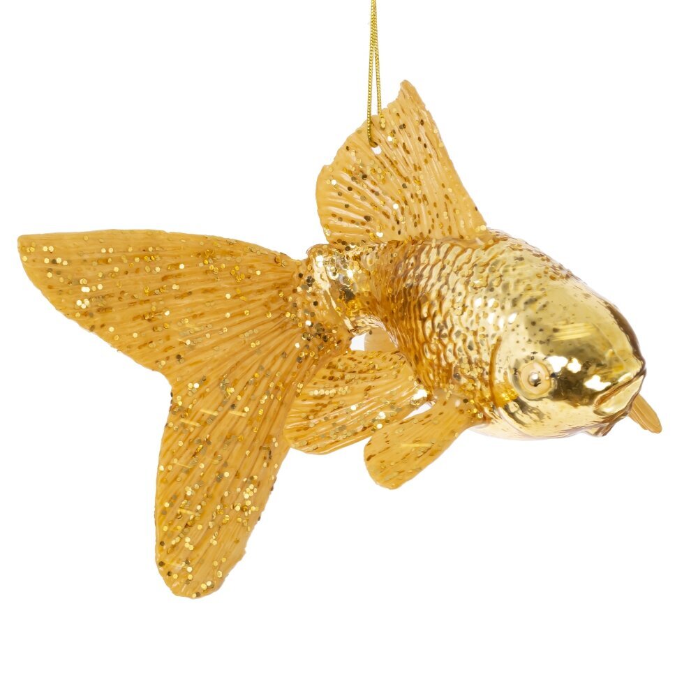 Ёлочное украшение в виде золотой рыбки выполнено из тонкого стекла с высоким качеством проработки деталей. Изящная форма, мерцающее золотое покрытие и блестящие акценты придают игрушке волшебный, сказочный вид. Такое украшение не только украсит новогоднюю ёлку, но и создаст особую атмосферу уюта и мечты, напоминая о сказке и исполнении желаний. Лёгкое и воздушное, оно прекрасно отражает свет гирлянд, наполняя пространство мягким сиянием. Золотая рыбка станет символом удачи и исполнения желаний, идеально вписываясь в праздничный интерьер.
