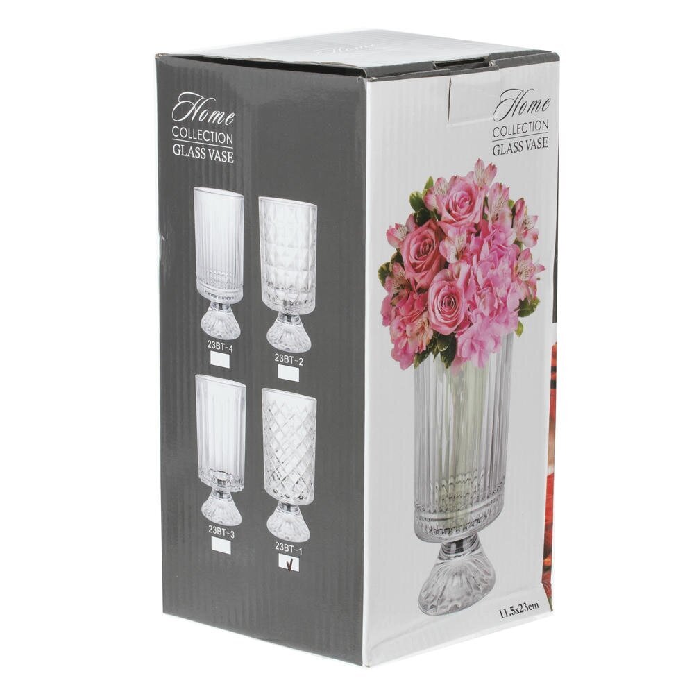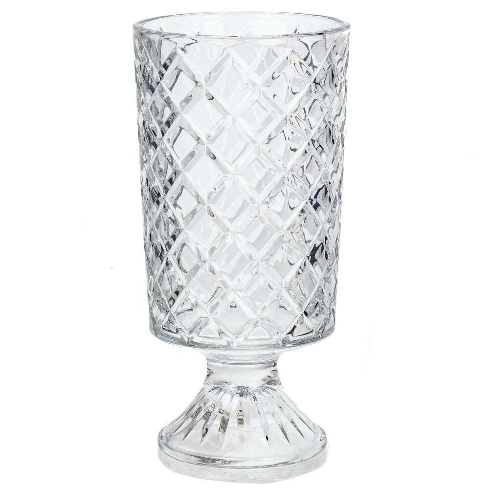 Стеклянная ваза объемом 1000 мл с рельефным ромбовидным узором. Прозрачные стенки красиво преломляют свет, создавая эффект граненого хрусталя. Высокая цилиндрическая чаша стоит на изящной ножке с широким устойчивым основанием. Такая форма подчеркивает линии букетов и экономит место на столе, подоконнике или консоли. Подходит для свежих цветов, веток, сухоцветов, а также в качестве декоративной емкости для свечей или сезонных композиций. Гладкий край безопасен, толщина стекла добавляет надежности, изделие легко поддерживать в чистоте. Универсальный прозрачный цвет гармонично впишется как в классический, так и в современный интерьер. Емкость 1 л — удобный формат для повседневного использования и праздничной сервировки. Диаметр горловины: 10 см.