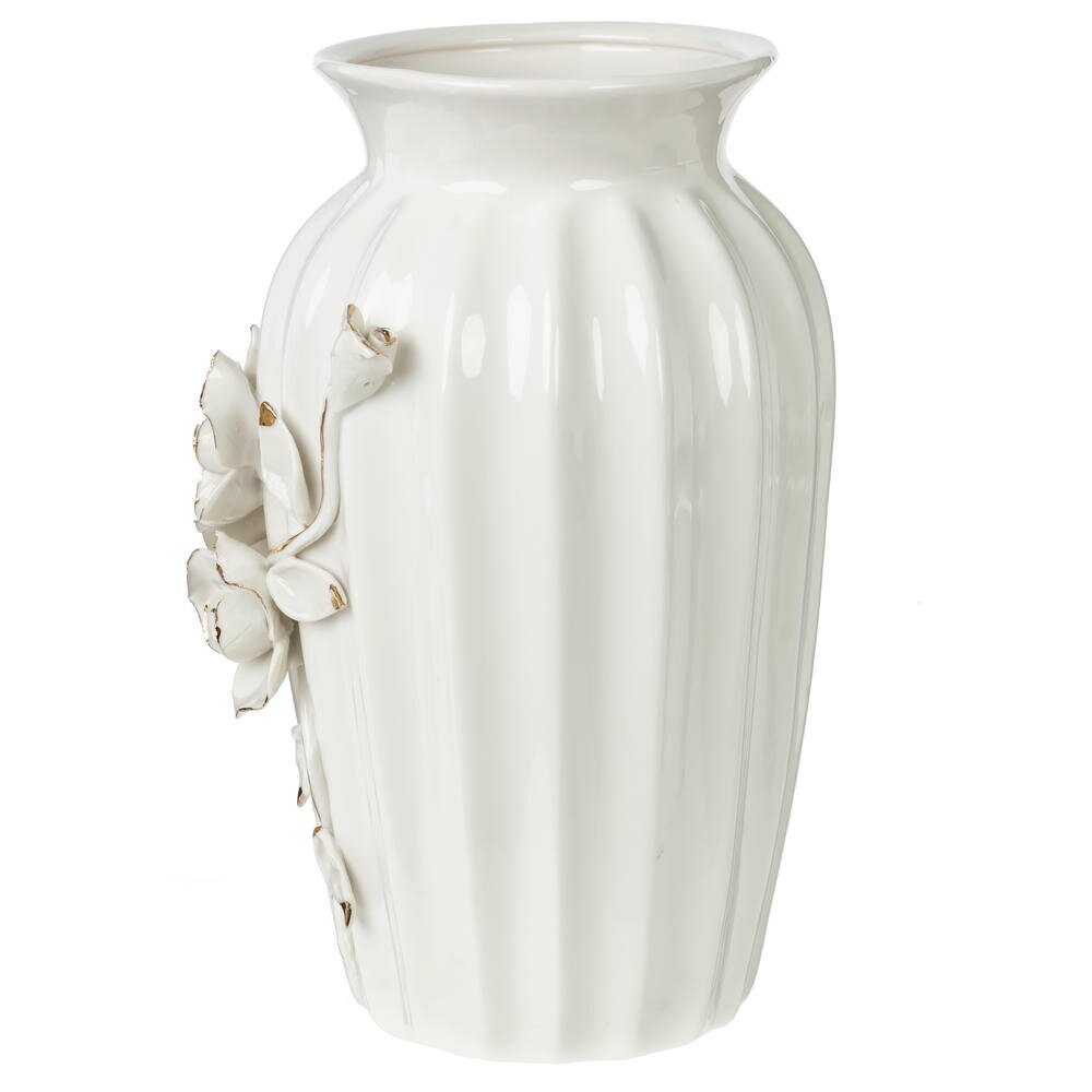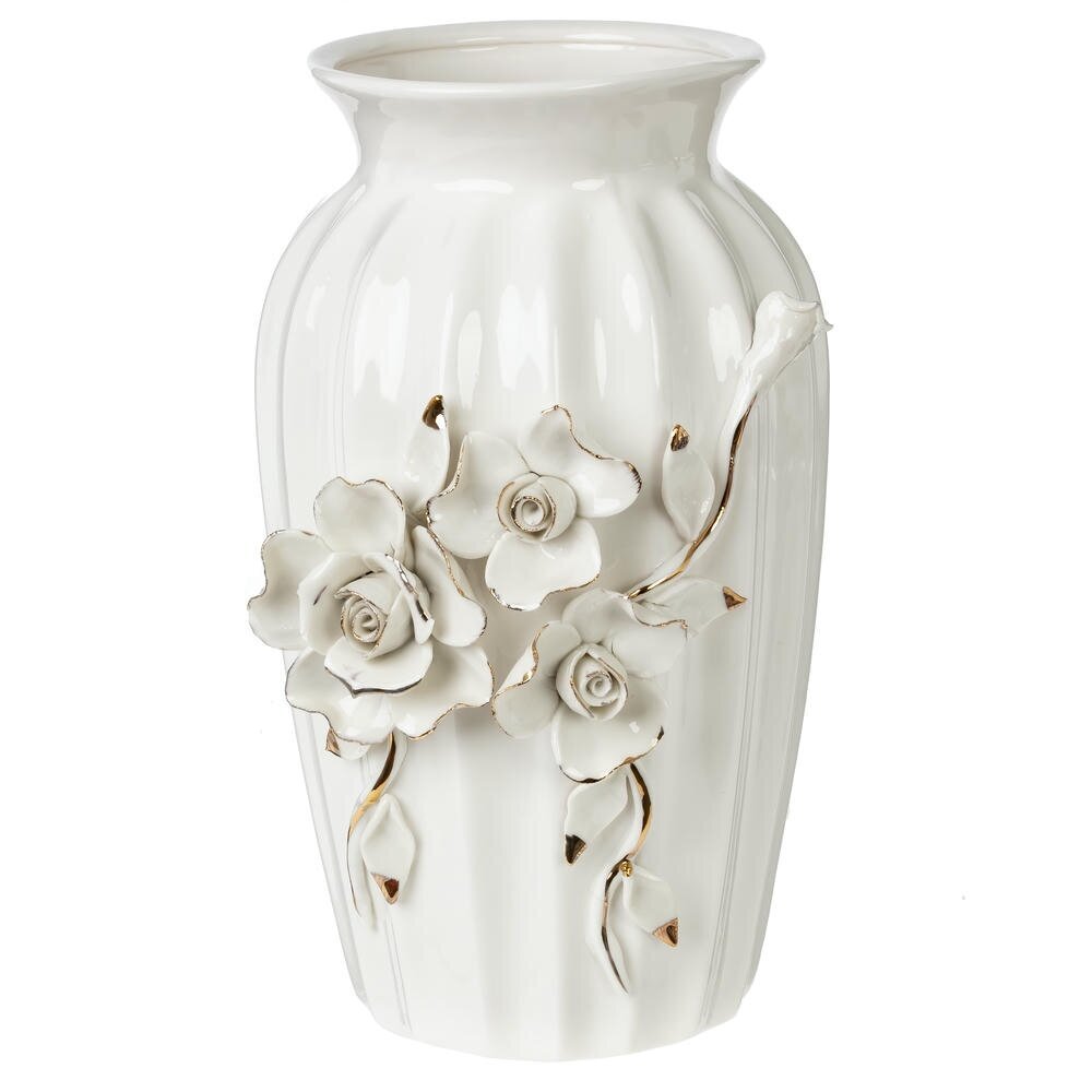 Элегантная фарфоровая ваза объёмом 2000 мл станет изысканным акцентом вашего интерьера. Изделие выполнено из гладкого белого фарфора с мягким глянцевым блеском и украшено объёмными цветами-розами, аккуратно выделенными золотистым контуром по краям лепестков. Корпус вазы имеет плавный рельеф, а широко раскрытое горлышко обеспечивает удобное размещение как пышных букетов, так и одиночных цветочных композиций. Такая ваза гармонично впишется в классический, романтический или современный стиль, украсит гостиную, спальню или столовую и станет прекрасным подарком к любому празднику. Диаметр горловины: 7,5 см.