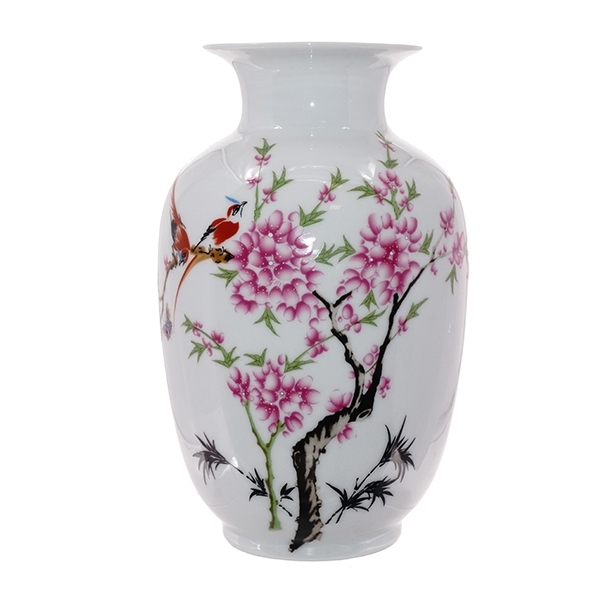Изящная фарфоровая ваза с гладкой глянцевой поверхностью. Ваза имеет традиционную форму с округлым корпусом и узким горлышком, что придаёт ей элегантность и утончённость. Основной цвет поверхности — чистый белый, что подчёркивает изысканность изделия. На поверхности нанесён красивый рисунок: распустившиеся ветви сакуры с яркими розовыми цветами и тонкими зелёными листьями. Среди цветов изображена изящная птица с тонкими крыльями, что добавляет композиции живости и динамики. Декор выполнен в восточном стиле, что придаёт вазе ощущение лёгкости и гармонии. Такой фарфоровый предмет станет украшением любого интерьера, привнеся в него нотку утончённой красоты и изысканности. Размер горловины: 5.5*5.5 см.