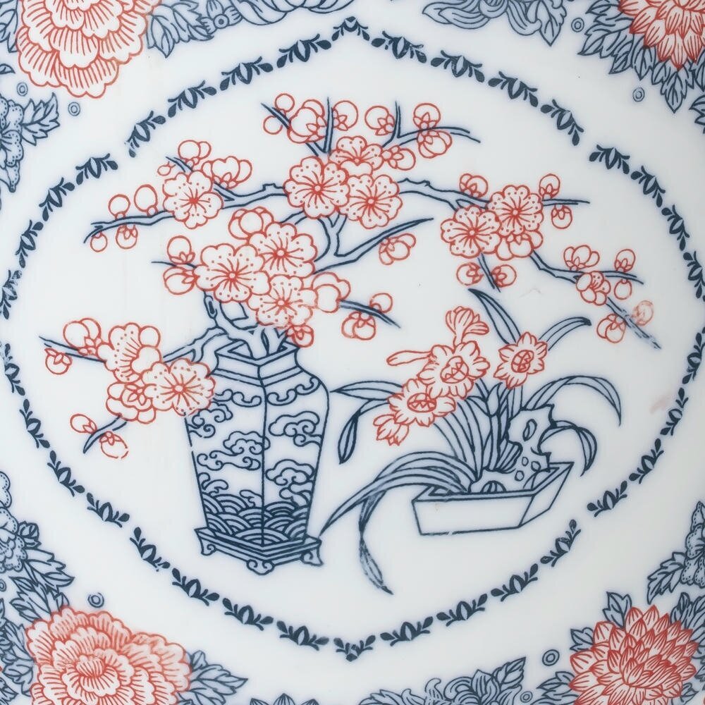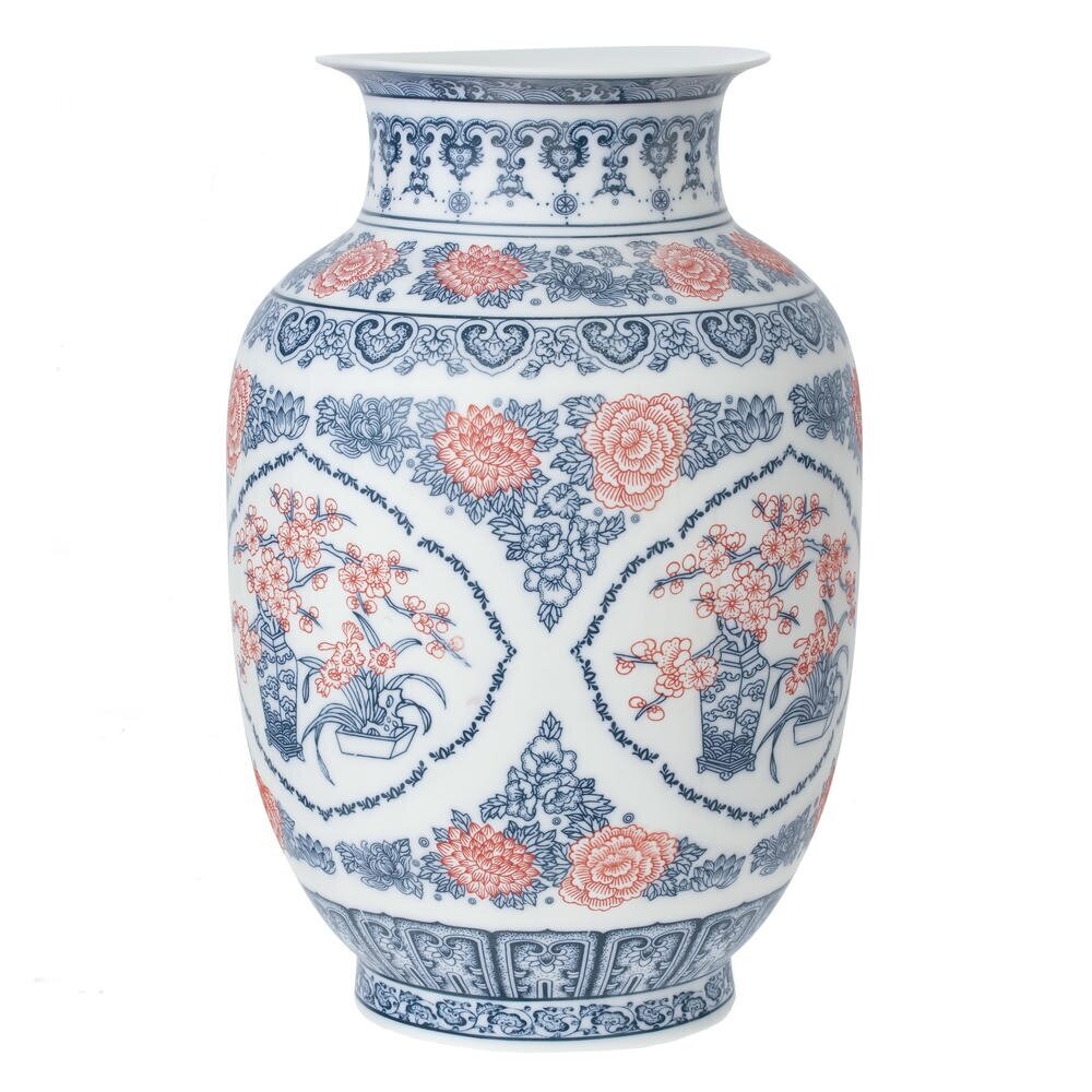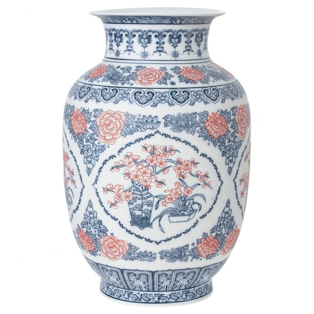 Элегантная напольная ваза объёмом 4700 мл из высококачественного фарфора станет выразительным акцентом в любом интерьере. Классическая форма с плавными очертаниями дополнена широким горлышком, что позволяет удобно размещать как пышные букеты, так и одиночные декоративные ветви. Белоснежный фон фарфора украшен сложным орнаментом в сине?красной гамме: изящные цветы, листья и декоративные элементы создают ощущение ручной росписи и напоминают мотивы восточной классики. Поверхность гладкая, легко очищается и не теряет яркости со временем. Ваза гармонично впишется в гостиную, спальню или кабинет, подойдёт для оформления каминов, консольных столиков, витрин и рецепций. Идеальный выбор для тех, кто ценит изысканную атмосферу дома и любит продуманные детали декора, а также прекрасный подарок на новоселье, юбилей или семейное торжество. Диаметр горловины: 10 см.
