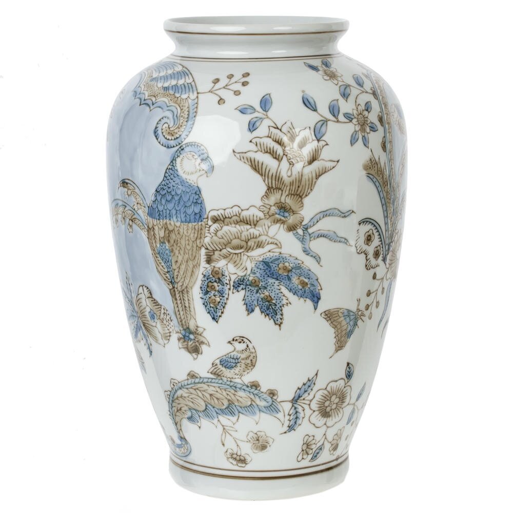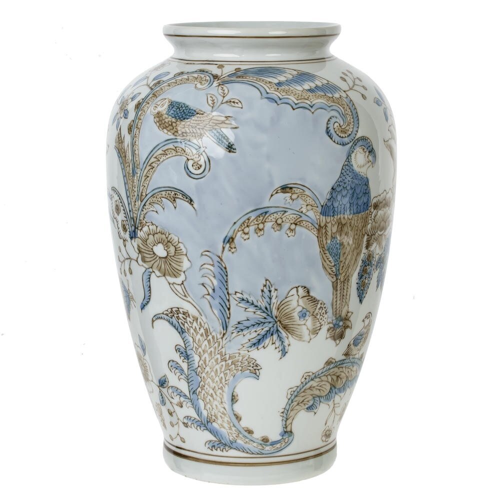 Элегантная декоративная ваза объёмом 5600 мл из высококачественного фарфора станет выразительным акцентом в интерьере гостиной, спальни или кабинета. Белоснежная основа украшена тонким рисунком в мягких голубых и бежевых тонах: изящные птицы, цветы и листья создают ощущение лёгкости и утончённой роскоши. Классическая форма с плавными изгибами подчёркивает изящество изделия и гармонично сочетается как с современным, так и с классическим стилем оформления. Ваза подходит для оформления букета живых или искусственных цветов, а также может использоваться как самостоятельный декоративный объект на комоде, каминной полке или консоли. Прочный фарфор устойчив к выцветанию и легко очищается, благодаря чему изделие долго сохраняет безупречный внешний вид. Отличный вариант для подарка ценителям красоты и уюта. Диаметр горловины: 9.5 см.