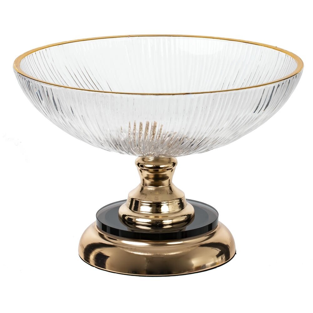 Элегантная ваза для фруктов из сочетания прозрачного стекла и металла станет выразительным акцентом на любом столе. Широкая стеклянная чаша с рельефными вертикальными линиями и тонким золотистым кантом подчеркивает свежесть фруктов и десертов. Устойчивая металлическая ножка благородного золотого оттенка придает изделию роскошный, но при этом универсальный вид, гармонично вписываясь как в классический, так и в современный интерьер. Ваза идеально подходит для ежедневного использования и праздничной сервировки, создавая ощущение особого торжества.