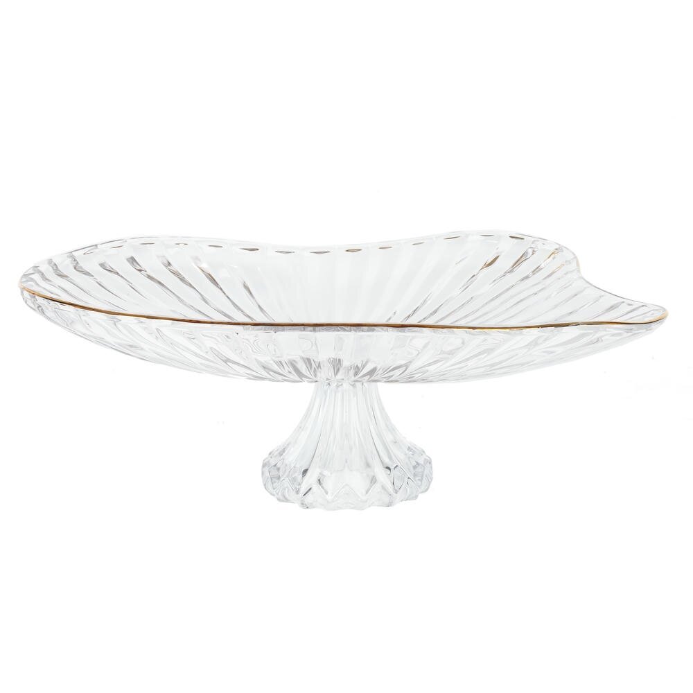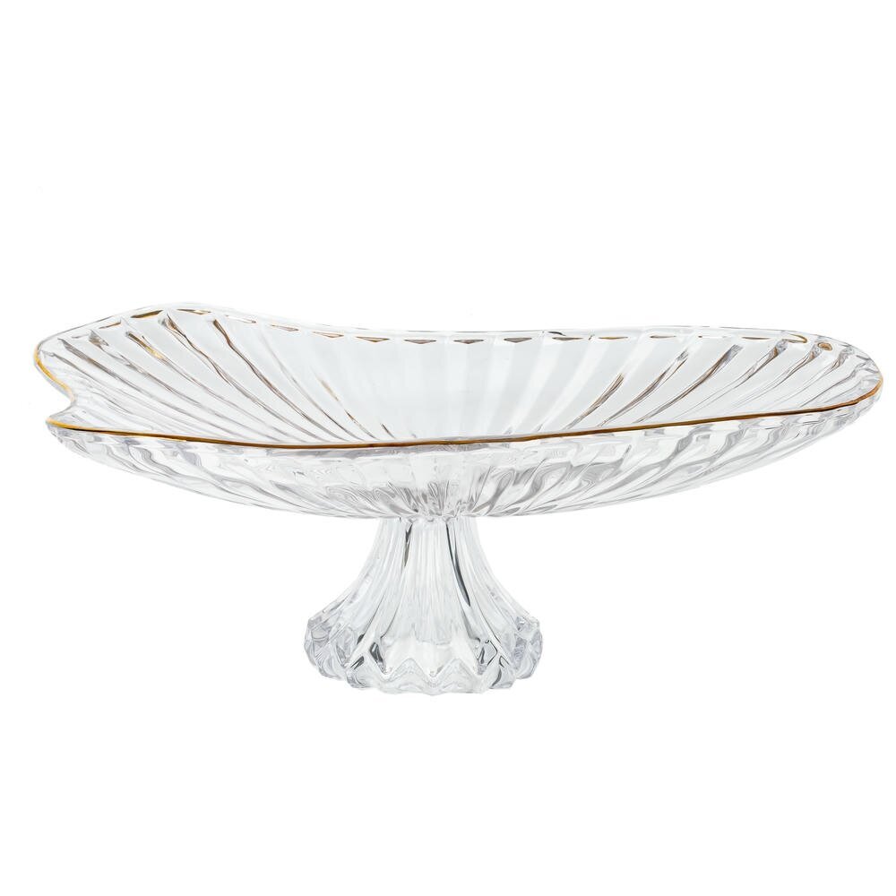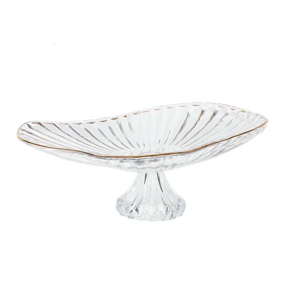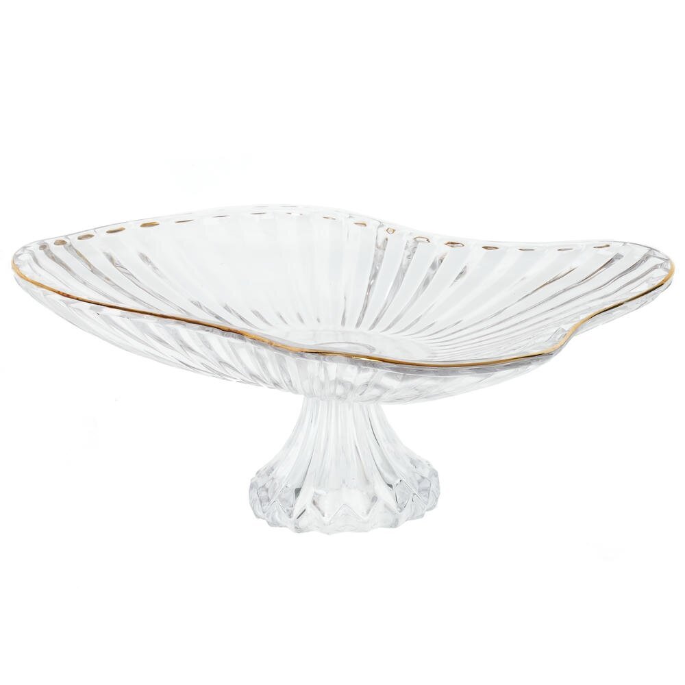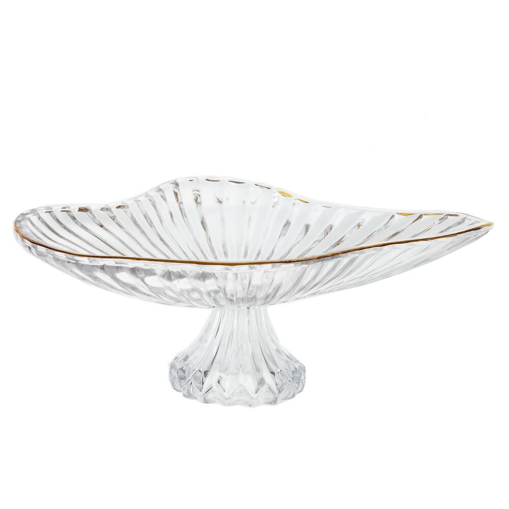 Элегантная ваза для фруктов из прозрачного стекла на изящной ножке станет эффектным акцентом любого стола. Удлинённая овальная форма с плавными волнистыми краями подчёркивает красоту фруктов и десертов, а рельефный узор на чаше и основании красиво преломляет свет. Тонкая золотистая окантовка по краю придаёт изделию благородный, почти хрустальный вид и гармонично сочетается с классической и современной сервировкой. Ваза подойдёт для повседневного использования и праздничных мероприятий, легко очищается и сохраняет прозрачный блеск при бережном уходе.