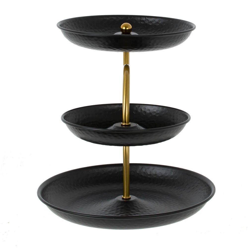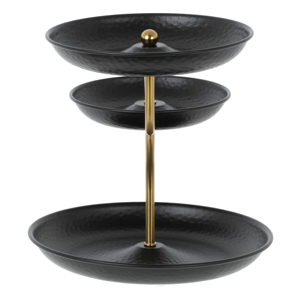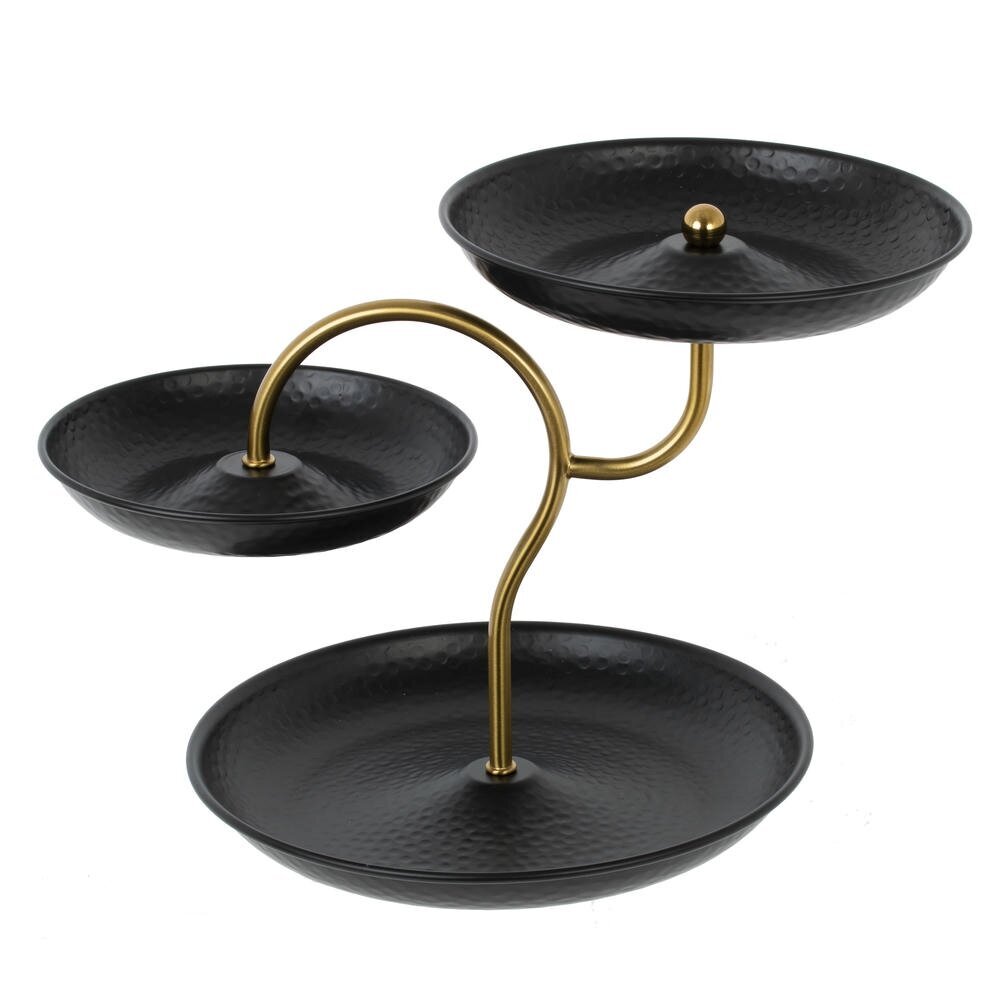 Элегантная трехъярусная ваза для фруктов из металла станет выразительным акцентом на вашей кухне или в гостиной. Модель выполнена в современном стиле: три круглых черных подноса с фактурной, слегка чеканистой поверхностью соединены изогнутой стойкой благородного золотистого цвета. Верхние ярусы удобно использовать для ягод и мелких фруктов, нижний – для яблок, груш, цитрусовых или кондитерских изделий. Металл прочен, устойчив к деформации и прост в уходе – достаточно протереть влажной салфеткой. Конструкция обеспечивает хорошую устойчивость и экономит место на столе, создавая аккуратную, эффектную сервировку. Подходит как для повседневного использования, так и для праздничной подачи.