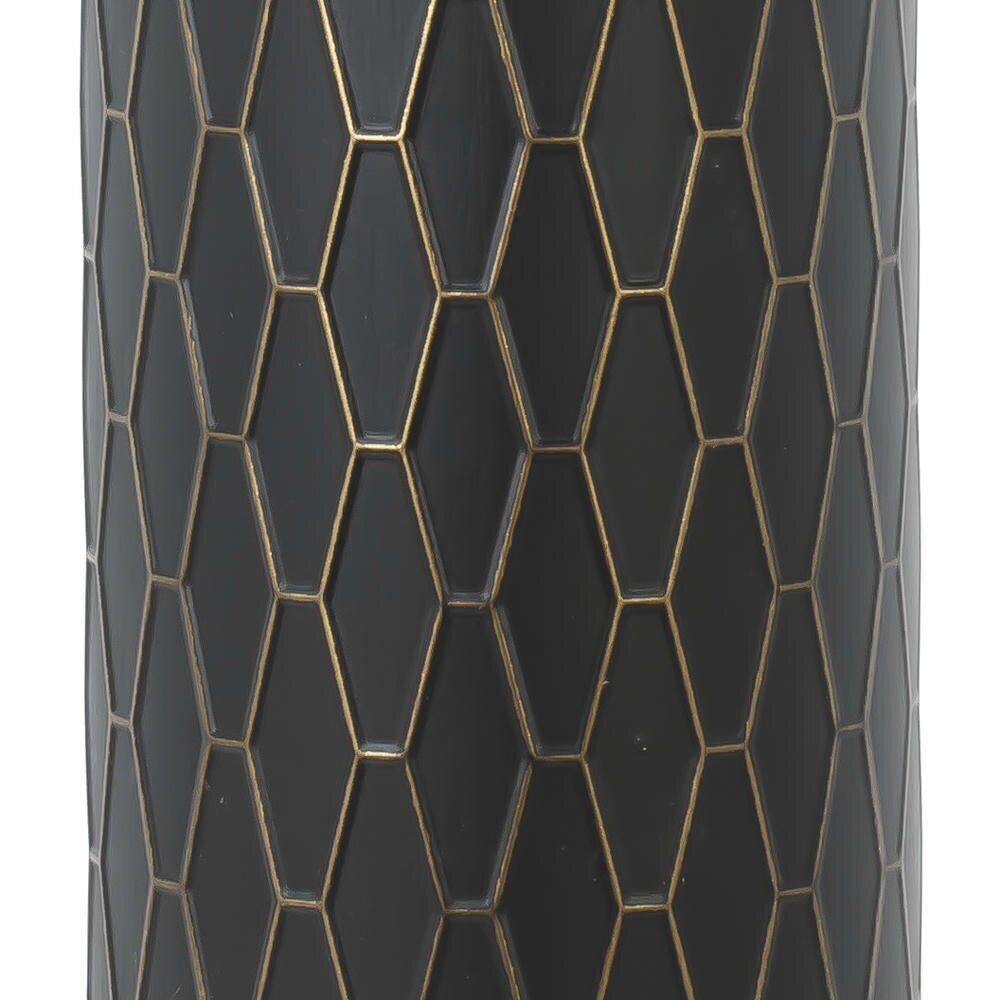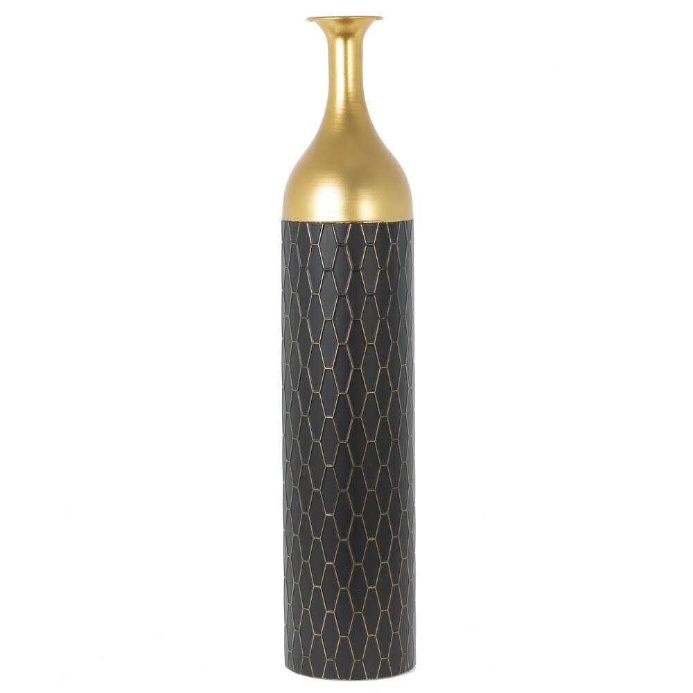 Эффектная напольная ваза для искусственных цветов станет стильным акцентом в любом интерьере. Изделие выполнено из прочного металла и имеет вытянутую цилиндрическую форму (L15 ? W15 ? H74,5 см), благодаря чему идеально подходит для высоких композиций из сухоцветов и декоративных веток. Нижняя часть вазы окрашена в глубокий чёрный цвет и украшена изящным геометрическим узором в виде вытянутых сот, подчеркивающим современный характер дизайна. Верх и горлышко выполнены в благородном золотистом оттенке, что добавляет изделию роскоши и делает его гармоничным элементом интерьеров в стиле модерн, лофт, арт-деко или классика. Ваза предназначена для декора и использования с искусственными цветами, не требует сложного ухода и надолго сохранит безупречный внешний вид. Диаметр горловины: 4 см.