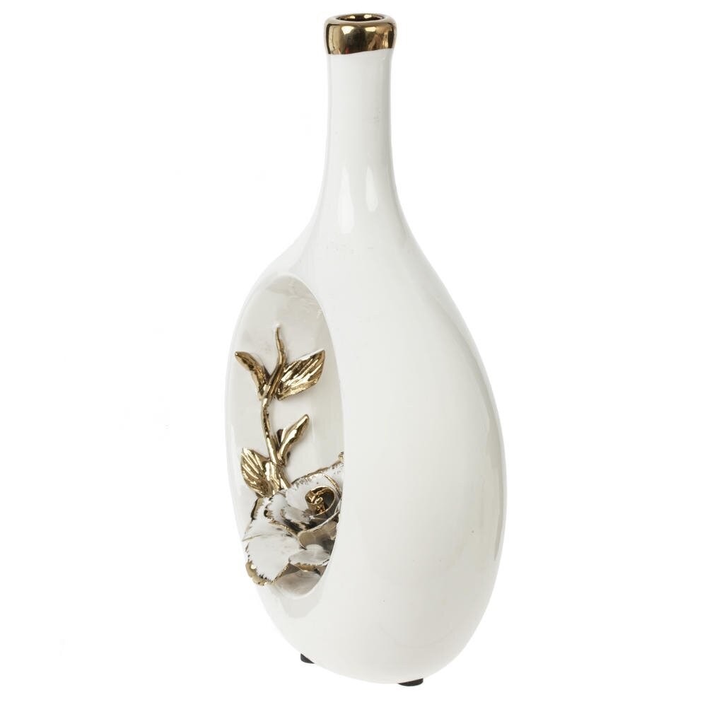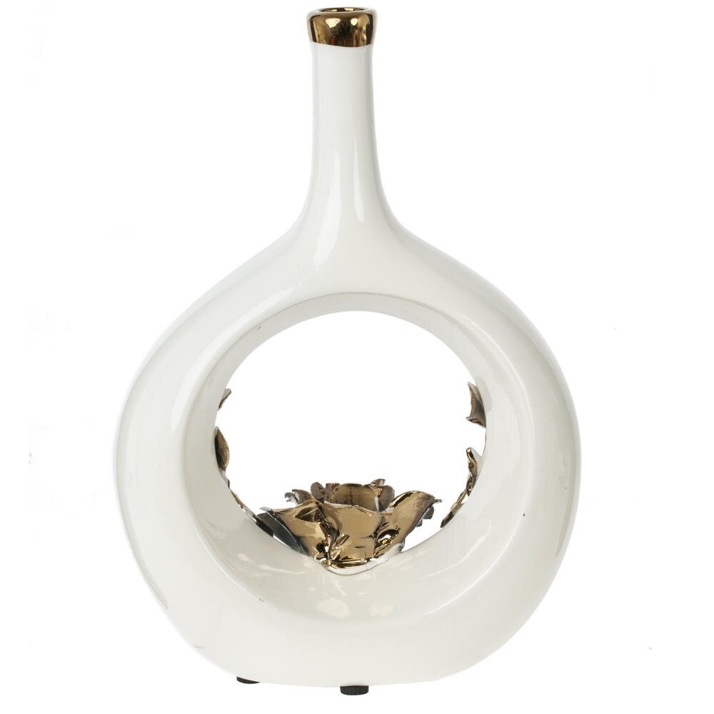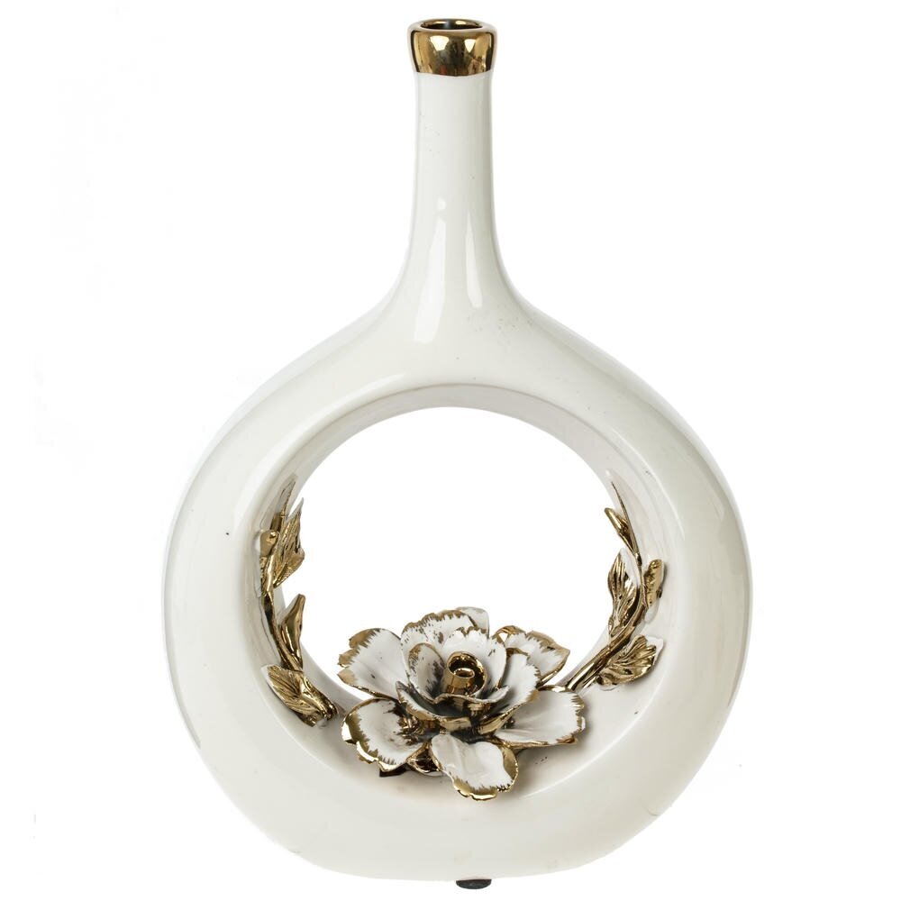 Изящная декоративная ваза объёмом 490 мл выполнена из высококачественного фарфора и станет эффектным акцентом в любом интерьере. Оригинальная круглая форма с фигурным вырезом в центре создаёт ощущение лёгкости и пространства, а вытянутое горлышко придаёт изделию утончённость. Центральным украшением композиции является объёмный цветок с лепестками белого цвета и золотистой окантовкой, дополненный изящными золотыми листиками. Благородное сочетание глянцевого белого фарфора и металлического блеска делает вазу универсальной деталью для гостиной, спальни или кабинета. В неё можно поставить одну–две декоративные ветки или использовать как самостоятельный арт-объект на полке, каминной полке или журнальном столике. Идеальный вариант подарка для ценителей стильного и элегантного декора дома. Диаметр горловины: 1.5 см.