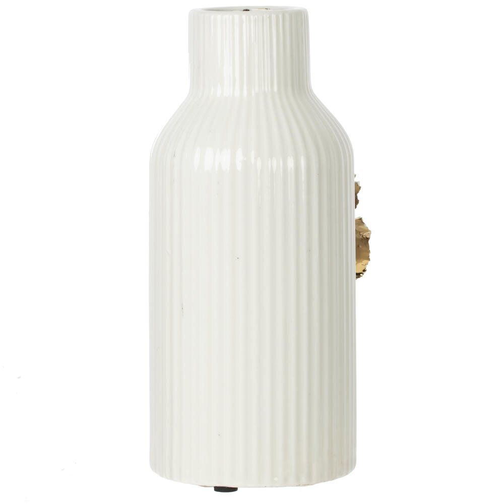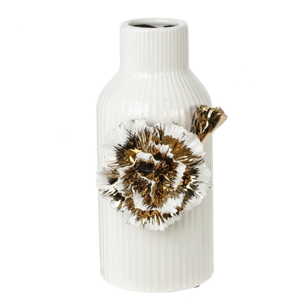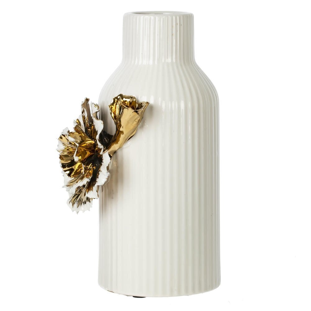 Элегантная декоративная ваза объёмом 750 мл из качественного фарфора. Белоснежный корпус с вертикальным рифлением подчёркивает утончённую форму, а крупный объёмный цветок с эффектным золотистым покрытием создаёт яркий акцент. Ваза идеально подойдёт для одной-двух веток живых или искусственных цветов, а также как самостоятельный интерьерный объект. Станет стильным украшением гостиной, спальни или кабинета и удачным подарком ценителям изысканного декора. Лёгкая в уходе, устойчива, гармонично сочетается с современными и классическими интерьерами. Диаметр горловины: 4 см.