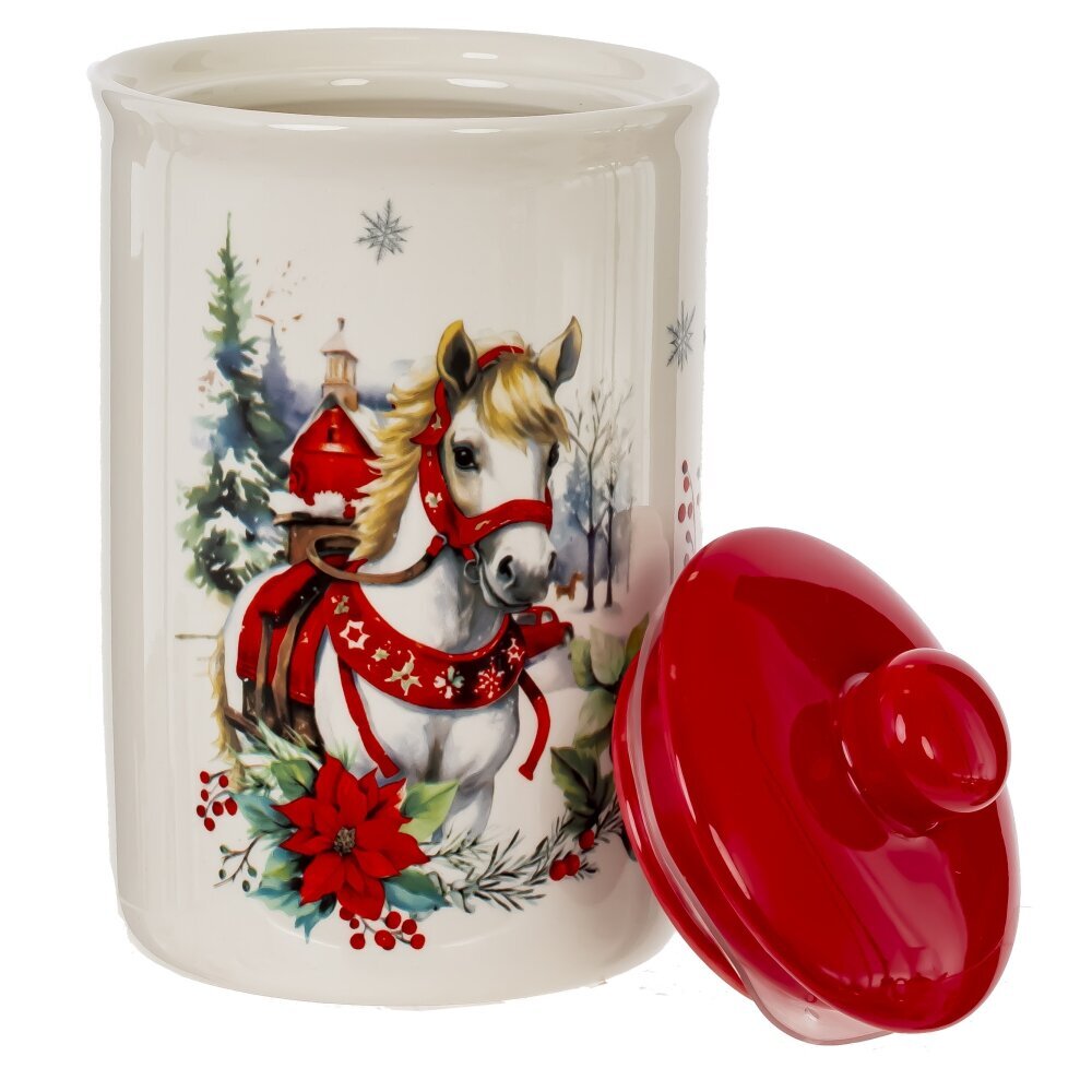 Элегантная керамическая ёмкость с изображением красивой белой лошади в праздничной сбруе и рождественской пуансеттией. Обладает вместимостью 680 мл и идеально подходит для хранения чая, кофе, муки, круп, сахара и других сыпучих продуктов. Красная крышка имеет силиконовый уплотнитель для для защиты от влаги, пыли, насекомых и посторонних запахов, обеспечивая свежесть продуктов на долгое время. Изготовлена из прочной керамики, что обеспечивает долгий срок службы. Прекрасно впишется в любой интерьер и станет прекрасным дополнением к сервировке. Идеальный выбор для тех, кто ценит классику, традиции и надежность.