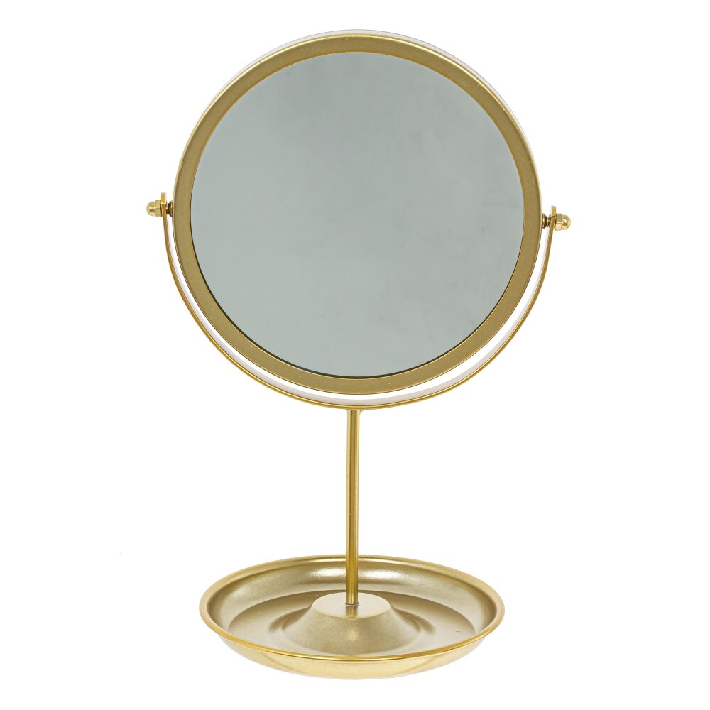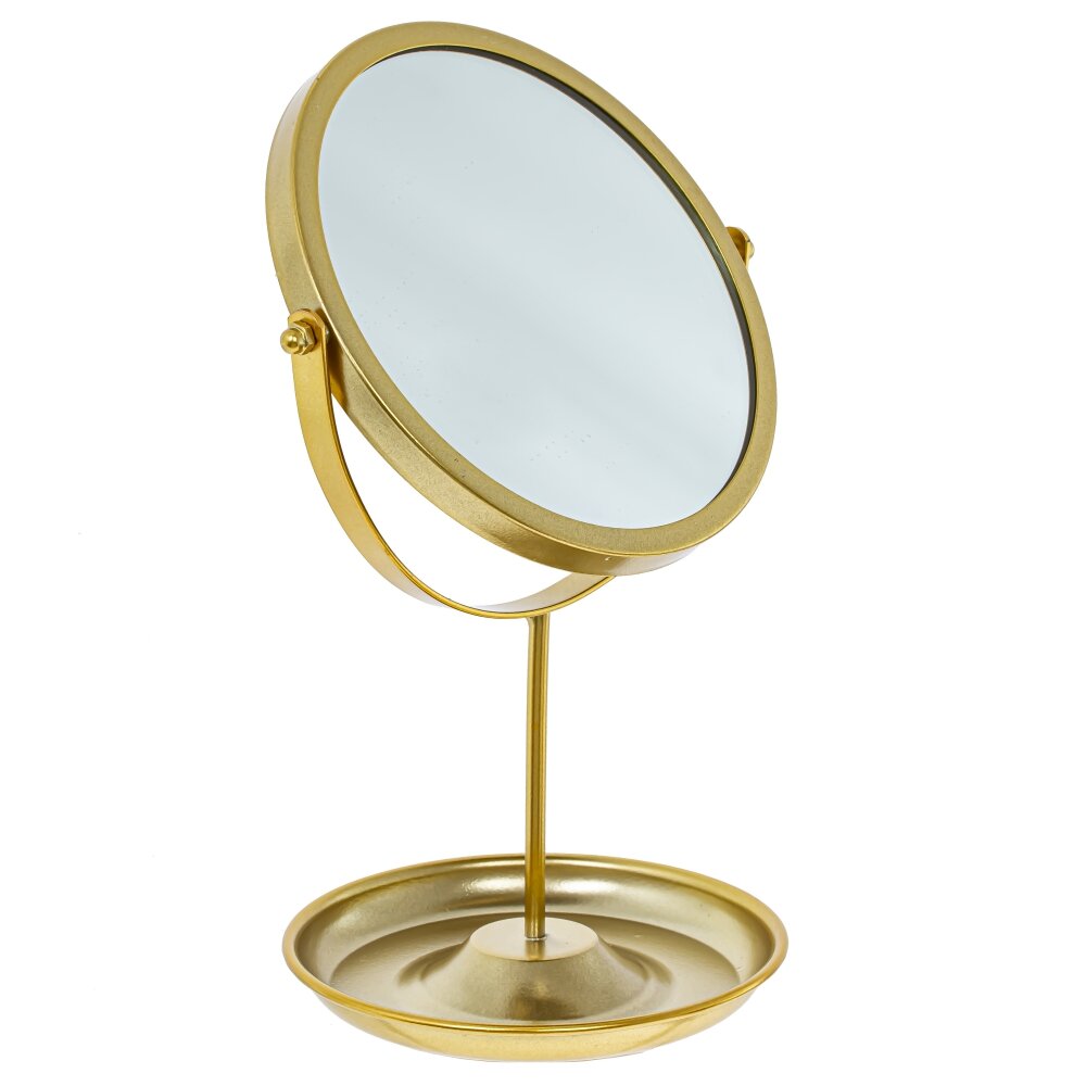 Настольное зеркало из металла в золотистом цвете - это элегантный и стильный аксессуар для вашего интерьера. Его нижняя часть выполнена в виде тарелочки, которая идеально подойдет для хранения мелочей, украшений или косметики. Зеркало идеально впишется как в спальню, так и в гостиную или ванную комнату, добавляя изысканности и функциональности вашему пространству. Золотистый цвет придает зеркалу роскошный вид, а его компактные размеры делают его удобным для размещения на столике, полке или комоде. При помощи этого зеркала вы сможете не только оценить свой образ, но и хранить важные мелочи под рукой.