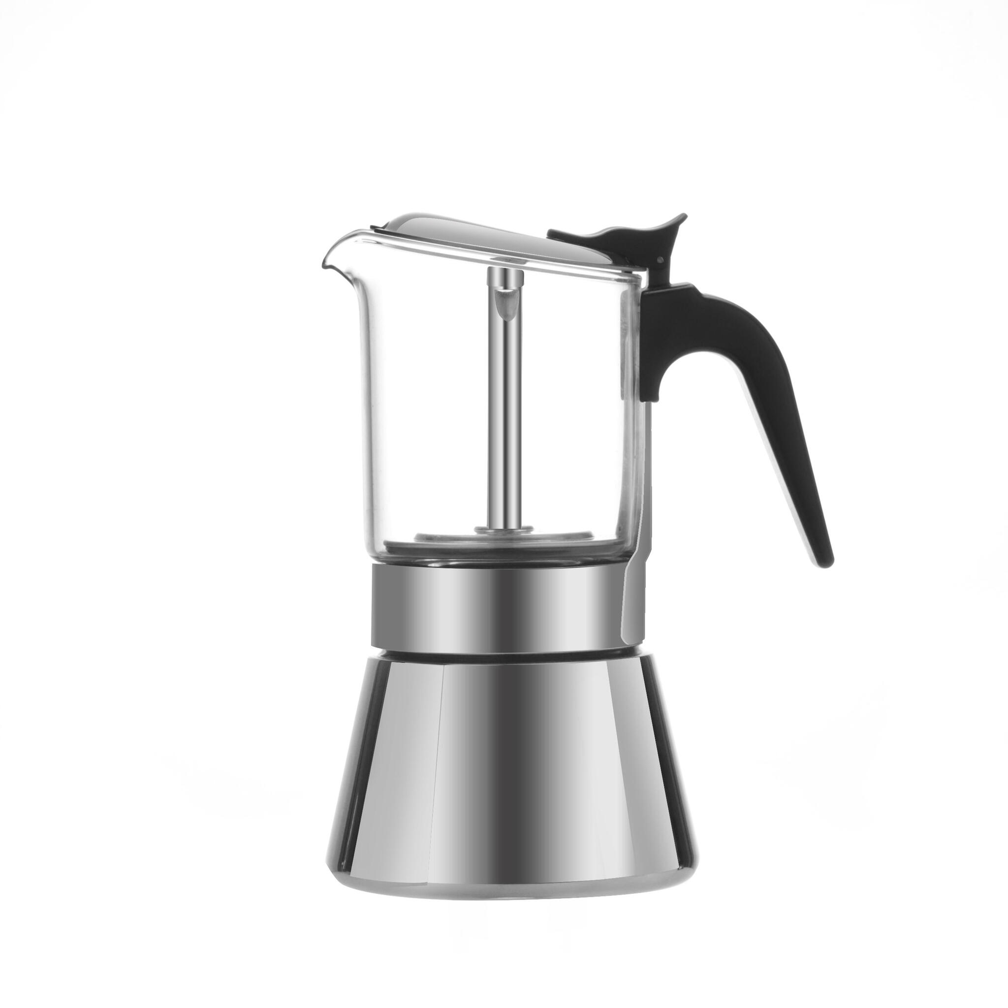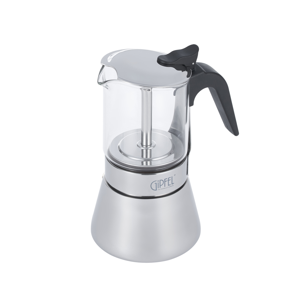 Гейзерная кофеварка Gipfel Piacere 5342 240мл на 6 чашек, со стеклянной колбой. Подходит для индукционных плит. Материал: жаропрочное боросиликатное стекло, нержавеющая сталь, нейлон. Комплектация: верхний сосуд, фильтр для кофе из нержавеющей стали, нижний контейнер.