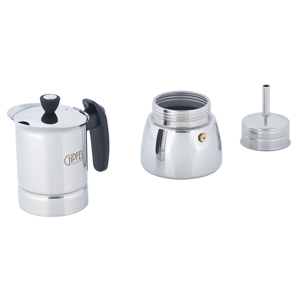 Гейзерная кофеварка Gipfel Vals 5329 300 мл. Сделана из нержавеющей стали SS 304, SS 430. Имеет индукционное дно. Ручка из черного нейлона. Диаметр дна кофеварки 9.5 см. Ширина с ручкой 14,2 см. Высота 20 см.