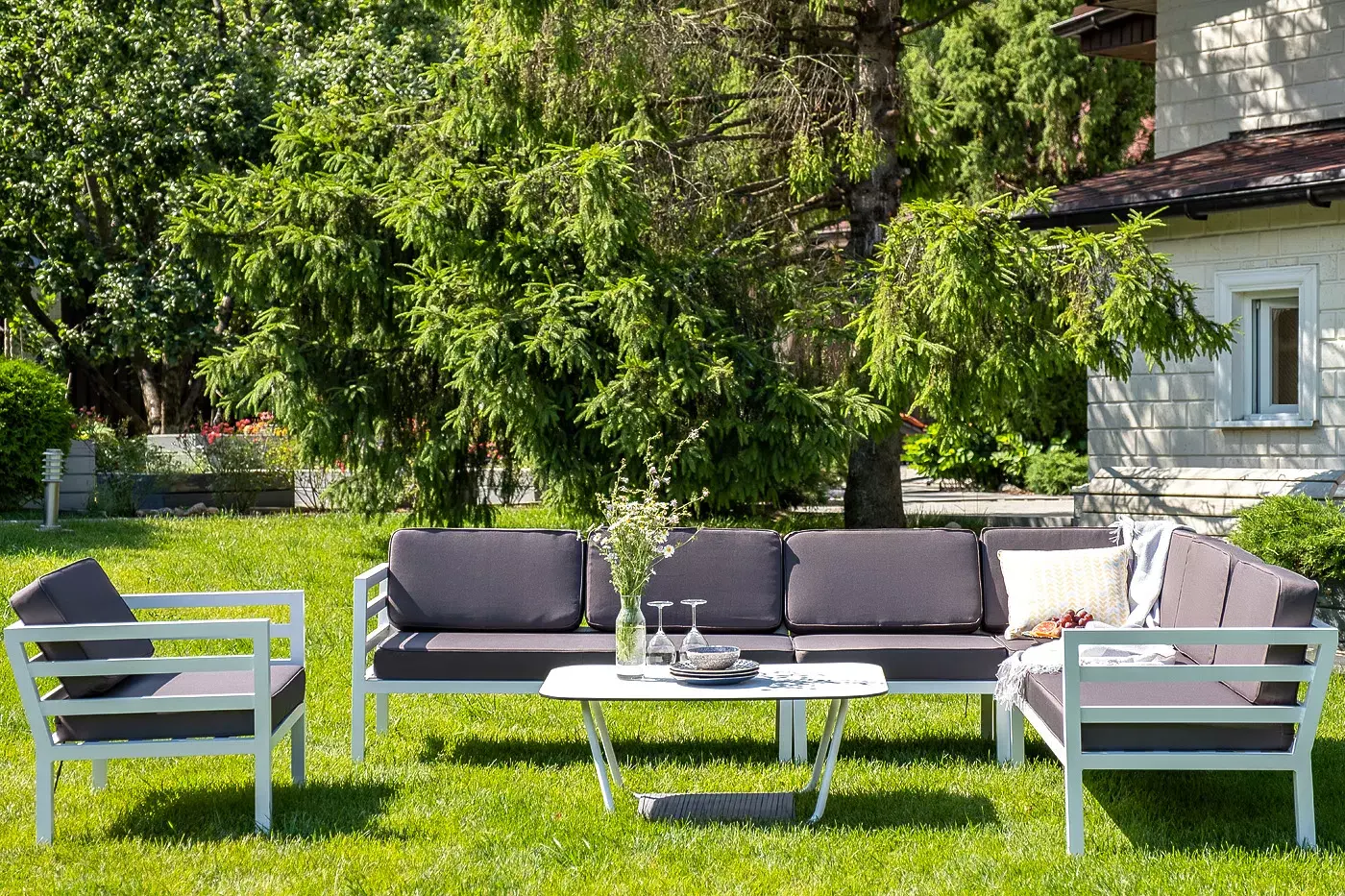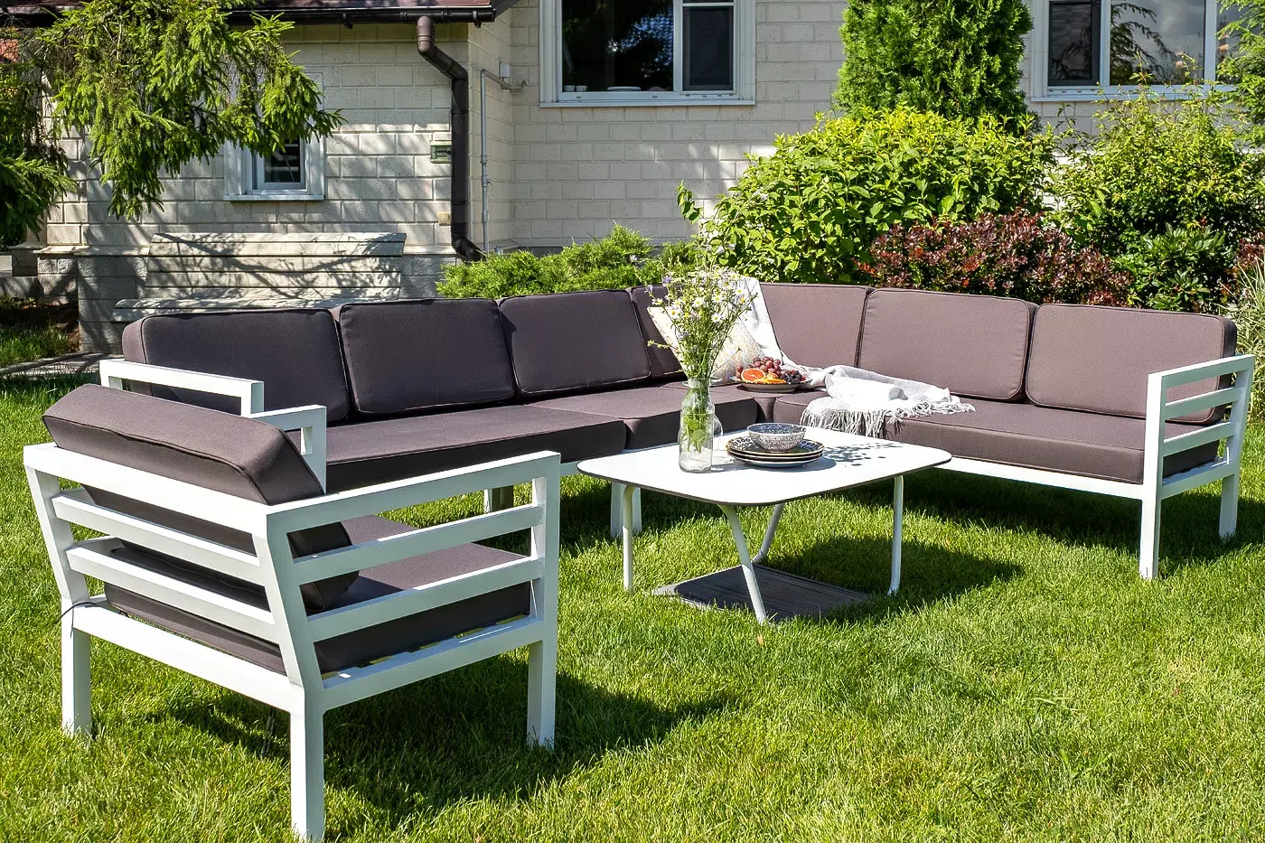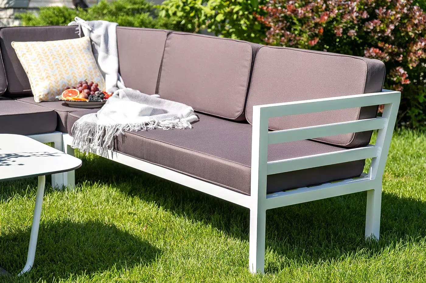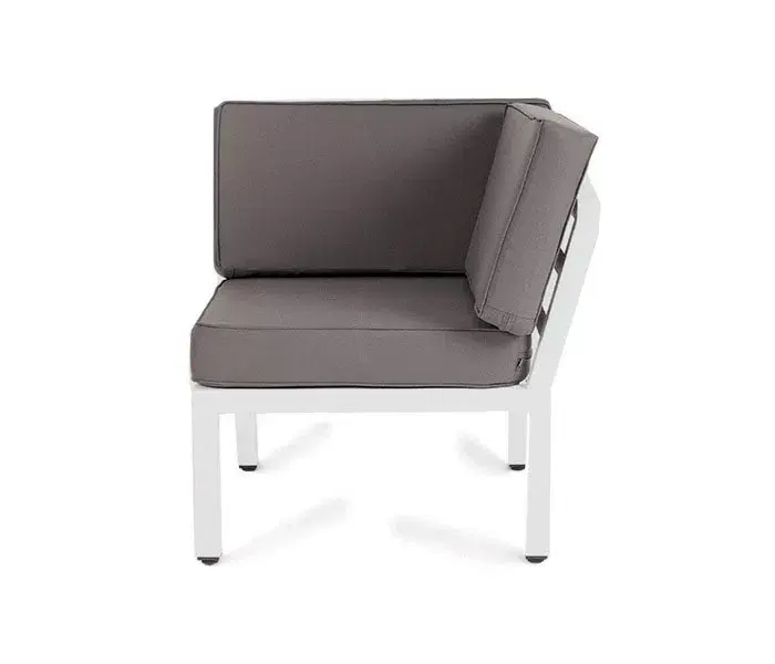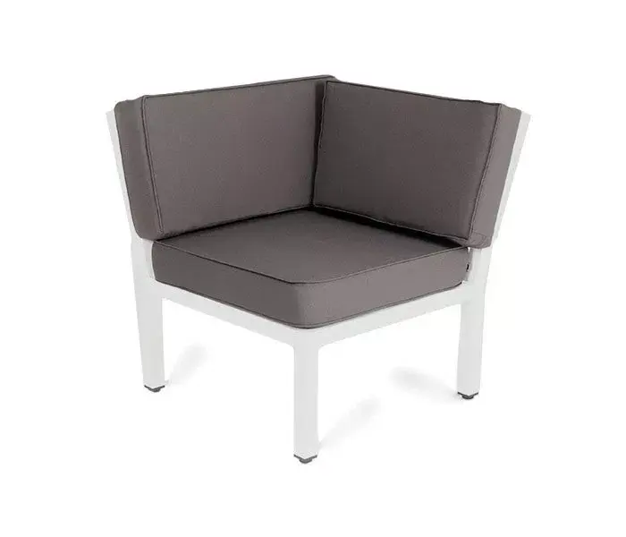 Каркас модуля изготовлен из алюминиевого профиля белого цвета. Дополеяют каркас подушки со съемными чехлами темно-серого цвета, которые обработаны влагоотталкивающей пропиткой.