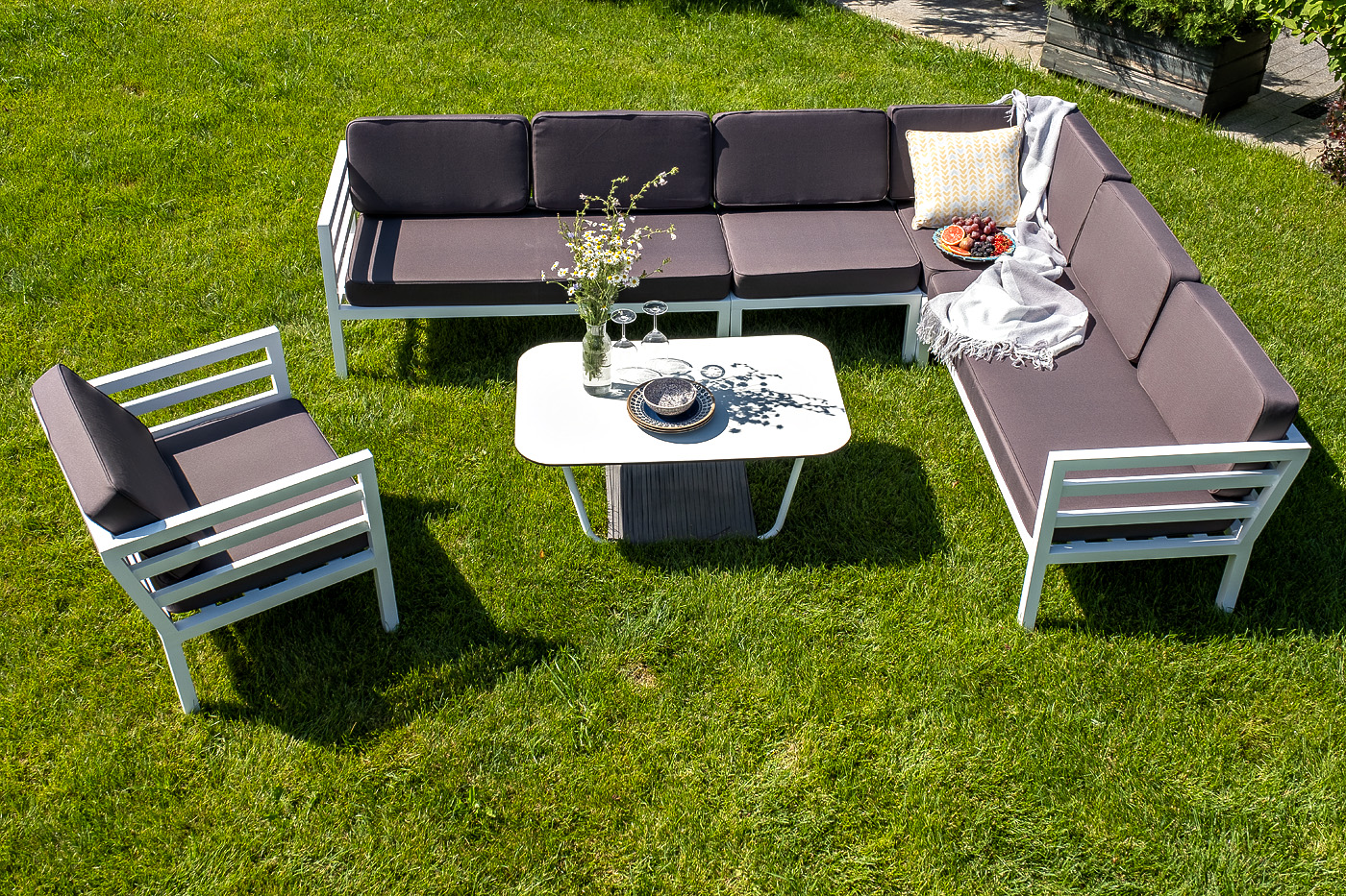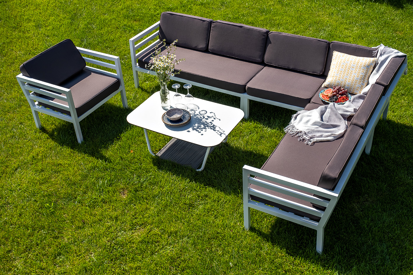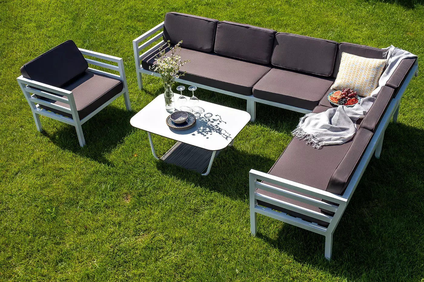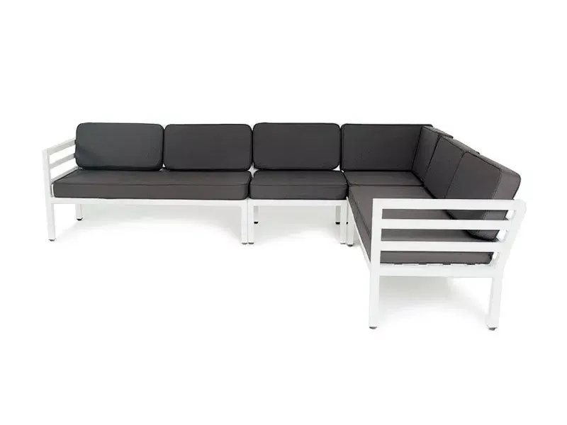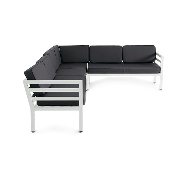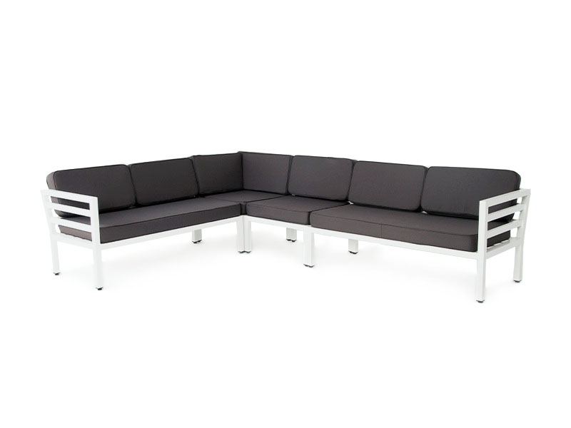 Угловой диван «Глория» для сада или летней террасы ресторана в строгом минималистичном стиле. Каркас выполнен из долговечного алюминия, окрашенного в белый цвет порошковой износостойкой краской. На сидениях и спинке предусмотрены подушки из влагоотталкивающей ткани темно-серого цвета.