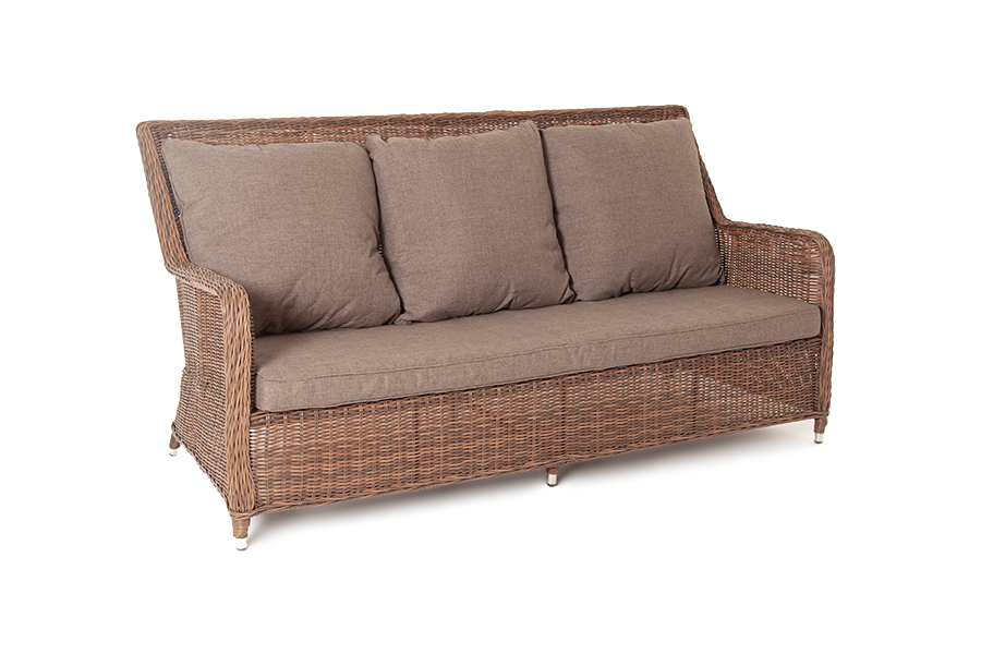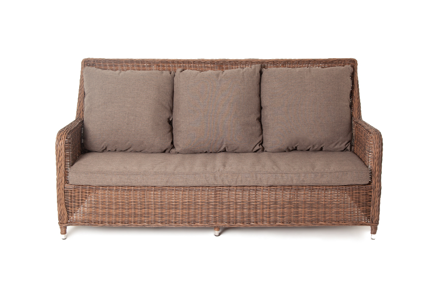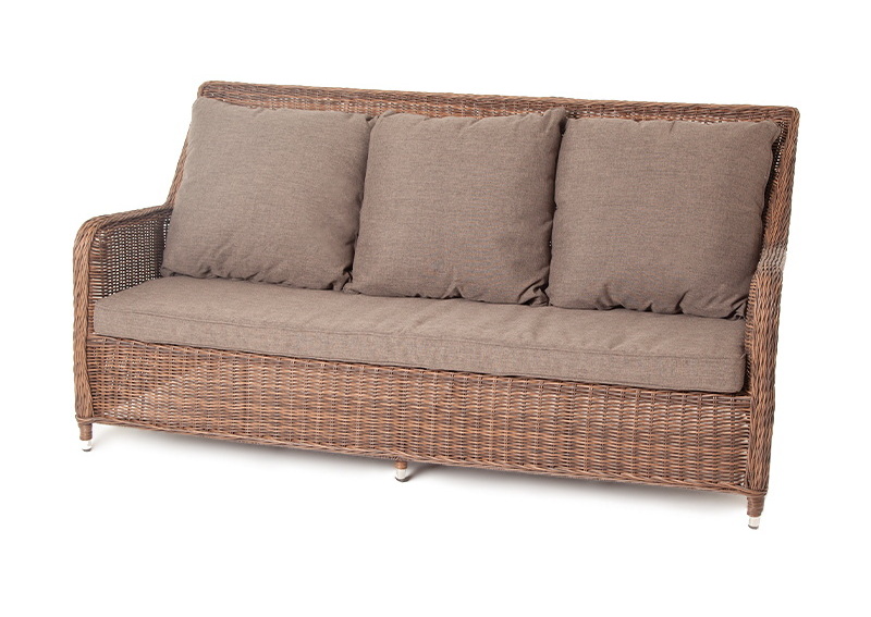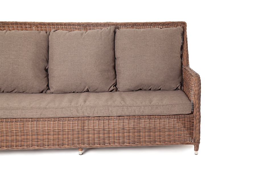 Диван из искусственного ротанга «Гляссе» оснащен каркасом из алюминия, оплетенного круглым искусственным ротангом коричневого цвета.