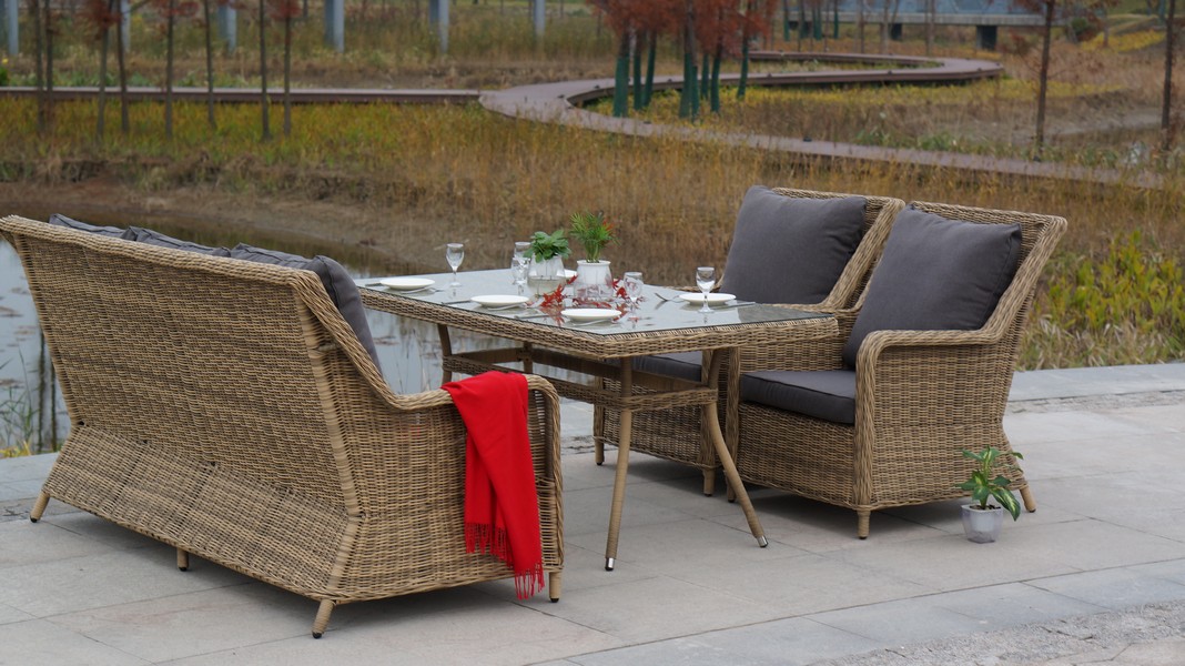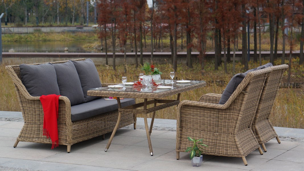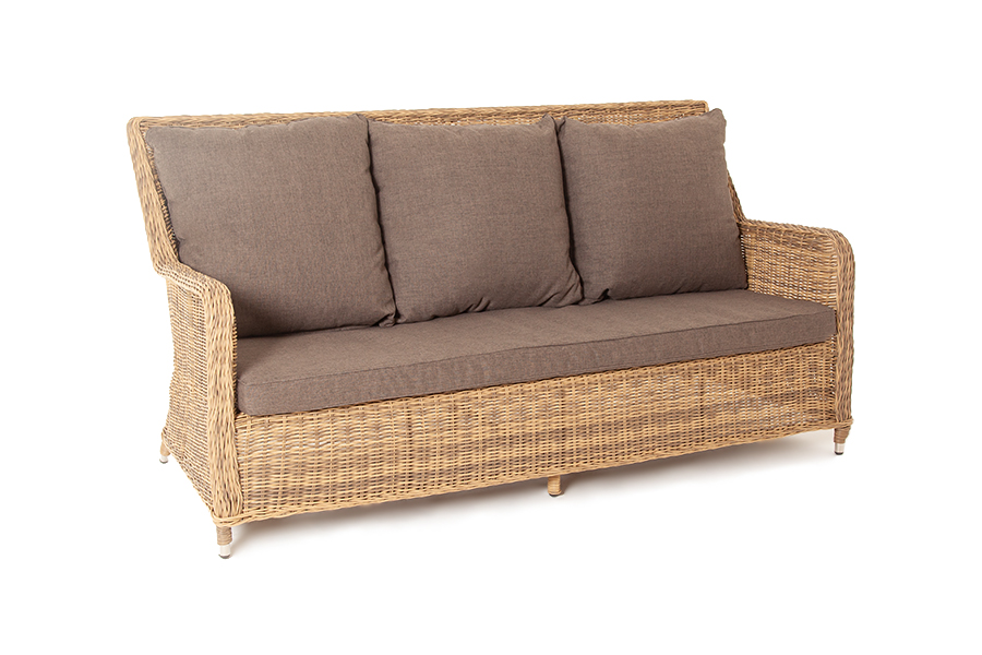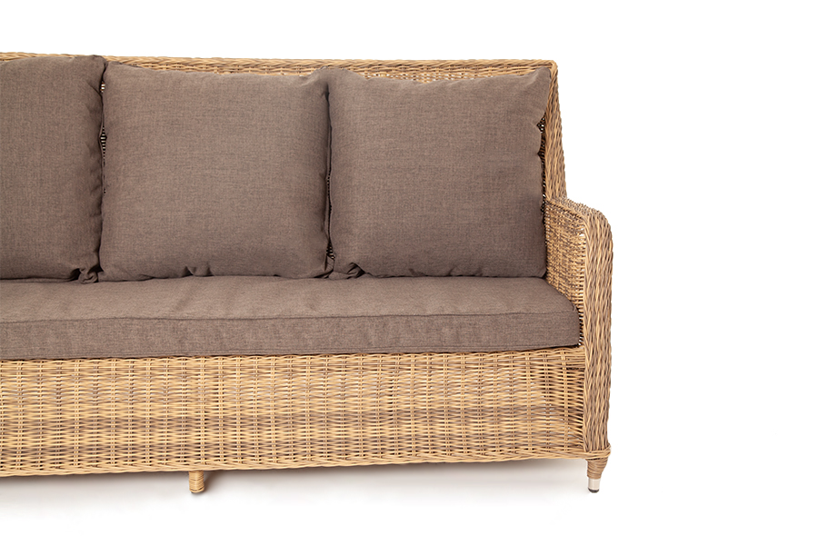 Ручное круглое плетение является основным декоративным элементом мебели. Оно выполнено из круглого искусственного ротанга соломенного цвета.