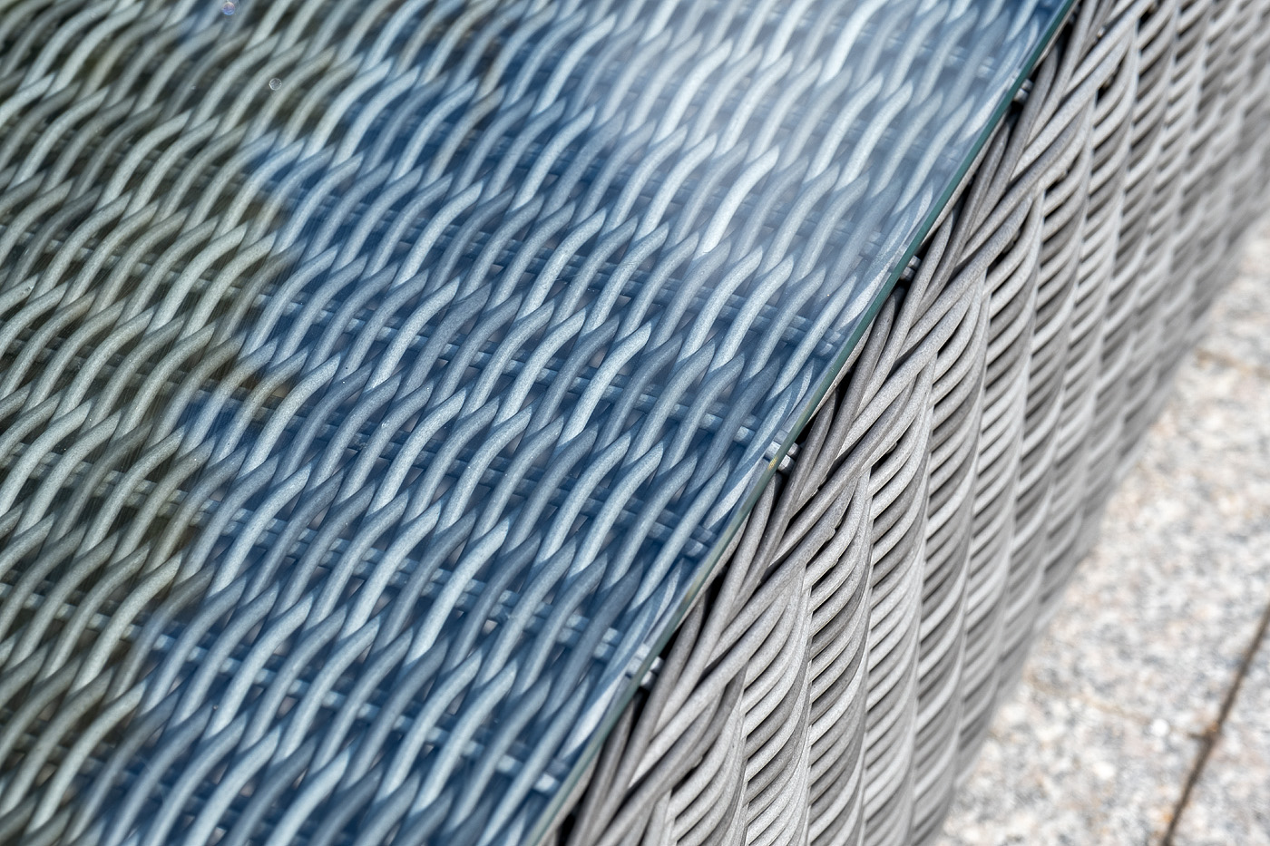 Плетеная мебель дополнена удобными подушками в серых чехлах. При их изготовлении используют полиэстер, плотность – 300гр/м2. Он обрабатывается влагоотталкивающей пропиткой для повышения защитных свойств материала.