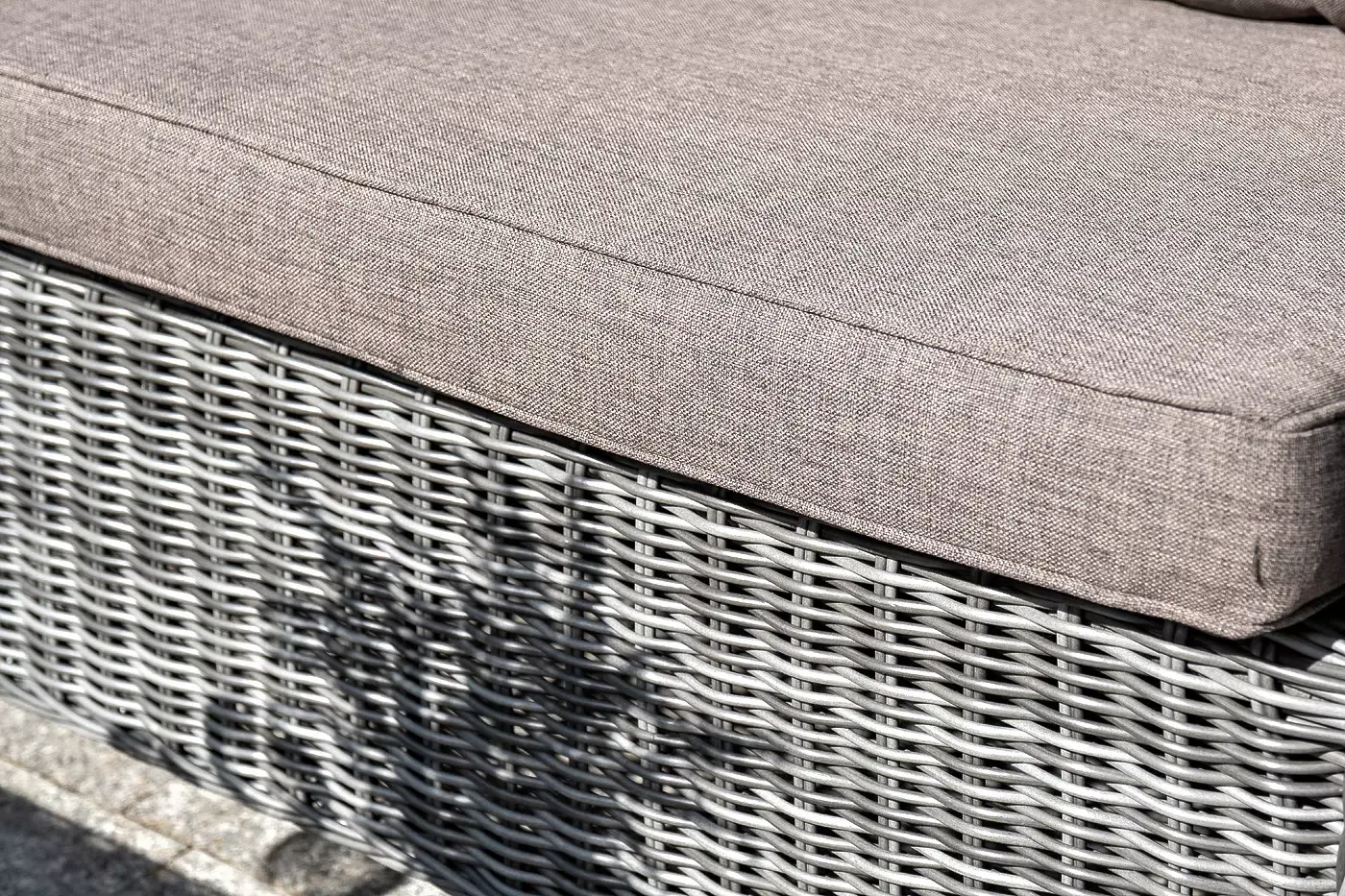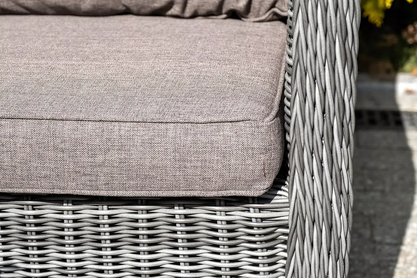 Плетеная мебель дополнена удобными подушками в серых чехлах. При их изготовлении используют полиэстер, плотность – 300гр/м2. Он обрабатывается влагоотталкивающей пропиткой для повышения защитных свойств материала.