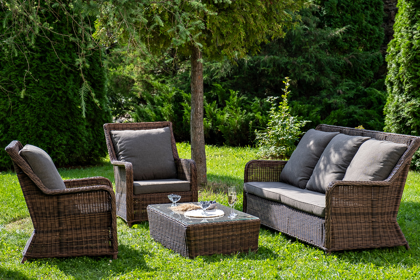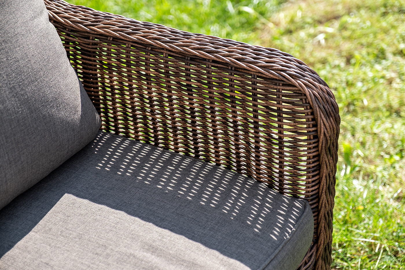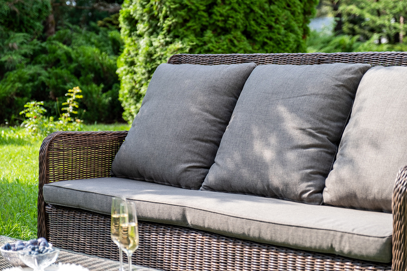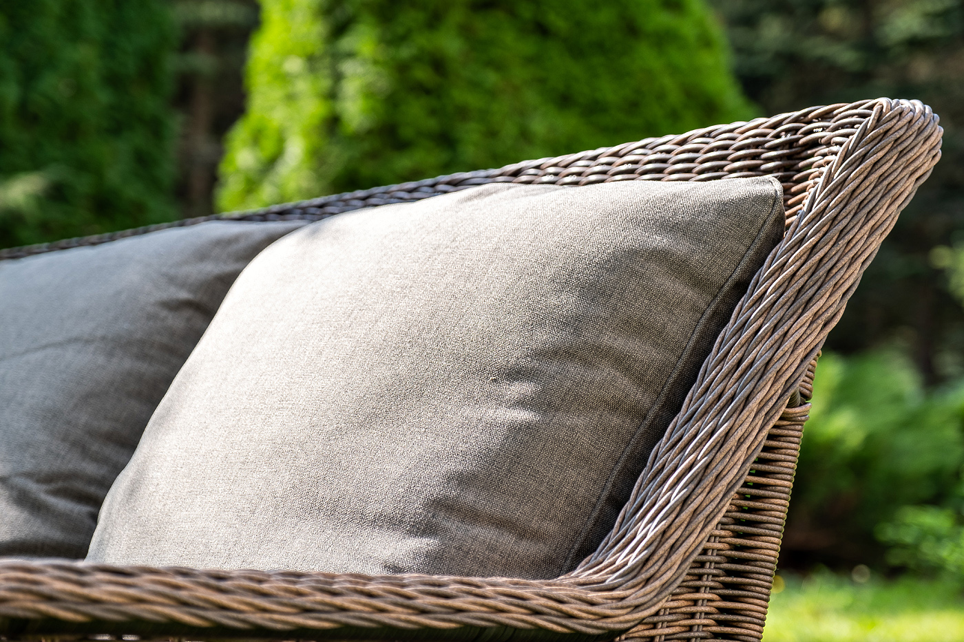 Плетеная мебель дополнена удобными подушками в серых чехлах. При их изготовлении используют полиэстер, плотность – 300гр/м2. Он обрабатывается влагоотталкивающей пропиткой для повышения защитных свойств материала.