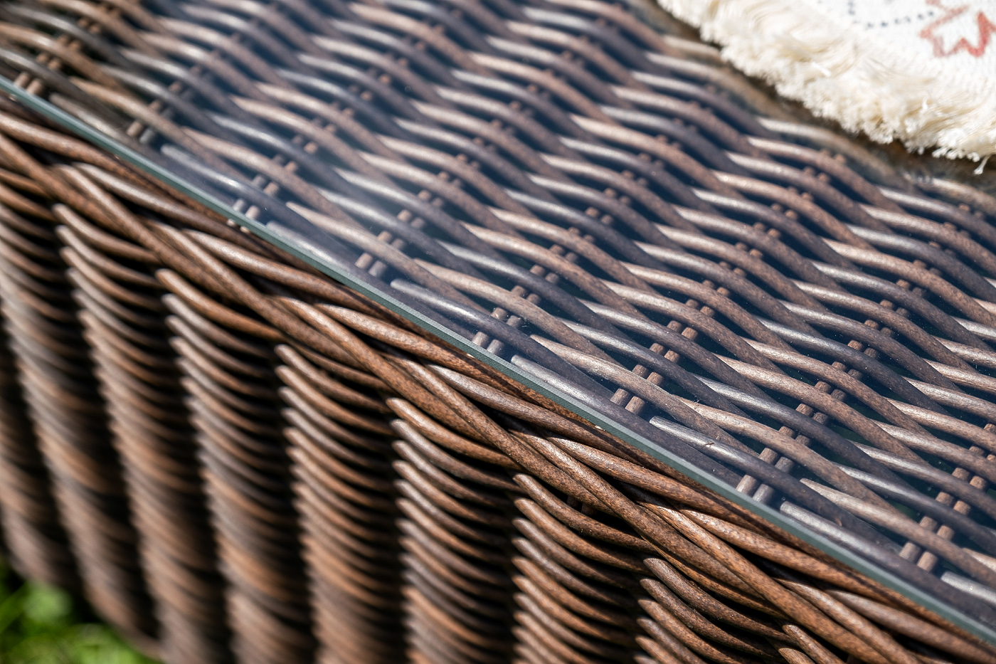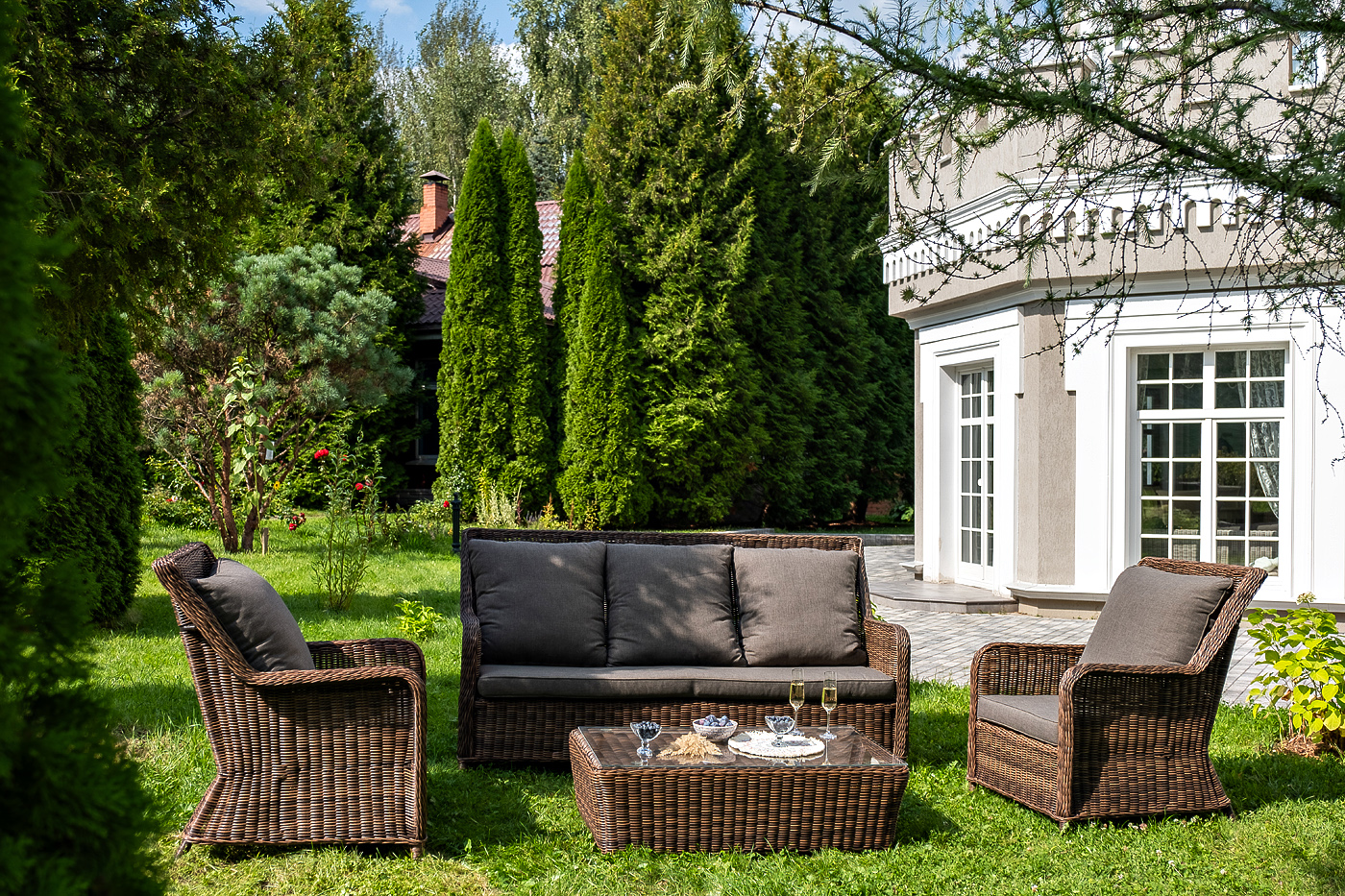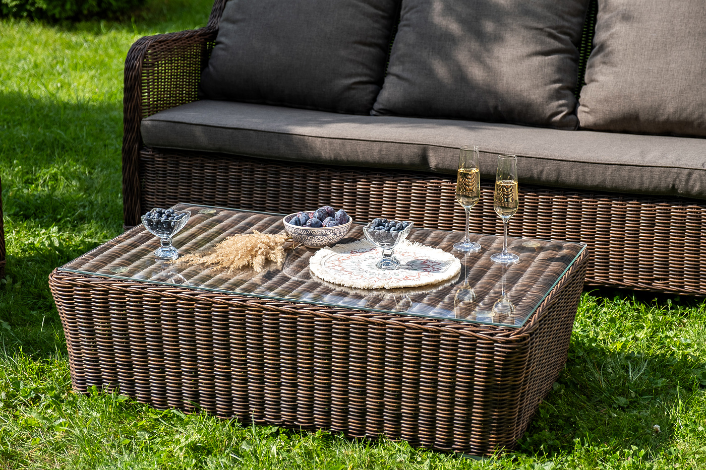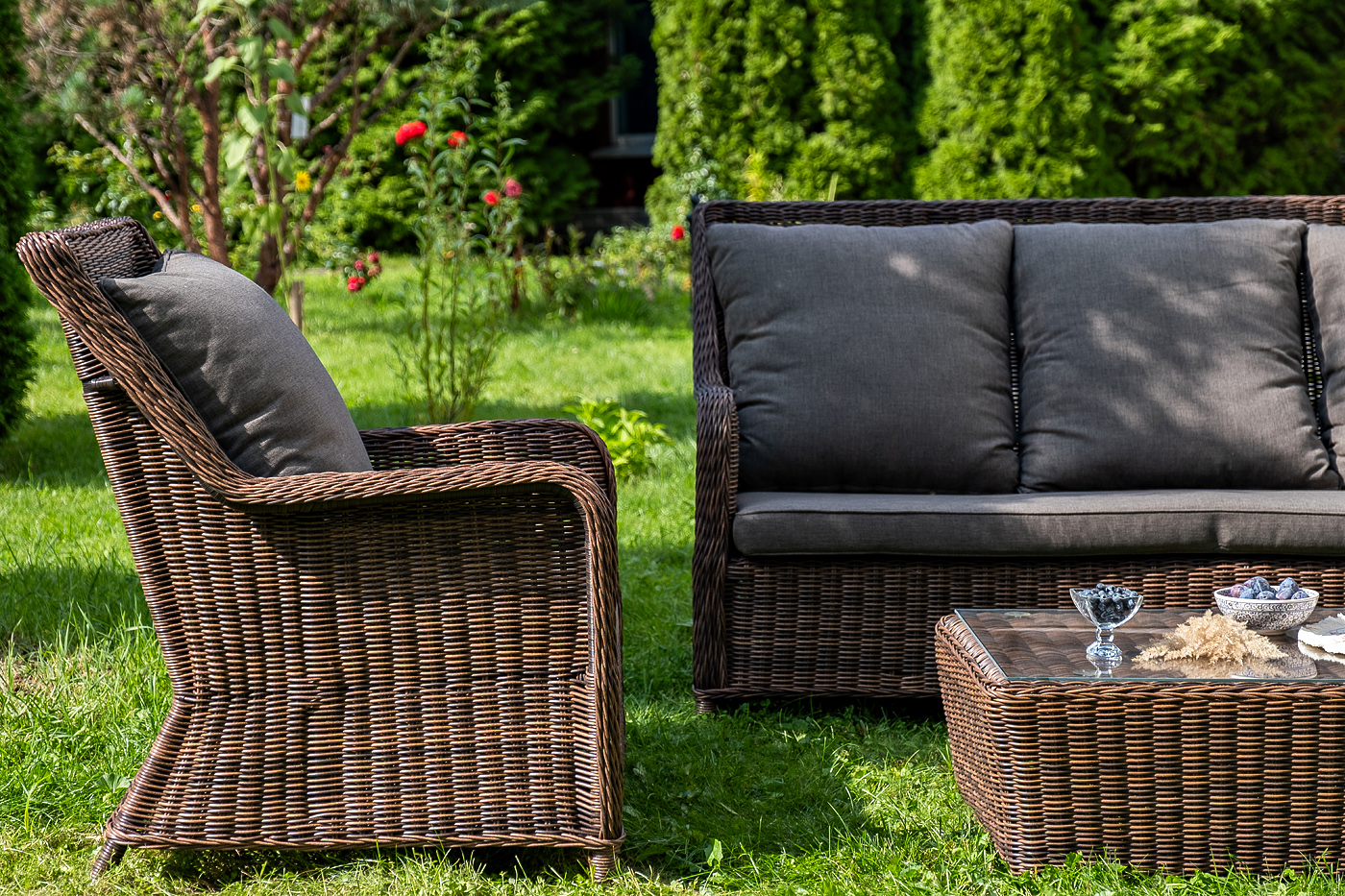 Плетеная мебель дополнена удобными подушками в серых чехлах. При их изготовлении используют полиэстер, плотность – 300гр/м2. Он обрабатывается влагоотталкивающей пропиткой для повышения защитных свойств материала.