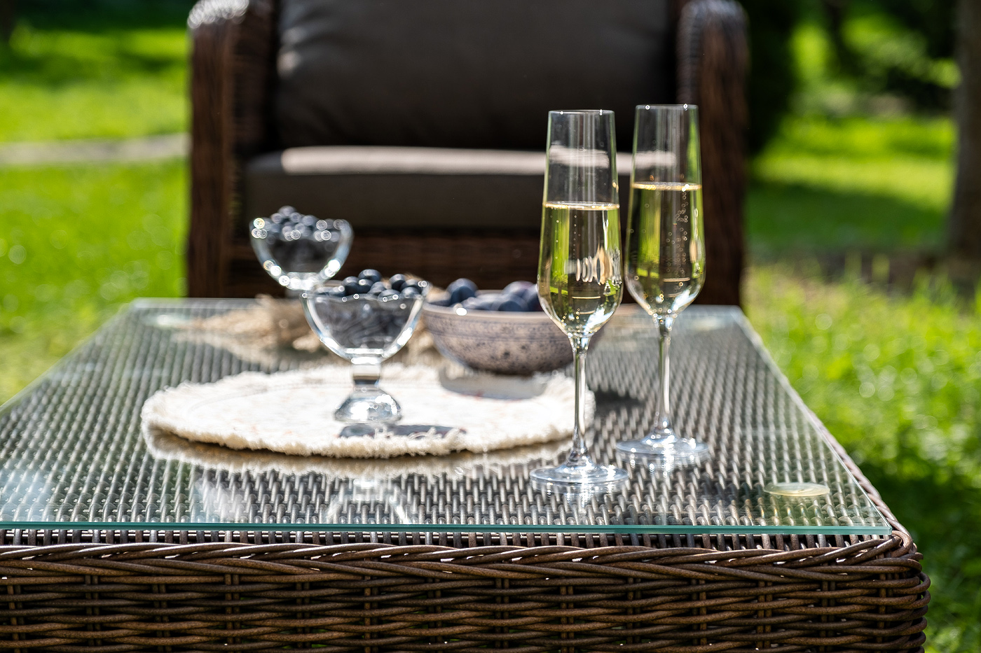 Модели имеют алюминиевый каркас, который оплетен вручную искусственным ротангом натурального коричневого цвета.