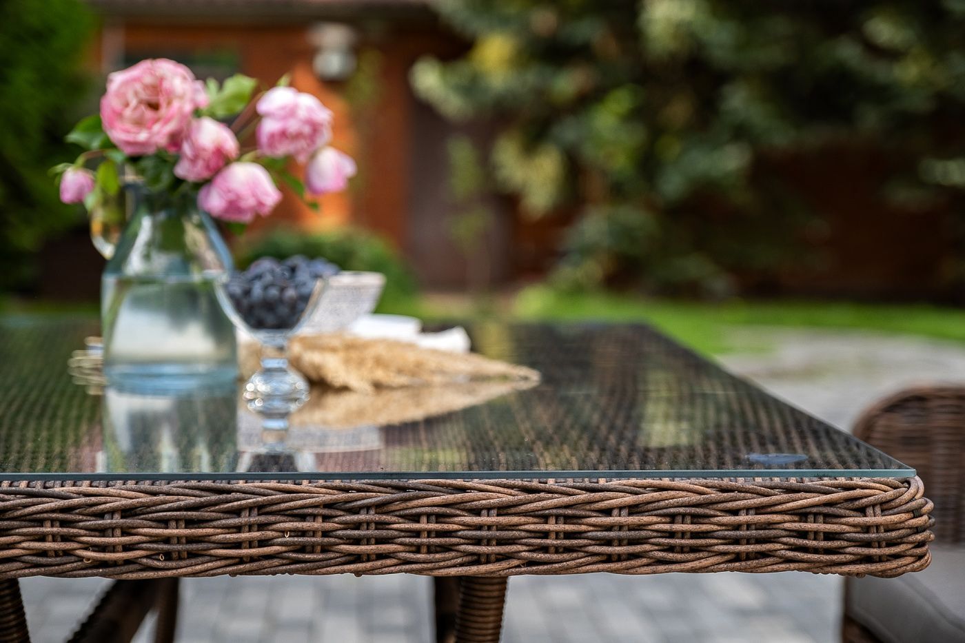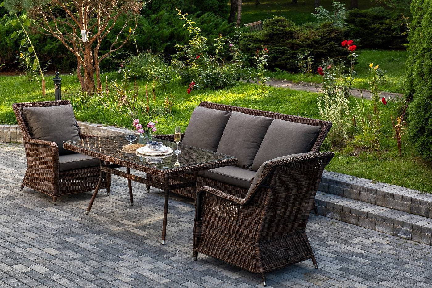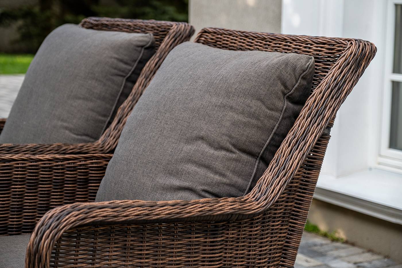 Каркас мебели алюминиевый. Он оформлен с помощью искусственного ротанга круглой формы и был оплетен ручным способом. Цвет плетение - коричневый.