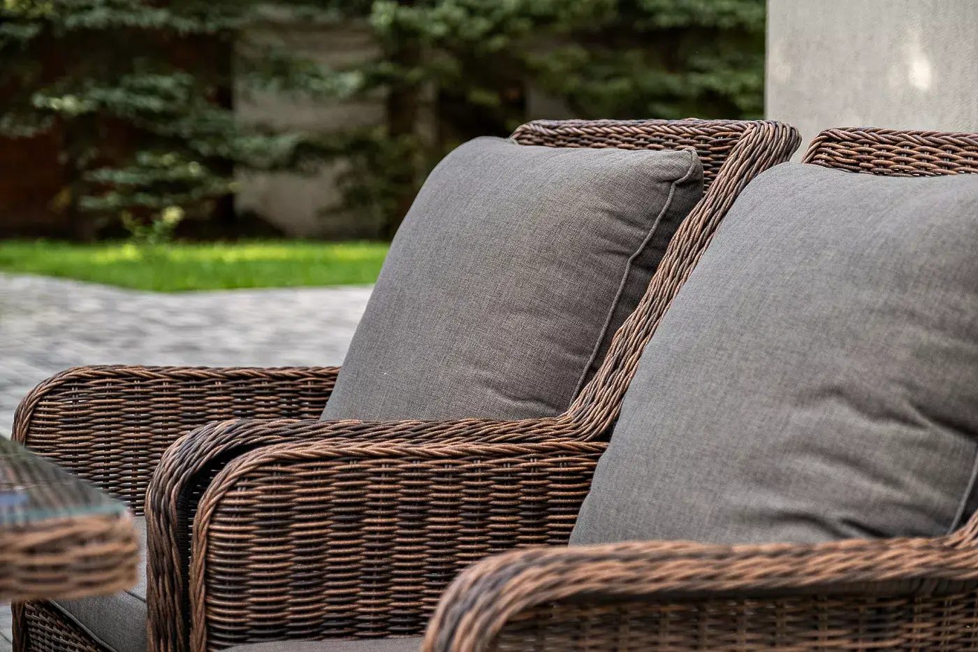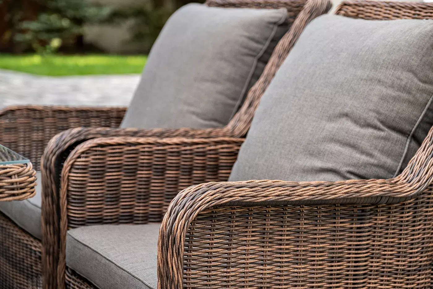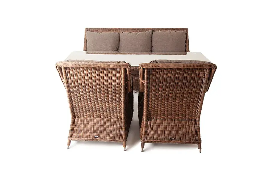 Каркас мебели алюминиевый. Он оформлен с помощью искусственного ротанга круглой формы и был оплетен ручным способом. Цвет плетение - коричневый.