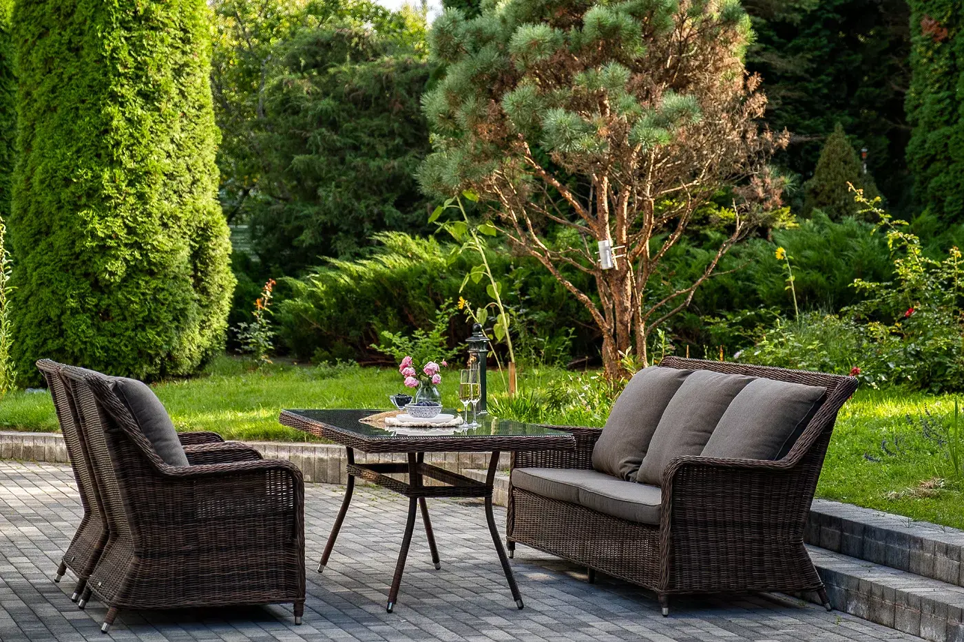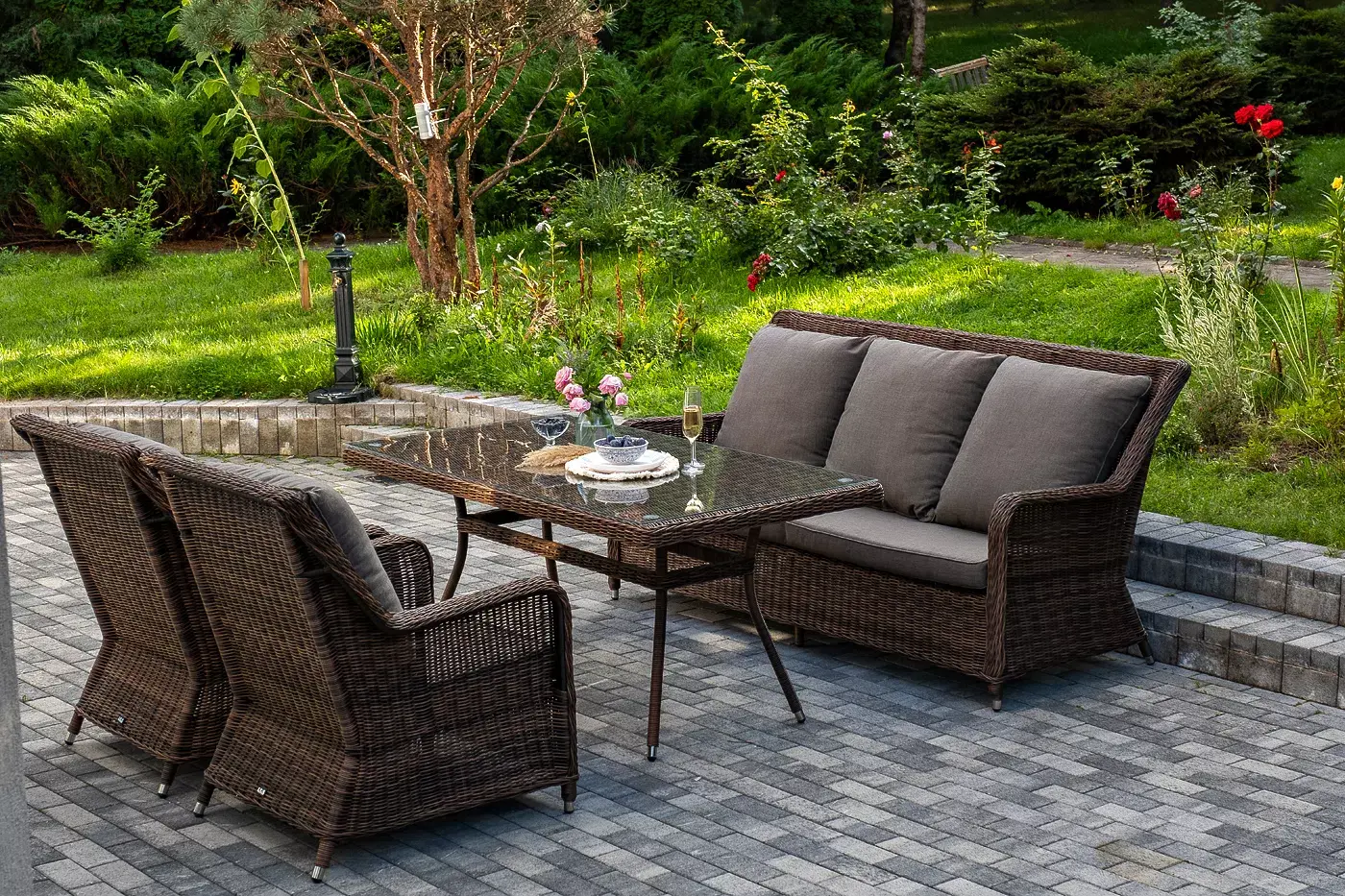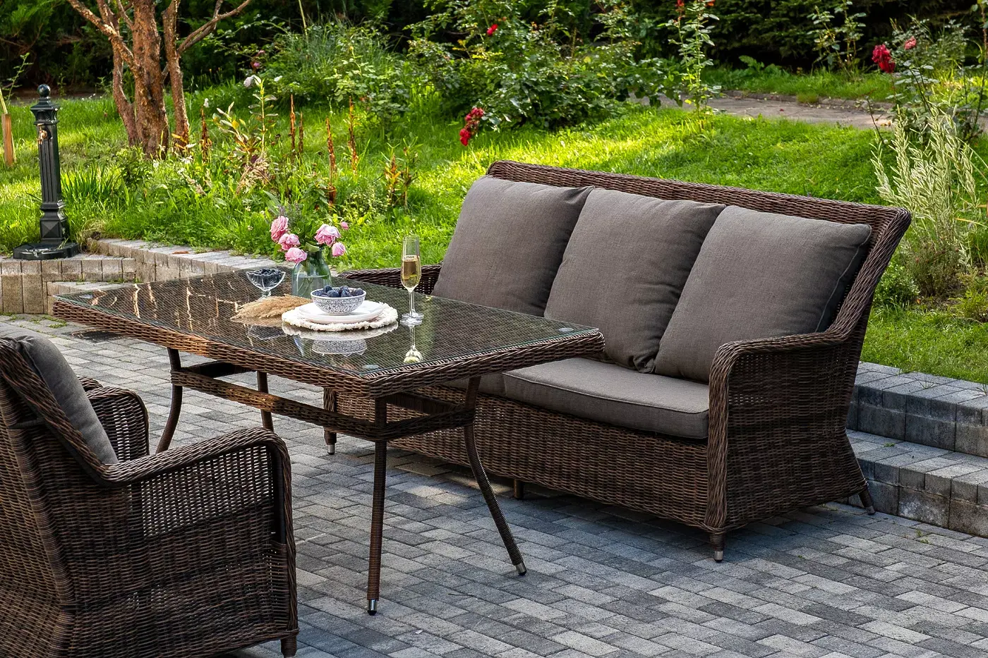 Каркас мебели алюминиевый. Он оформлен с помощью искусственного ротанга круглой формы и был оплетен ручным способом. Цвет плетение - коричневый.