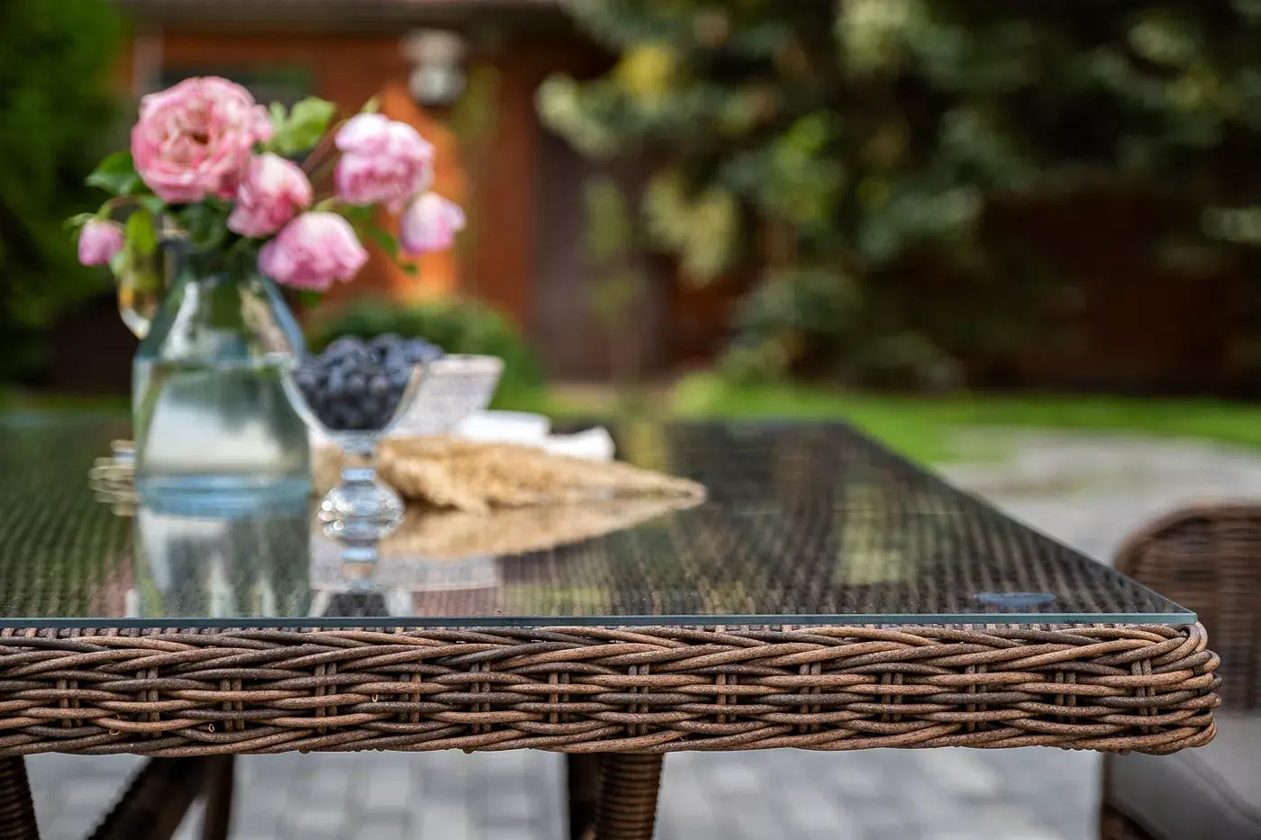 Столешница обеденного стола изготовлена из высокопрочного закаленного стекла, которое по стандартам используется в пищевой промышленности.