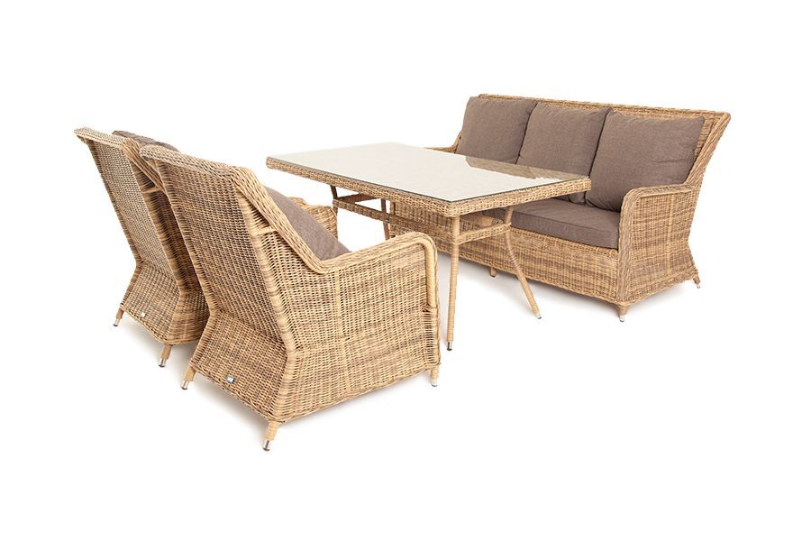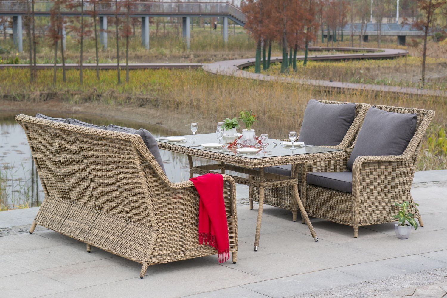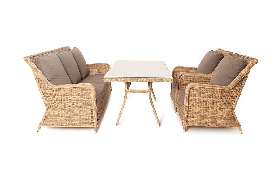 Каркас мебели алюминиевый. Он оформлен с помощью искусственного ротанга круглой формы и был оплетен ручным способом. Цвет плетение - соломенный.