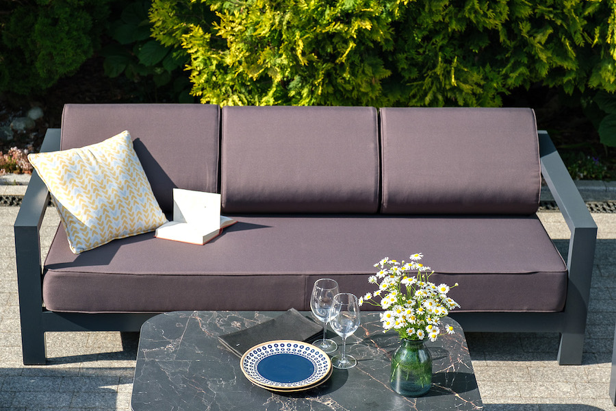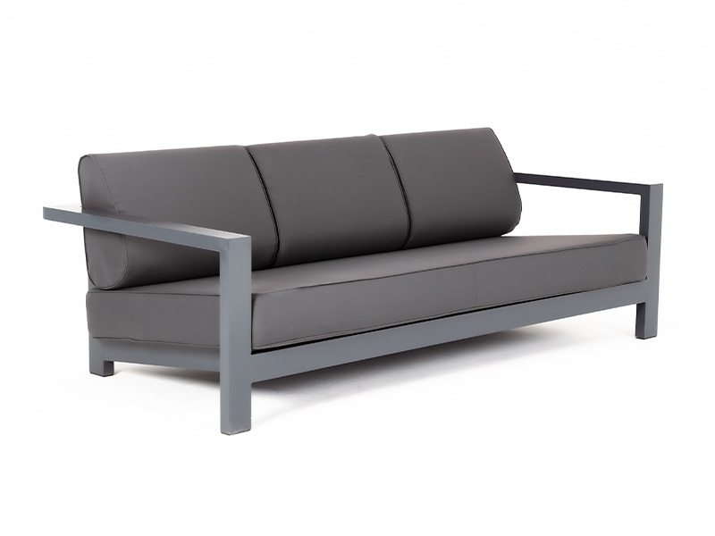 Стильный трехместный диван «Гранада» для обустройства зоны отдыха на балконе, в кафе или летней веранде. Каркас изготовлен из высокопрочного алюминия темно-серого цвета.