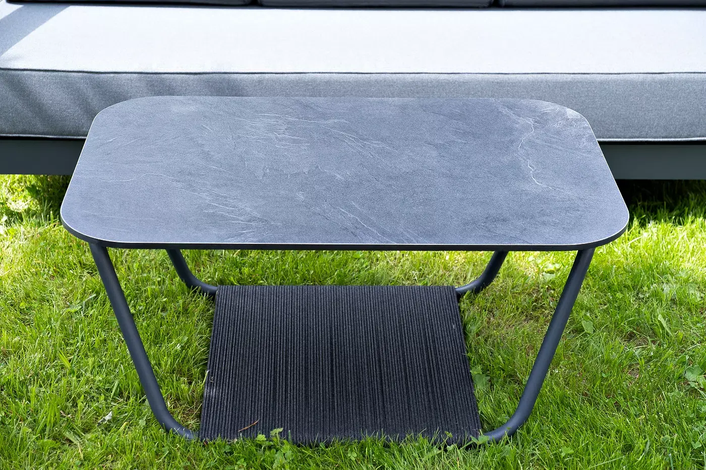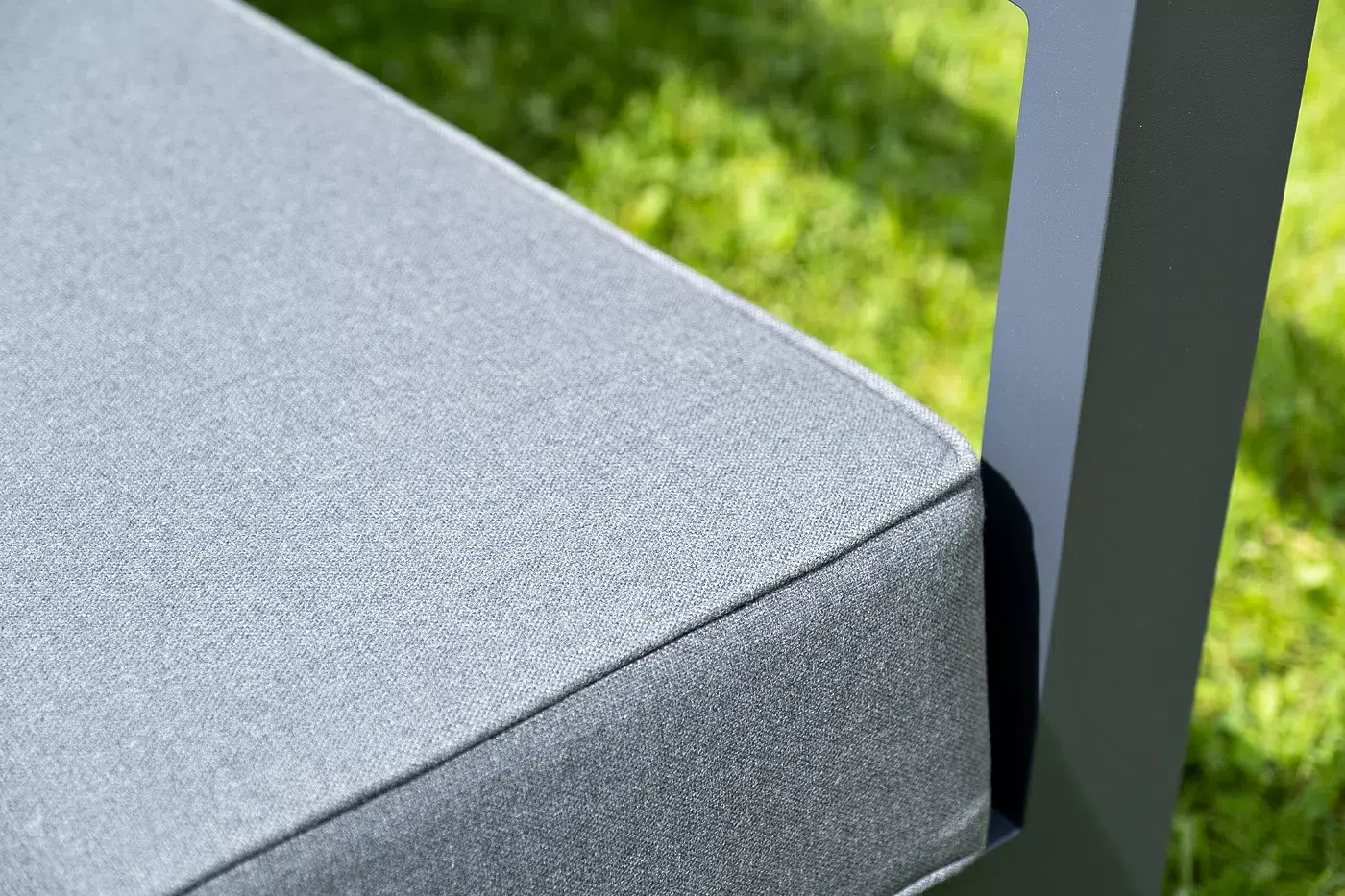 Каркас мебели выполнен из алюминиевого профиля, окрашенного в темно-серый (RAL7024) цвет. Дополняют комплект подушки со съёмными чехлами.
