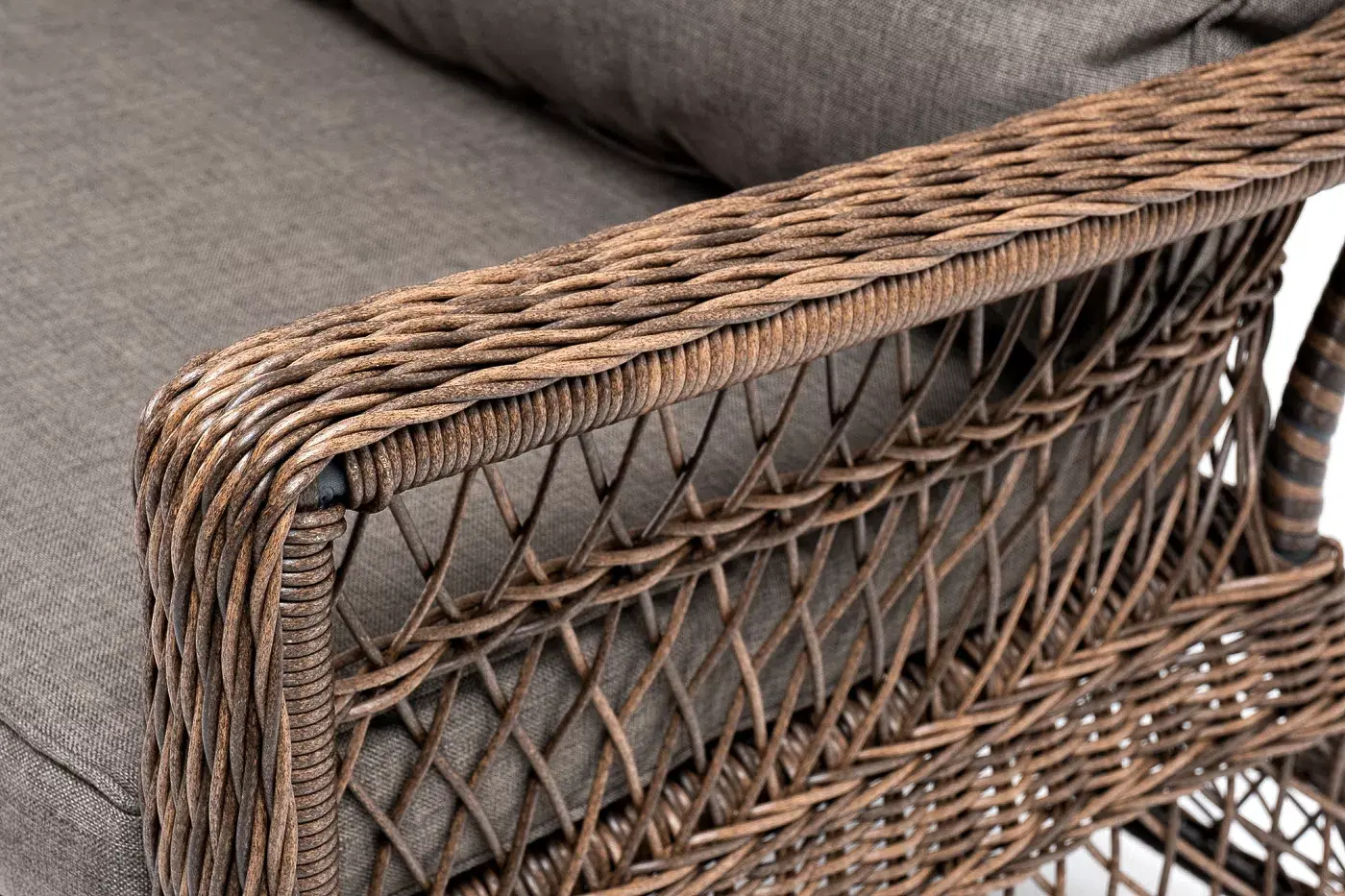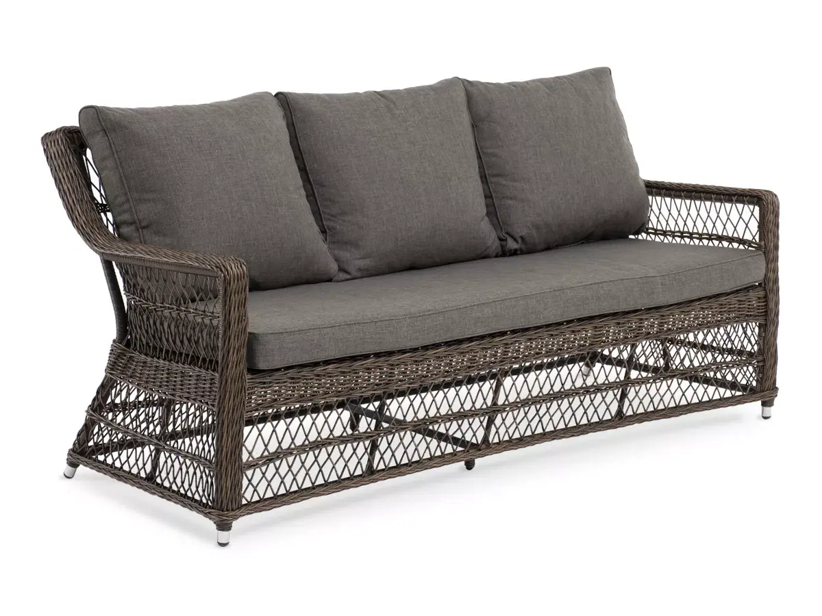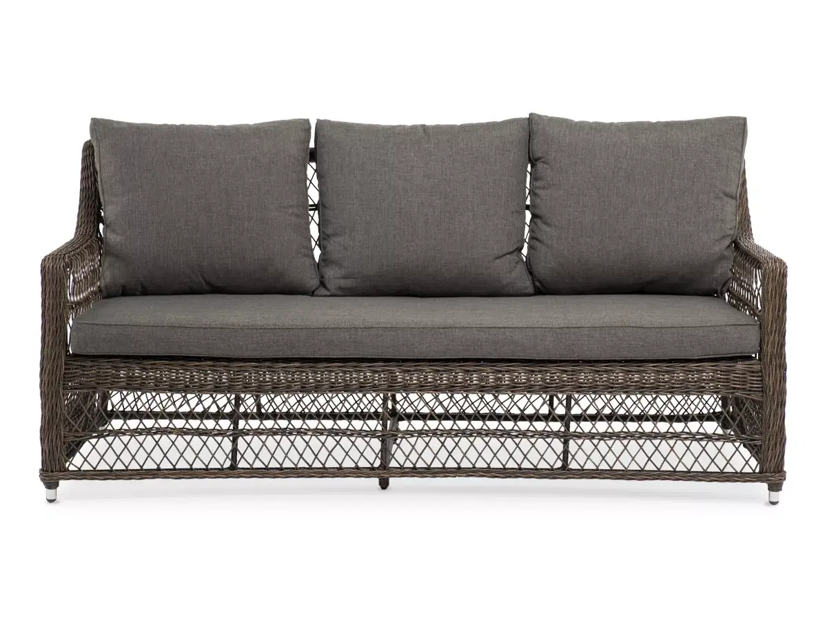 Модель выполнена с помощью ручного круглого плетения из искусственного ротанга. Трехместный диван представлен в коричневом цвете.