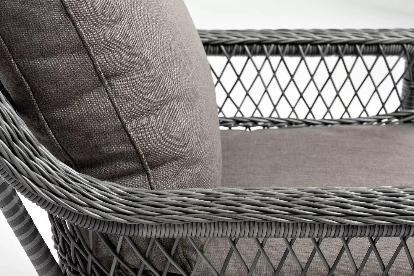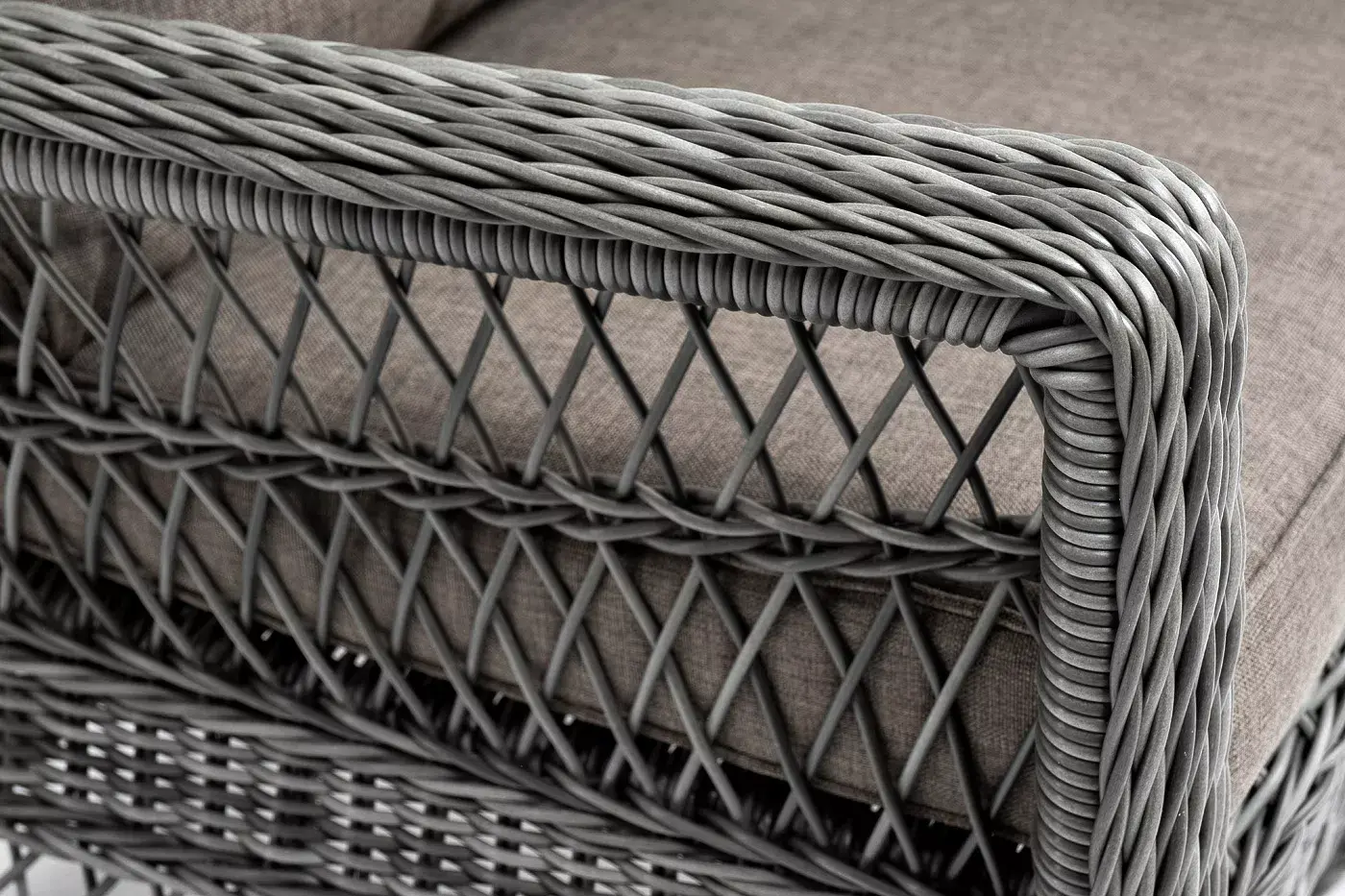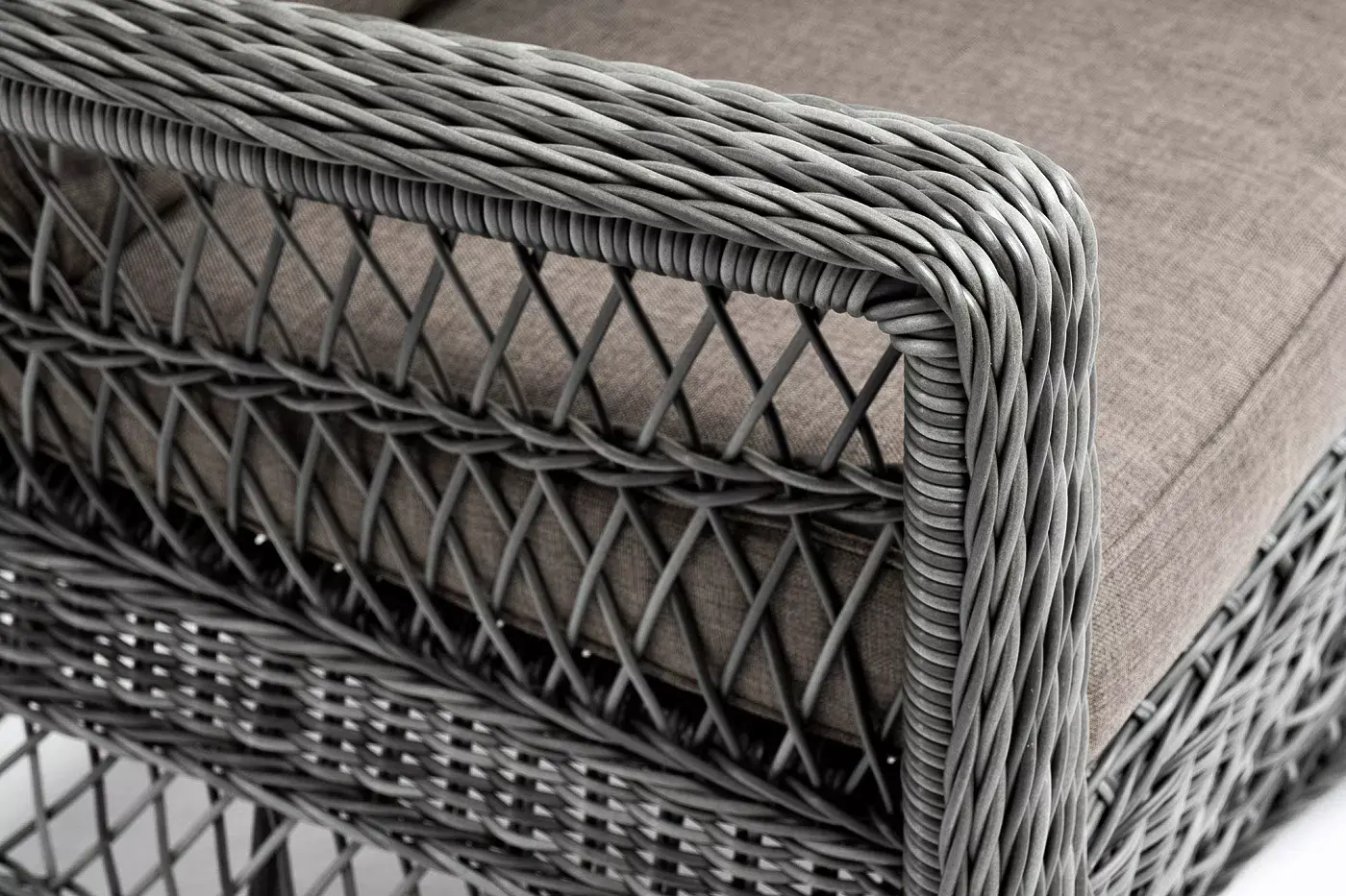Укомплектовано плетеное кресло удобными мягкими подушками, одна из которых располагается в области спинки. Они выполнены в сером оттенке. При пошиве тканевых изделий используется полиэстер, плотностью 300гр/м2. Он в обязательном порядке проходит обработку влагоотталкивающей пропиткой.