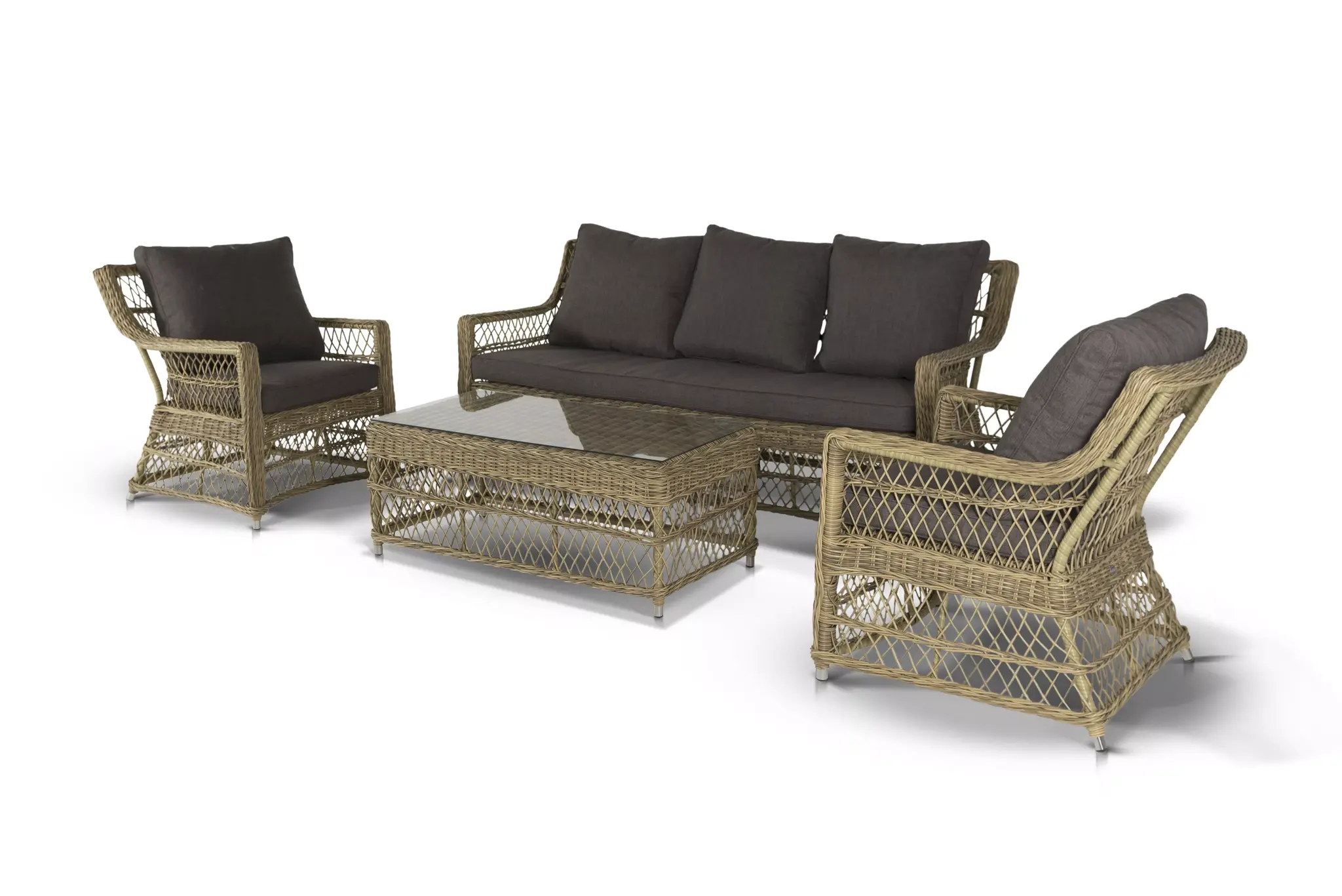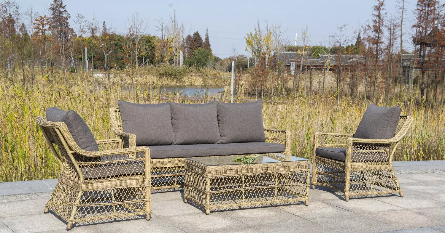 Укомплектовано плетеное кресло удобными мягкими подушками, одна из которых располагается в области спинки. Они выполнены в серо-коричневом оттенке. При пошиве тканевых изделий используется полиэстер, плотностью 230гр/м2. Он в обязательном порядке проходит обработку влагоотталкивающей пропиткой.