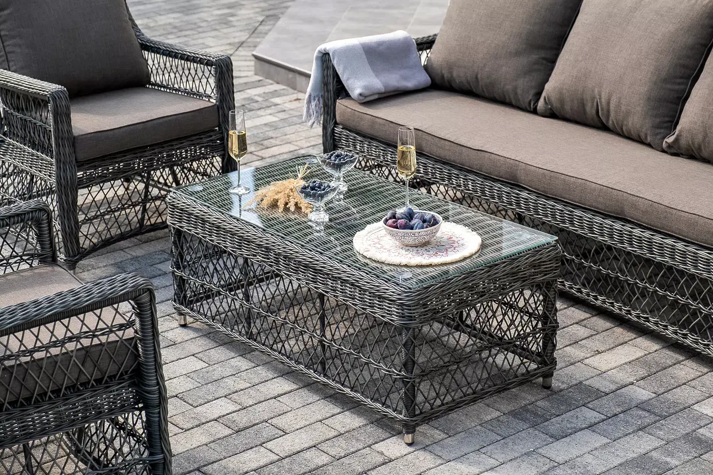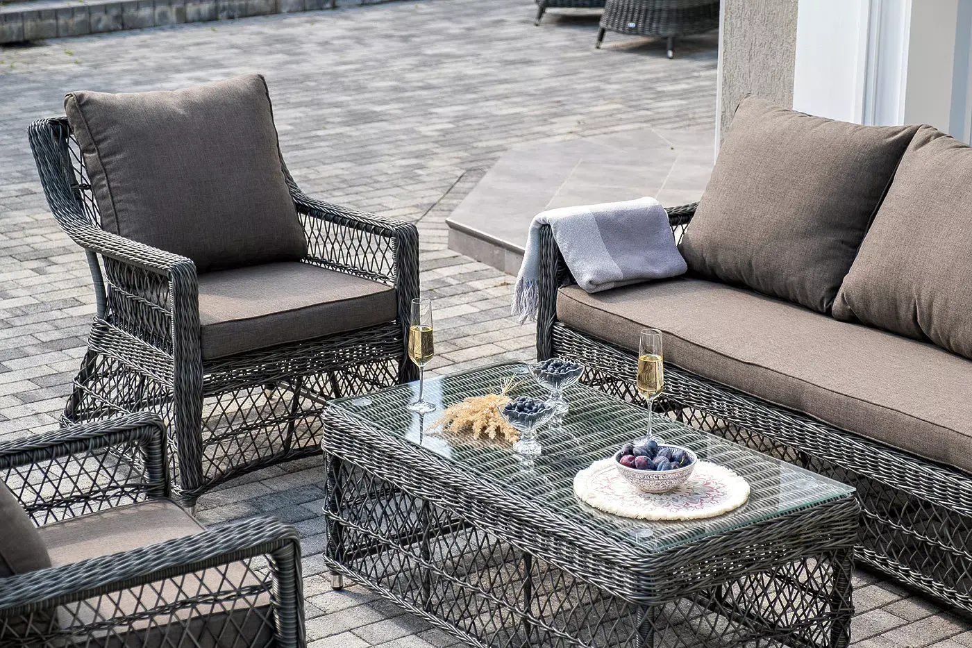 Уличная мебель имеет алюминиевый каркас с ручным плетением из искусственного ротанга в цвете "графит". Предусмотрены мягкие подушки из полиэстера серого цвета с плотностью 300гр/м2. Они имеет влагоотталкивающую пропитку. Рабочая поверхность столика изготовлена из закаленного стекла толщиной 5 мм.