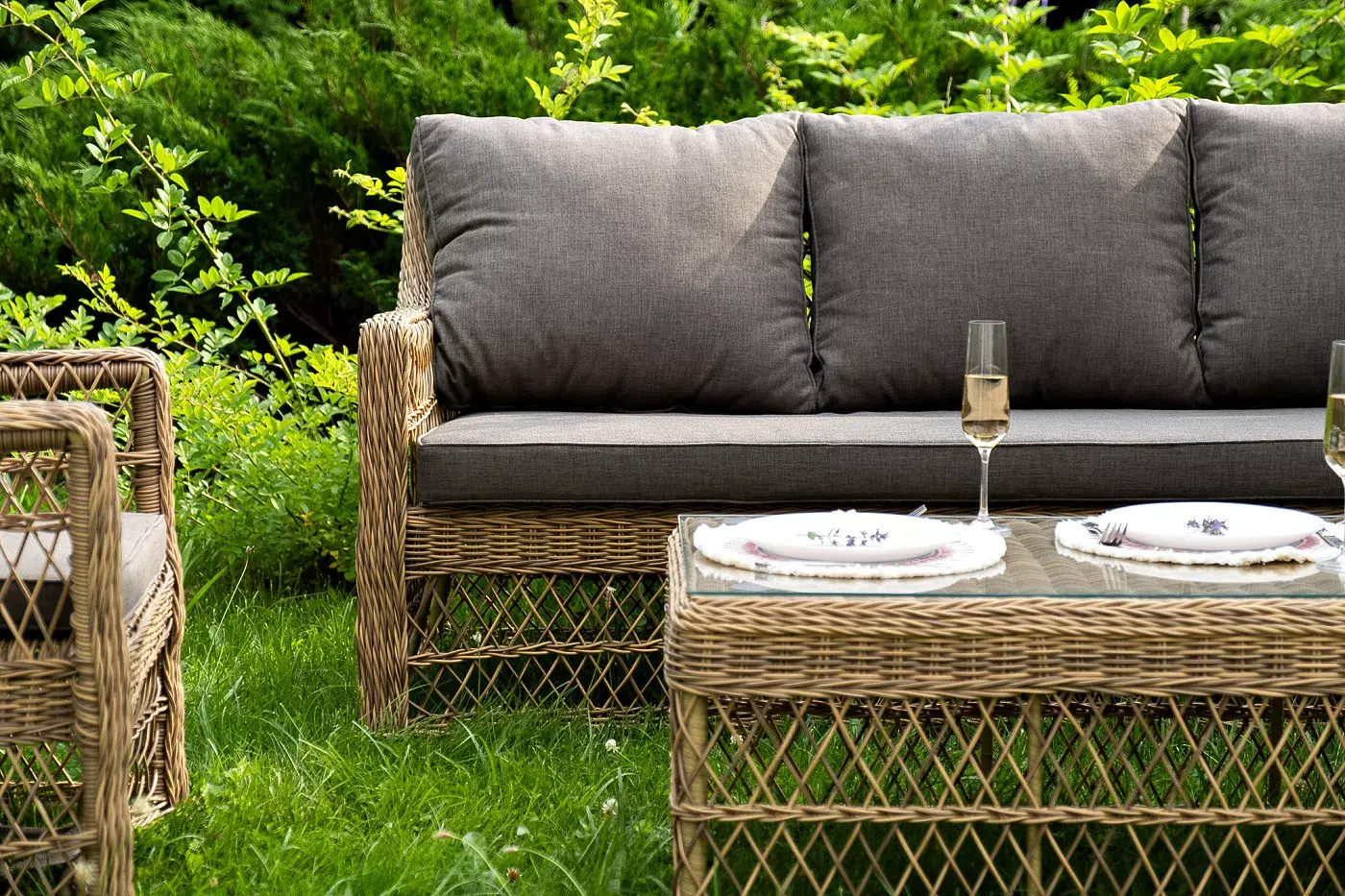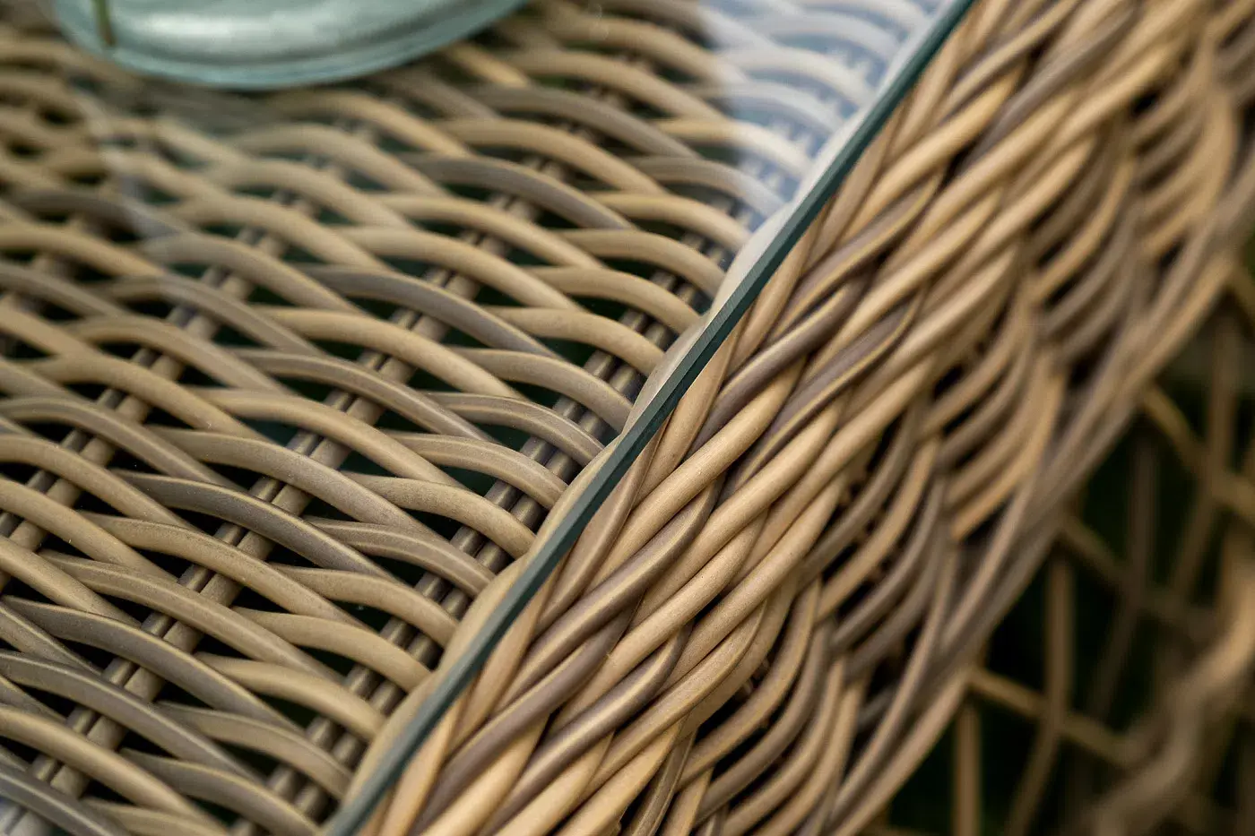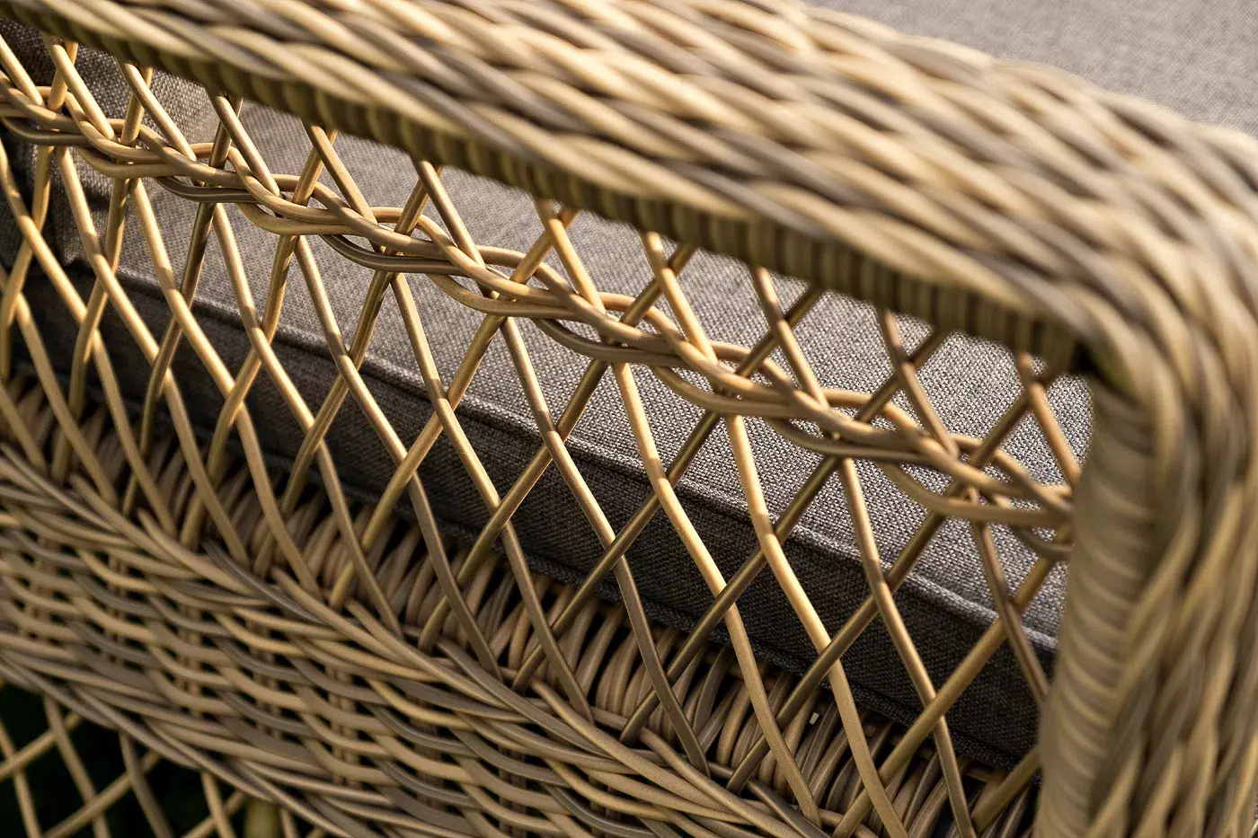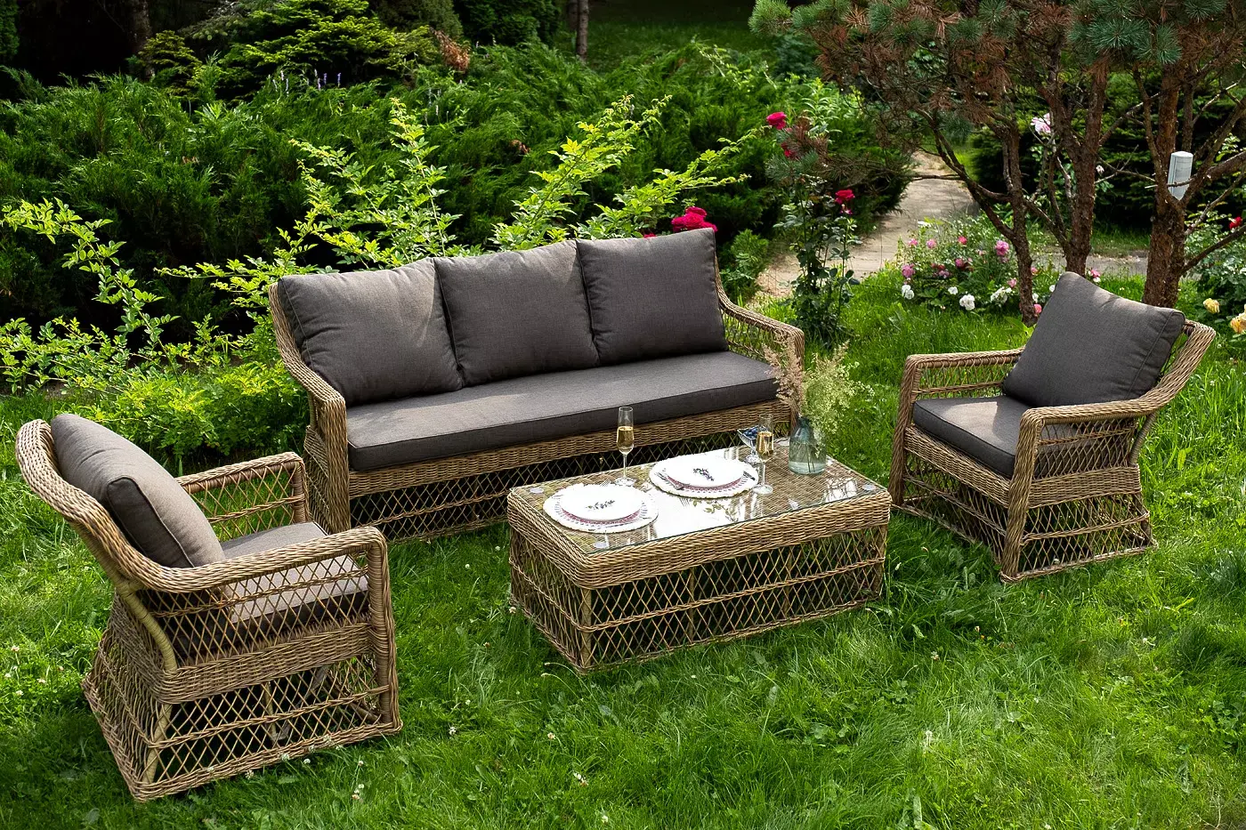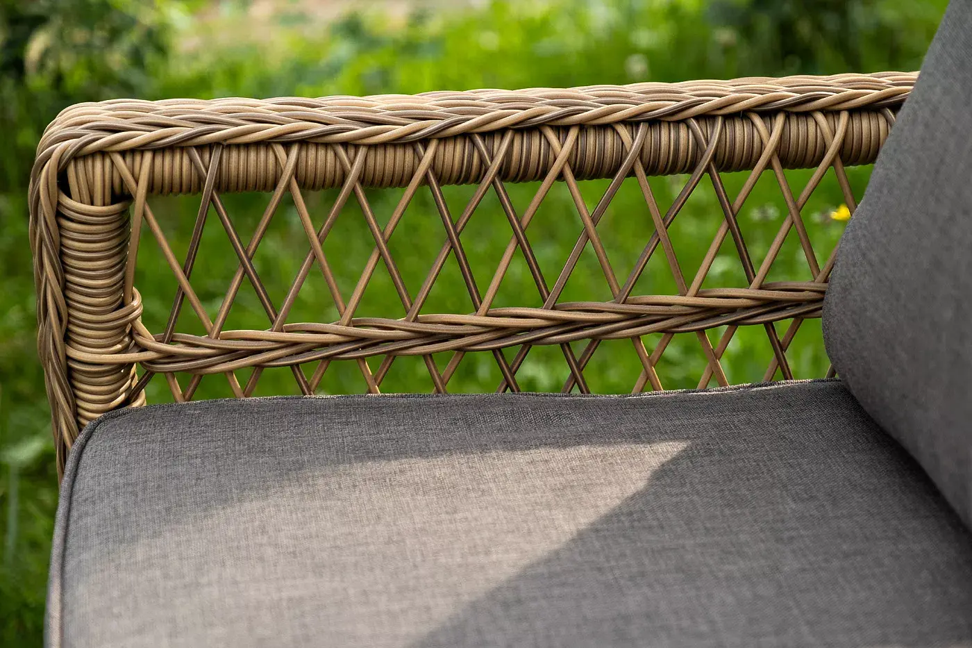 Уличная мебель имеет алюминиевый каркас. В качестве декоративного элемента предлагается ручное плетение, сделанное из соломенного искусственного ротанга. Предусмотрены мягкие подушки из полиэстера серого цвета с плотностью 300гр/м2. Они имеет влагоотталкивающую пропитку. Рабочая поверхность столика изготовлена из закаленного стекла толщиной 5 мм.