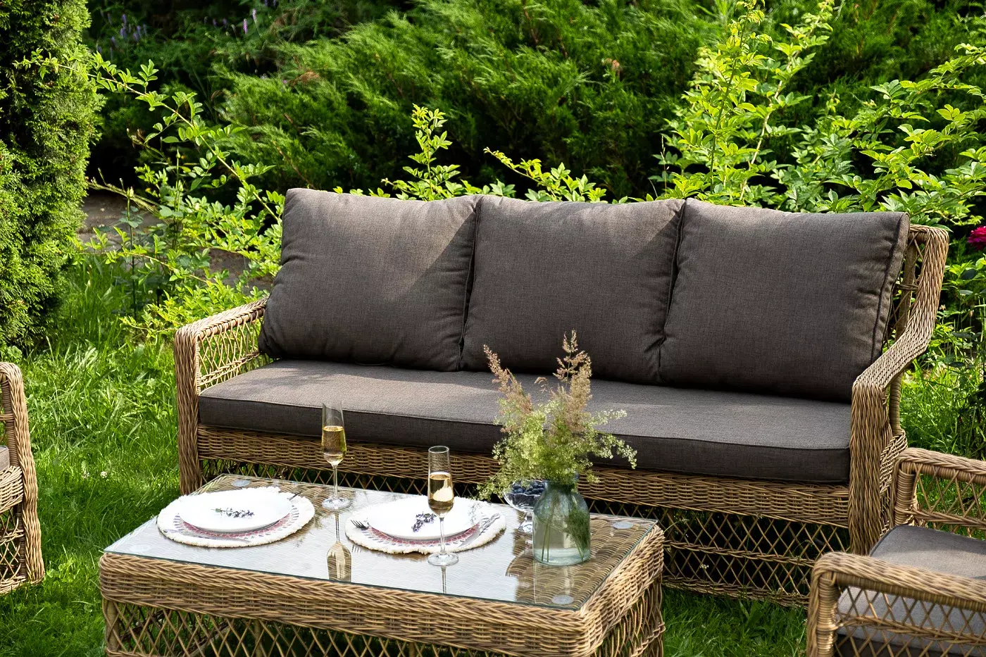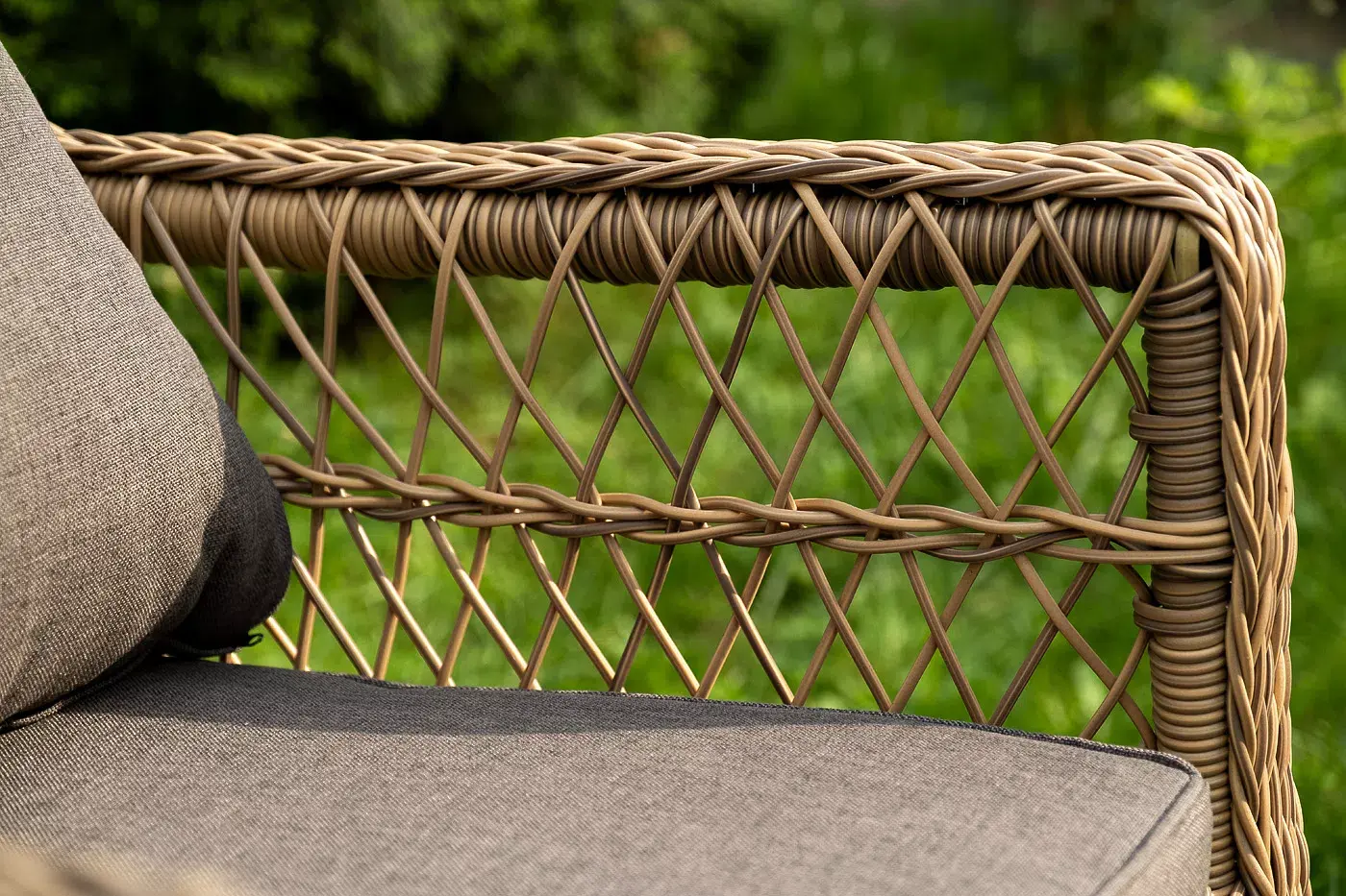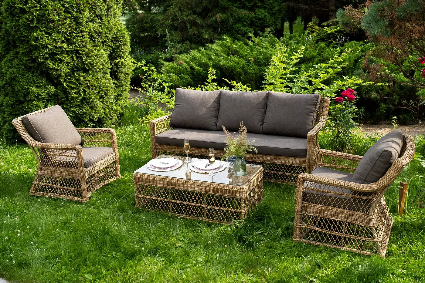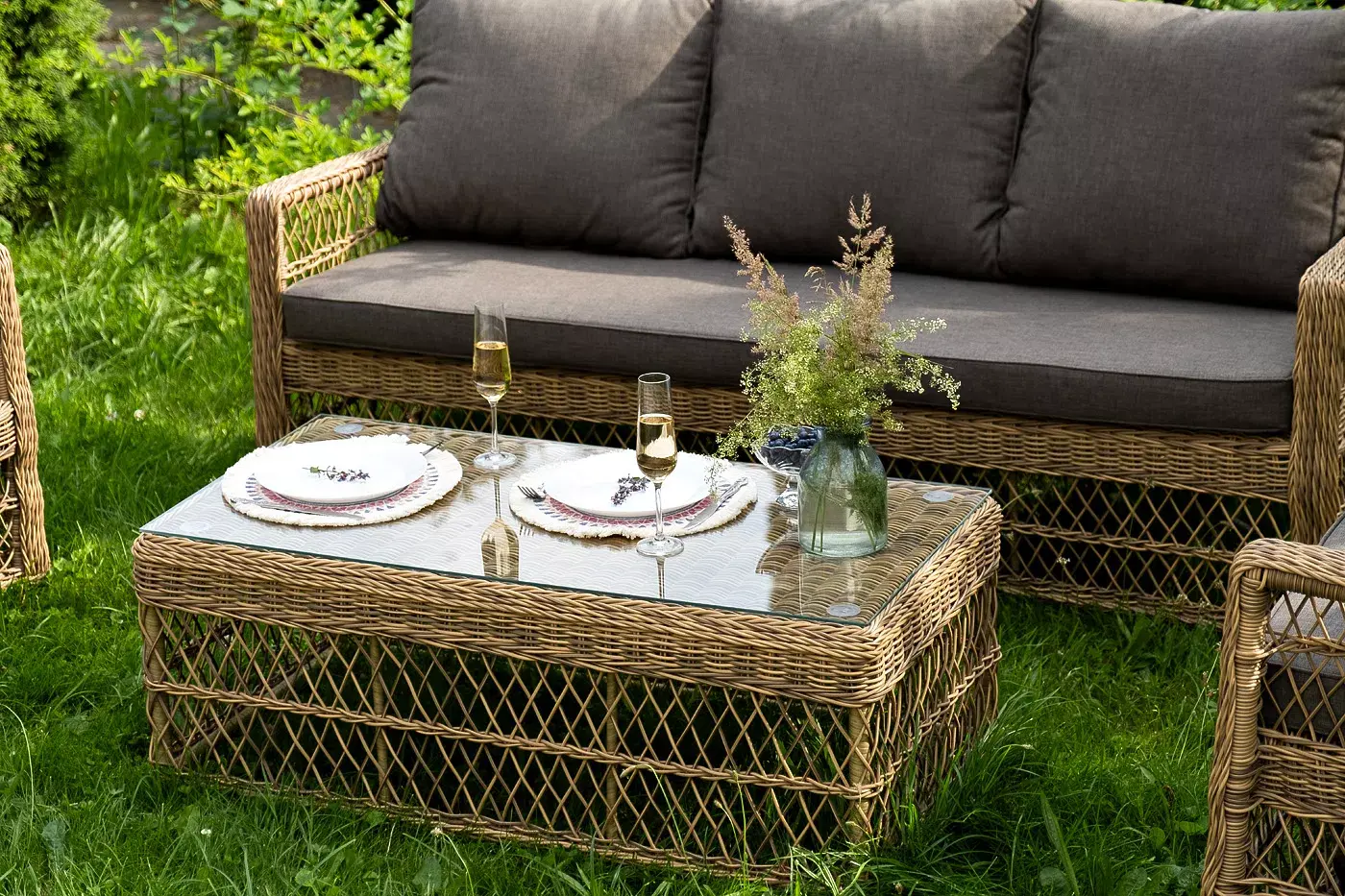 Уличная мебель имеет алюминиевый каркас. В качестве декоративного элемента предлагается ручное плетение, сделанное из соломенного искусственного ротанга. Предусмотрены мягкие подушки из полиэстера серого цвета с плотностью 300гр/м2. Они имеет влагоотталкивающую пропитку. Рабочая поверхность столика изготовлена из закаленного стекла толщиной 5 мм.