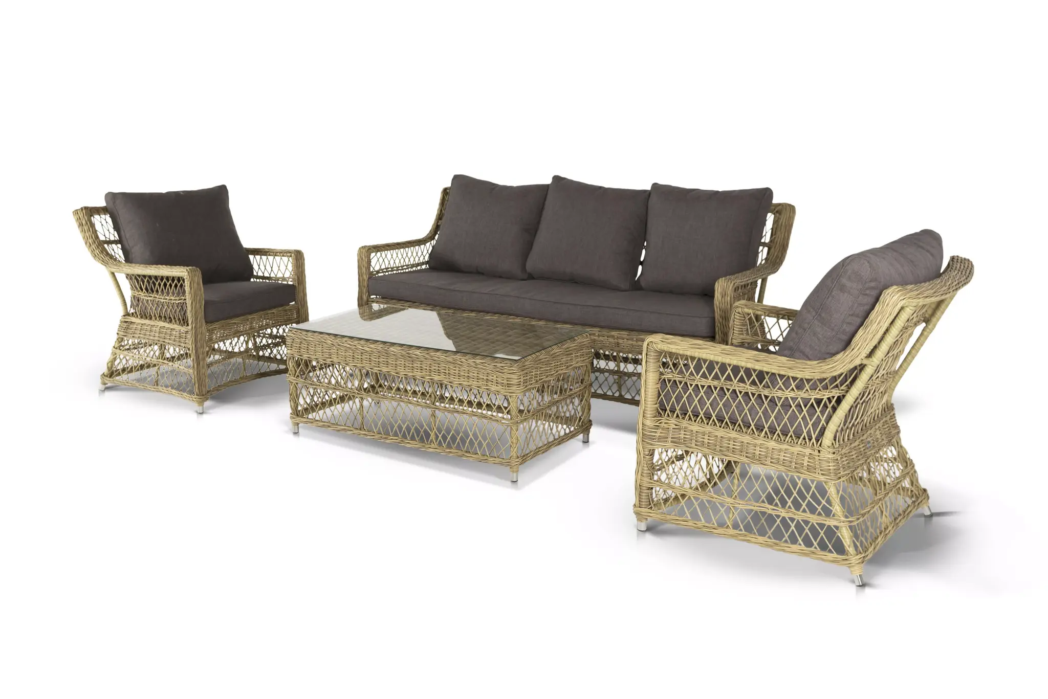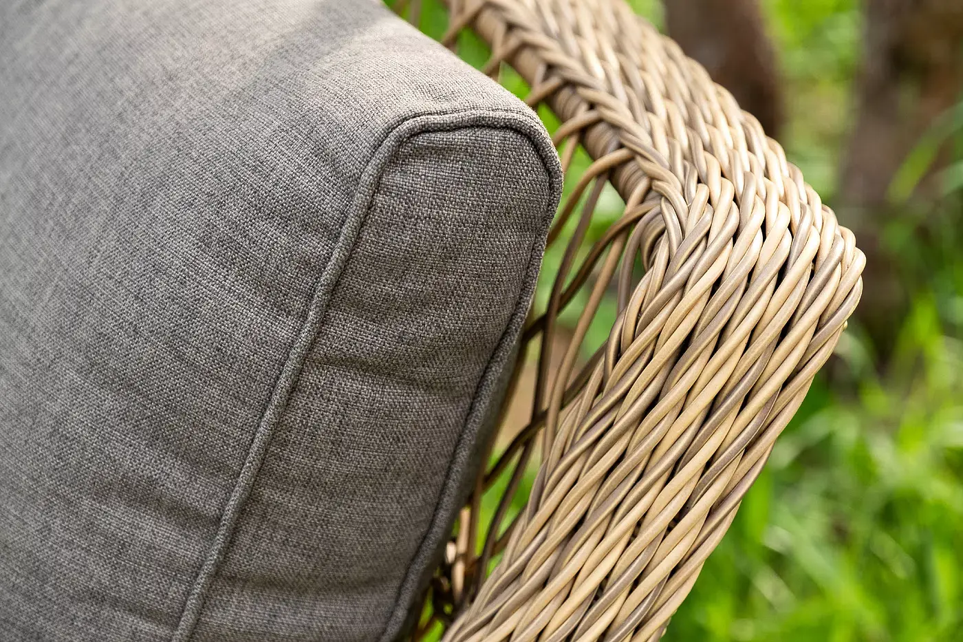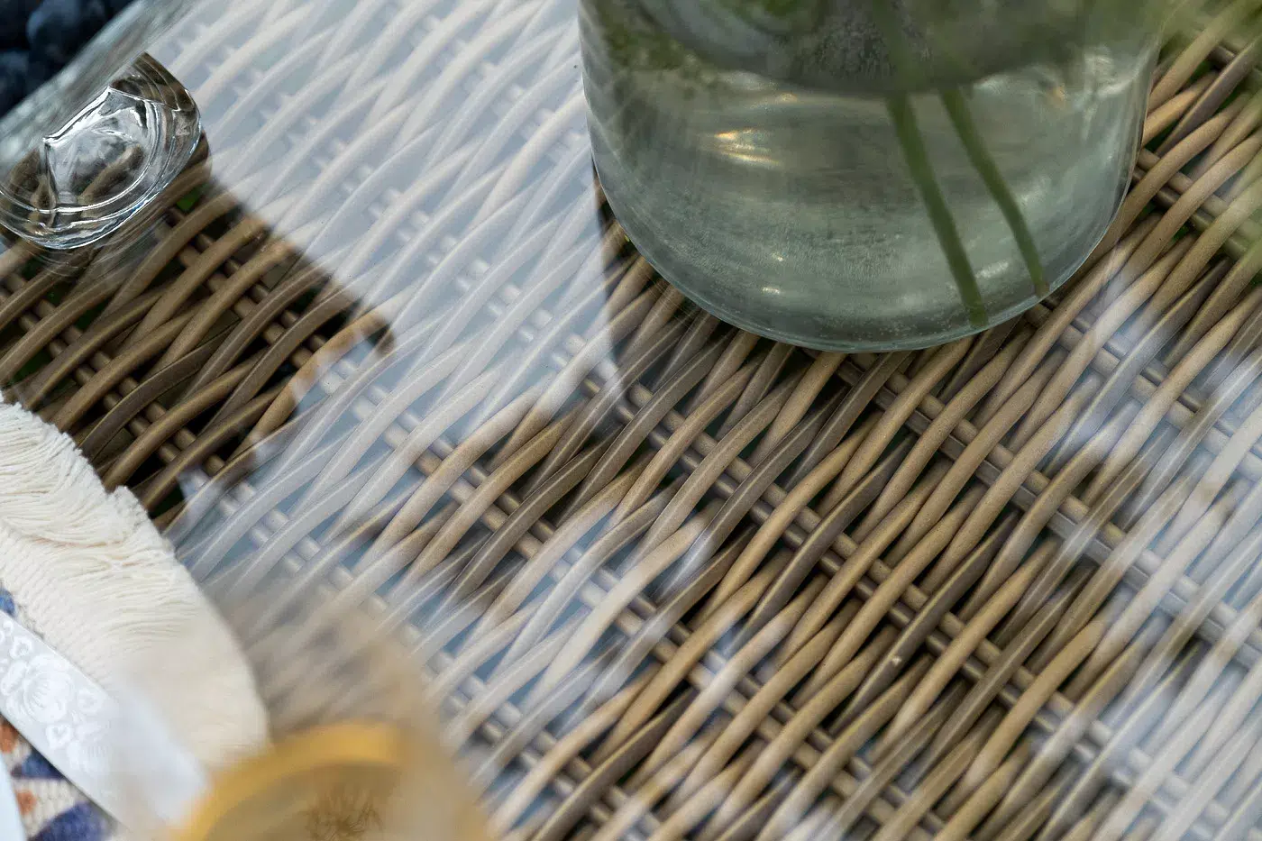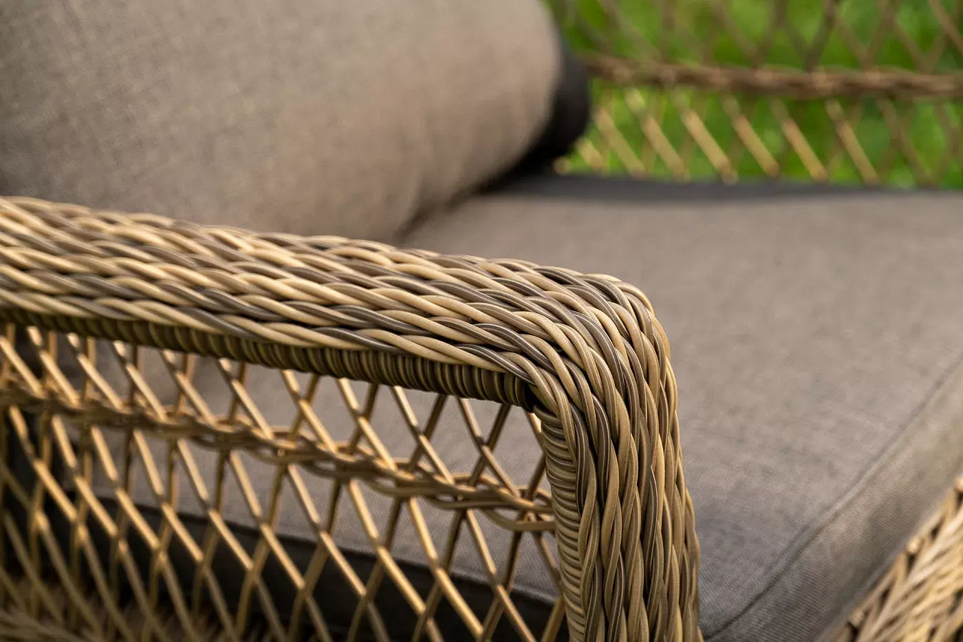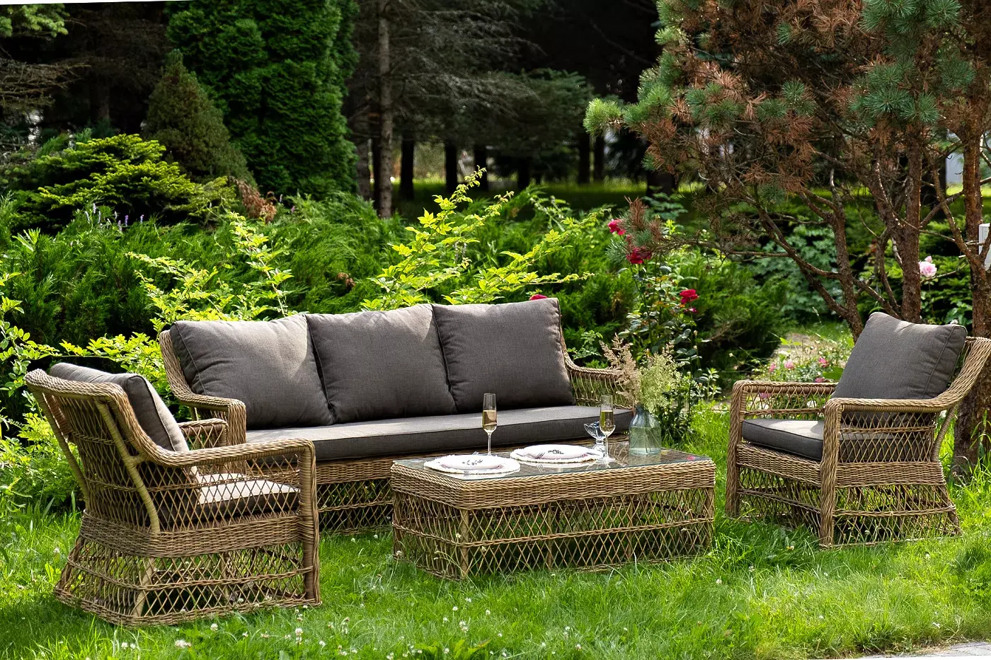 Уличная мебель имеет алюминиевый каркас. В качестве декоративного элемента предлагается ручное плетение, сделанное из соломенного искусственного ротанга. Предусмотрены мягкие подушки из полиэстера серого цвета с плотностью 300гр/м2. Они имеет влагоотталкивающую пропитку. Рабочая поверхность столика изготовлена из закаленного стекла толщиной 5 мм.